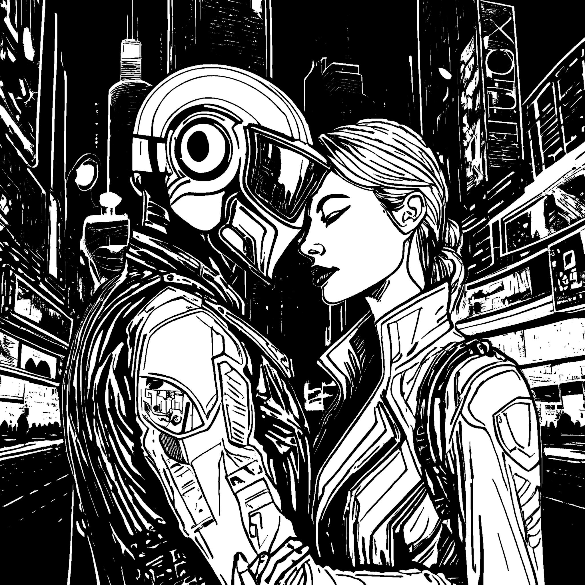 IN A FURIOUS FINAL STAND, CARREW CONFRONTED THE FACILITY’S ENFORCERS, HIS BODY A DEADLY WEAPON FUELED BY LOVE. THE BATTLE RAGED UNTIL SILENCE FELL. WITH THE LAST OUNCE OF ENERGY, HE DISABLED THE FINAL THREATS, SECURING THEIR ESCAPE. AMONG THE WRECKAGE, HE TURNED TO NOVA, THEIR EYES LOCKING IN A MOMENT SUSPENDED IN TIME. THEY WERE NO LONGER A SOLDIER AND A SCIENTIST. THEY WERE SIMPLY TWO HEARTS BEATING AGAINST THE ODDS, TWO SOULS BOUND BY AN UNYIELDING BOND. AS THE SUN ROSE, THEY FLED THE REMNANTS OF THE LIFE THAT SOUGHT TO TEAR THEM APART. BEYOND THE HORIZON, THEY COULD BEGIN ANEW, THEIR HEARTS IGNITING WITH NEWFOUND STRENGTH. NO LONGER MERELY HALF-HUMAN, HALF-ROBOT; THEY WERE WHOLE, FORGED TOGETHER IN LOVE AND DEFIANCE. TOGETHER, THEY WOULD FACE WHATEVER CAME NEXT, NO LONGER UNDER THE GOVERNMENT’S THUMB, BUT AS ARCHITECTS OF THEIR OWN DESTINY.