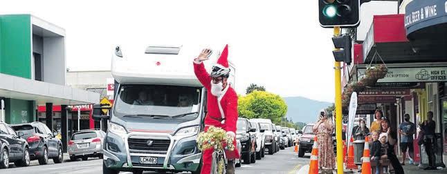 Cycling Santa Claus aka World Travellers Motueka’s Jeremy Matthews was the first to go through the new lights in December.