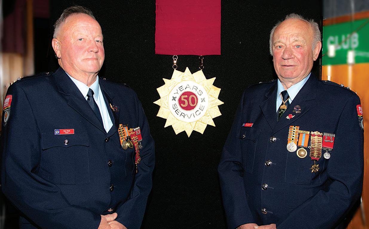 Motueka volunteer fire fighters Derek ‘Woody’ Woodcock and Ron Heal received their 50 year service
