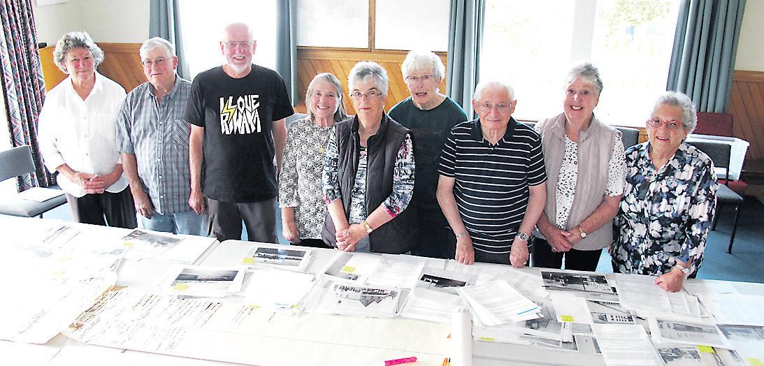 Motueka Historical Association members pore over High Street information and photographs, from left, Eileen Brooks, John Drummond, Peter Hansen, Carol Dawber (commissioned historian and writer), Maureen Dabinett, Jan Baily, Allan Winslade,