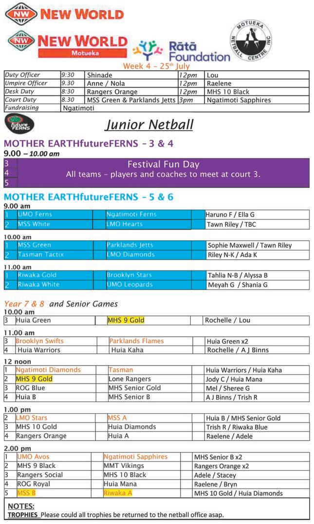 range from high-school age to mothers. They also have three youth teams, one in the 15/16th grade and two in the 13/14th grade. These teams play their games in Motueka, at Memorial and Goodman Parks, Nelson fixtures and travel as far as Golden Bay and Blenheim. The junior club is also well-represented with six teams covering 12th grade down to 7/8th grade, competing