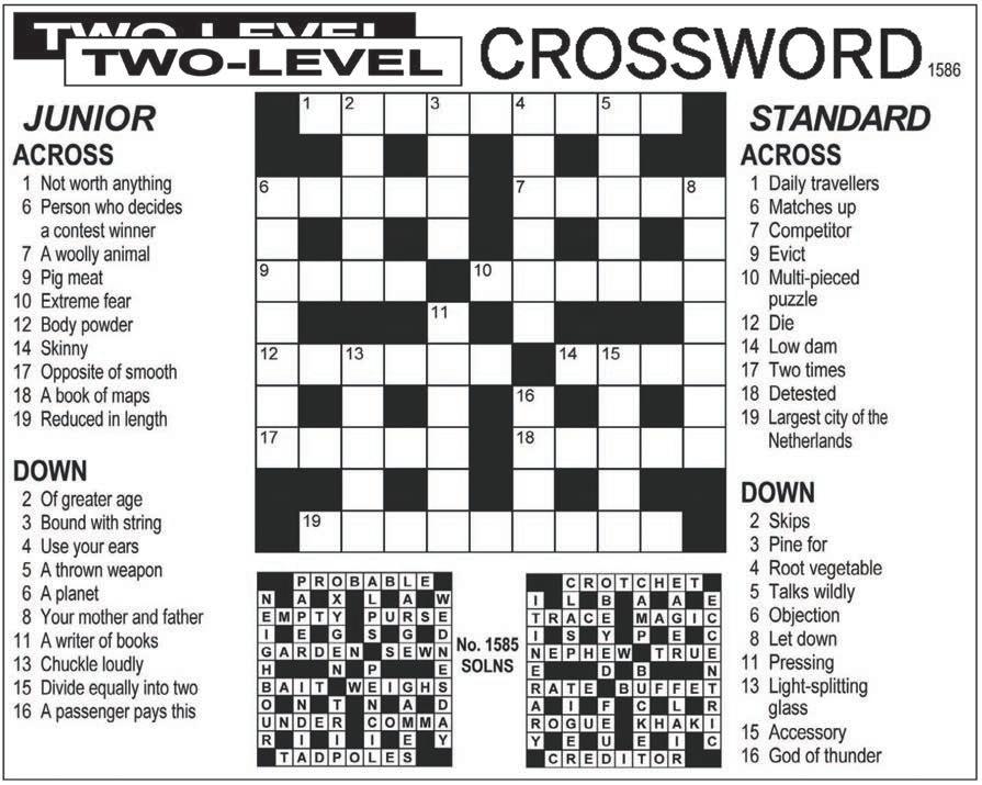 ACROSS 1 A small plate under a cup 3 One of the planets 7 These animals purr 8 A small river 10 Drug users who can't give the drugs up 13 Bothered, pestered 16 Disappear 17 A small round mark 18 Carpenters cut wood with these 19 A funny play or film DOWN 1 Unwell 2 Messy 4 Gorillas 5 The hottest season 6 A train stop 9 Piano player 11 Spoons, forks and ___ 12 Humans 14 Cold winter flakes 15 Remain STANDARD ACROSS 1 Natural fabric 3 Butt 7 Double 8 Covered with trees 10 Liken 13 Flanders flowers 16 Young ferret 17 Margin 18 German river 19 Coiffure DOWN 1 Reductions 2 Camera support 4 Make neat ©CopyrightThePuzzleCompany The Puzzle Company 8 Pohutukawa Cres, Raumati Beach 6010, New Zealand Tel: 04-905 2238 Fax: 04-905 2238 1587 WORTHLESS LIIP JUDGESHEEP UEDTAA PORKTERROR IANE TALCUMTHIN EATFAT ROUGHATLAS GORV SHORTENED COMMUTERS MIUA PAIRSRIVAL RTSNEO OUSTJIGSAW TUPE EXPIREWEIR SRGTXE TWICEHATED SNOR AMSTERDAM 12345 6 78 9 10 1112 13 1415 1617 1819 CROSSWORDNo.