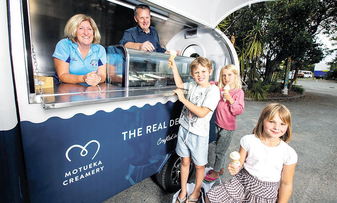 Numerous locals and holidaymakers took a break from their grocery shopping at New World in Motueka to enjoy one of Motueka Creamery’s ice-creams, when the new purpose-built ice cream caravan was parked outside the supermarket for the summer.