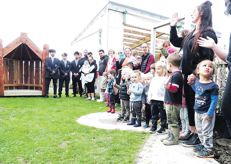 Parkland School’s Taumata Kahuki welcomed a group of Nelson College students, who were delivering a small whare they built, to Motueka Kindergarten last Wednesday.