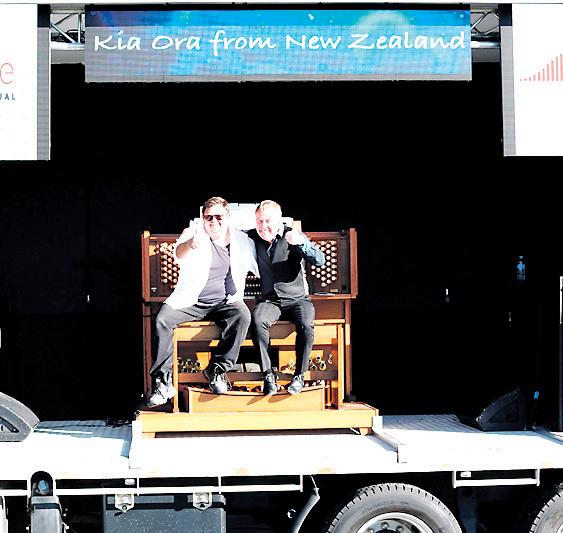 Mark Patterson and Chris Hall on their bespoke truck that provides the stage for their ‘From Us with Aroha - Benefit Organ Concert Tour’.