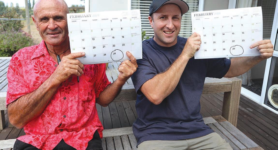 The father and son leaplings will turn 68 and 40, or depending how you look at it, 17 and 10 tomorrow and plan to celebrate at the Riwaka Hotel after a four year wait for their day of birth.