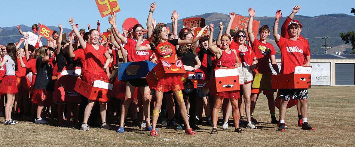 Motueka High School’s house sports day started with a roar. Yellow House/Angi brought the Lion King pride to their performance, while Red House/ Ahi (pictured) zoomed up the field with their Lightning McQueen racing car vibes. The surf was up for Blue House/ Wai, and Green House/ Nuku offered a well-choreographed display that was straight out of Shrek’s swamp. The judges were presented with the traditional themed cakes, and this fun piece of blatant bribery yielded the teams’ culinary creativity.