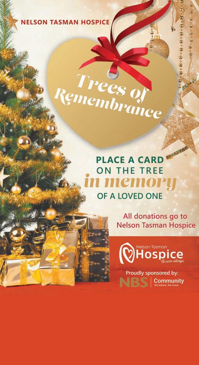 This year’s Nelson Tasman Hospice Trees of Remembrance will be at Westpac Motueka on 11 Dec and then at House of Travel Motueka 14 to 18 Dec.
