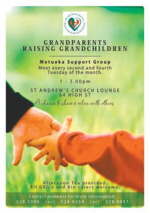 Welcomes Grandparents/Kin raising/supporting grandchildren. 2nd & 4th Tuesday every month 1-3pm St Andrew’s Lounge 64 High Street. Join us for a confidential, relaxed & supportive time with others. Phone 0211337299.