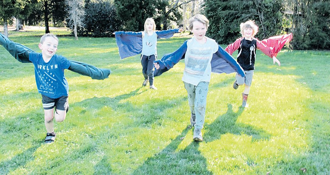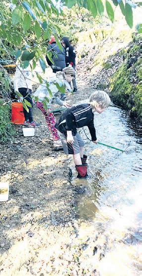 Above: Nakau Cullen, Nina Bartholomew, Ali Kelly and Jimmy Drummond take on the role of birds during a game on the ‘mini environmental adventurers’ programme. Right: Haruno Fujita and Ava Kubo take a close look at another critter. Far right: The kids enjoy searching the stream for residents.