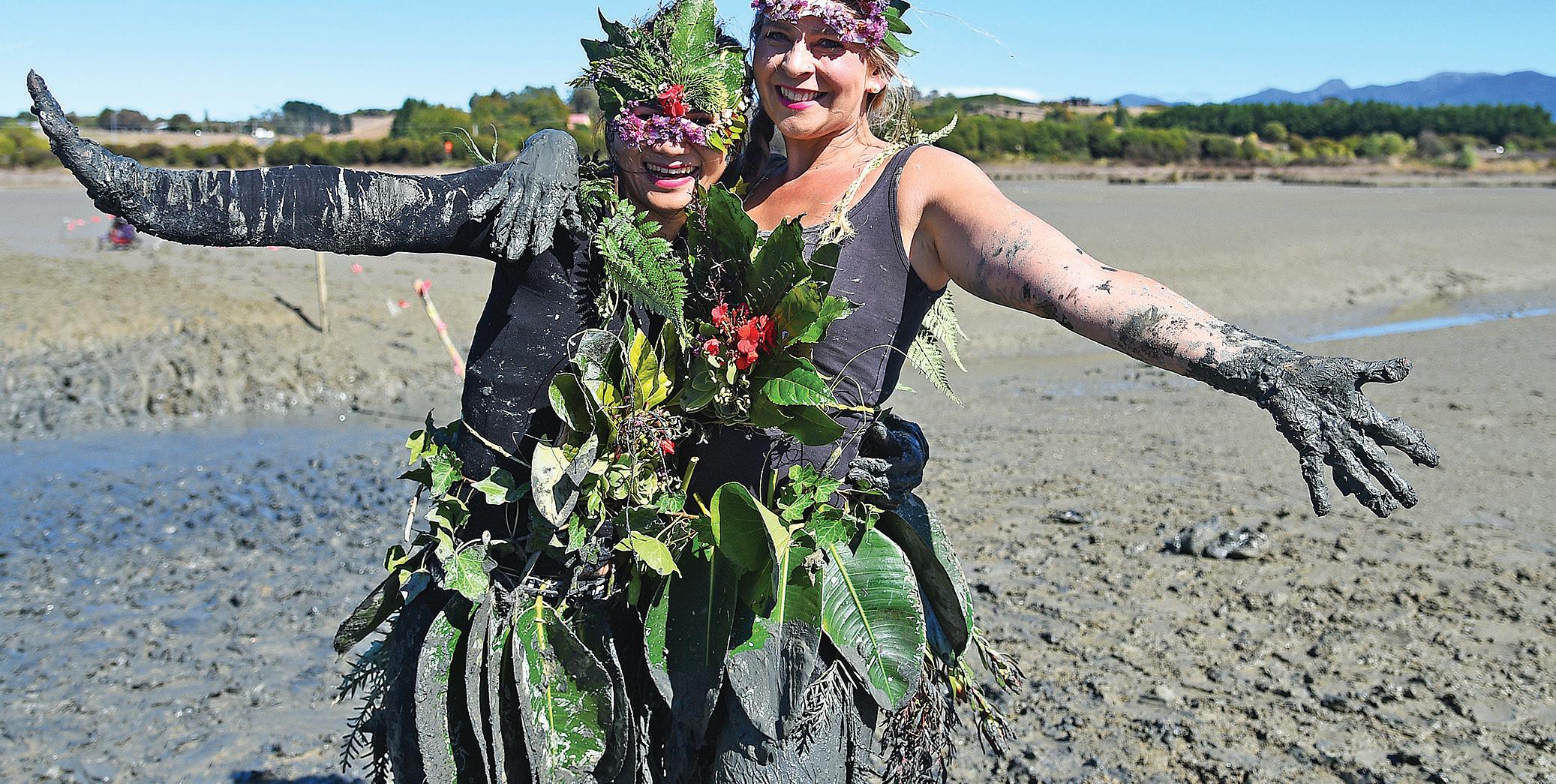 Richmond’s May Armstrong and Laura Paynter joined more than 1000 people who squelched, splished and slithered their way across the mud flats near Tasman School on Sunday, for the annual Muddy Buddy fundraiser. Photo: Chris Symes/ Shuttersport.
