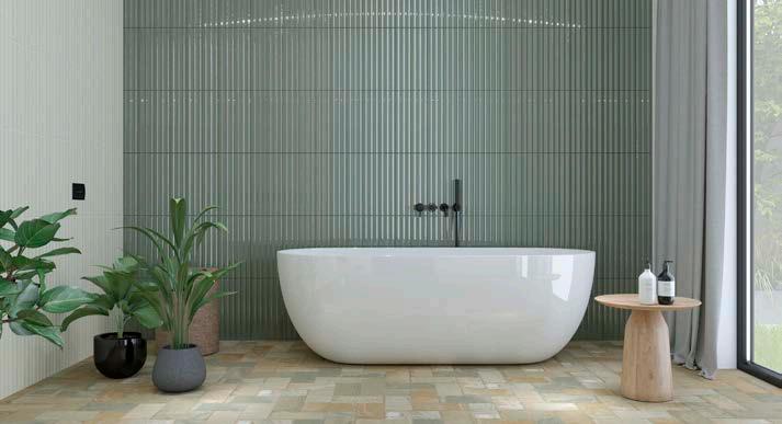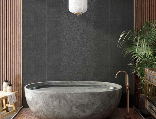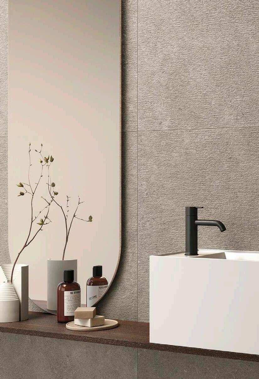 Ardoise channels the understated beauty of slate with subtle movement, offering a timeless foundation for interior and exterior surfaces. Combined with a classic subway tile, Soho, which draws inspiration from shagreen texture, for an elevated, tactile surface.