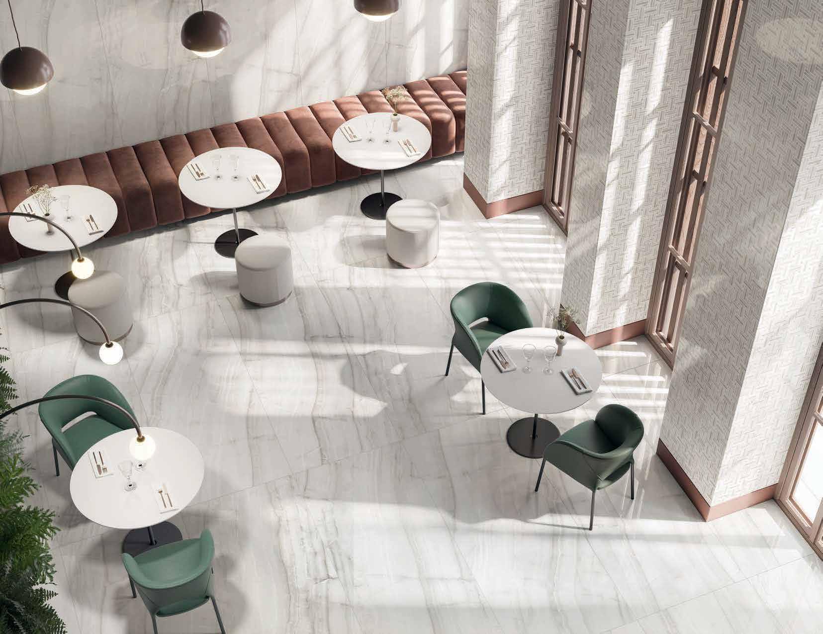 Winston combines the luxurious beauty of natural stone and durability of porcelain into 6 sizes, 2 finishes, and 8 different patterns including 7 mosaics and a modular mix. Whether plain tiles or decorative cuts, the marble look is packed with details and color tones all projected onto a brilliant surface that diffuses light.