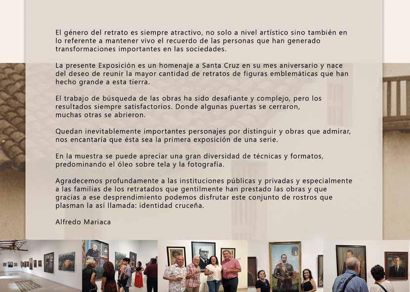 La presente Exposición es un homenaje a Santa Cruz en su mes aniversario. Nace de la inquietud de reunir la mayor cantidad de retratos de figuras emblemáticas que han hecho grande a esta tierra.