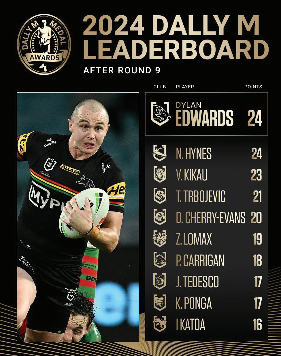 The performance continues Edwards strong recent run of form which has seen him collect 12 points in the last three weeks after scoring five points in Round 7 and four points in Round 8 to go with this week’s three-point score – now drawing him level with Hynes on 24 points to lead the Dally M race.