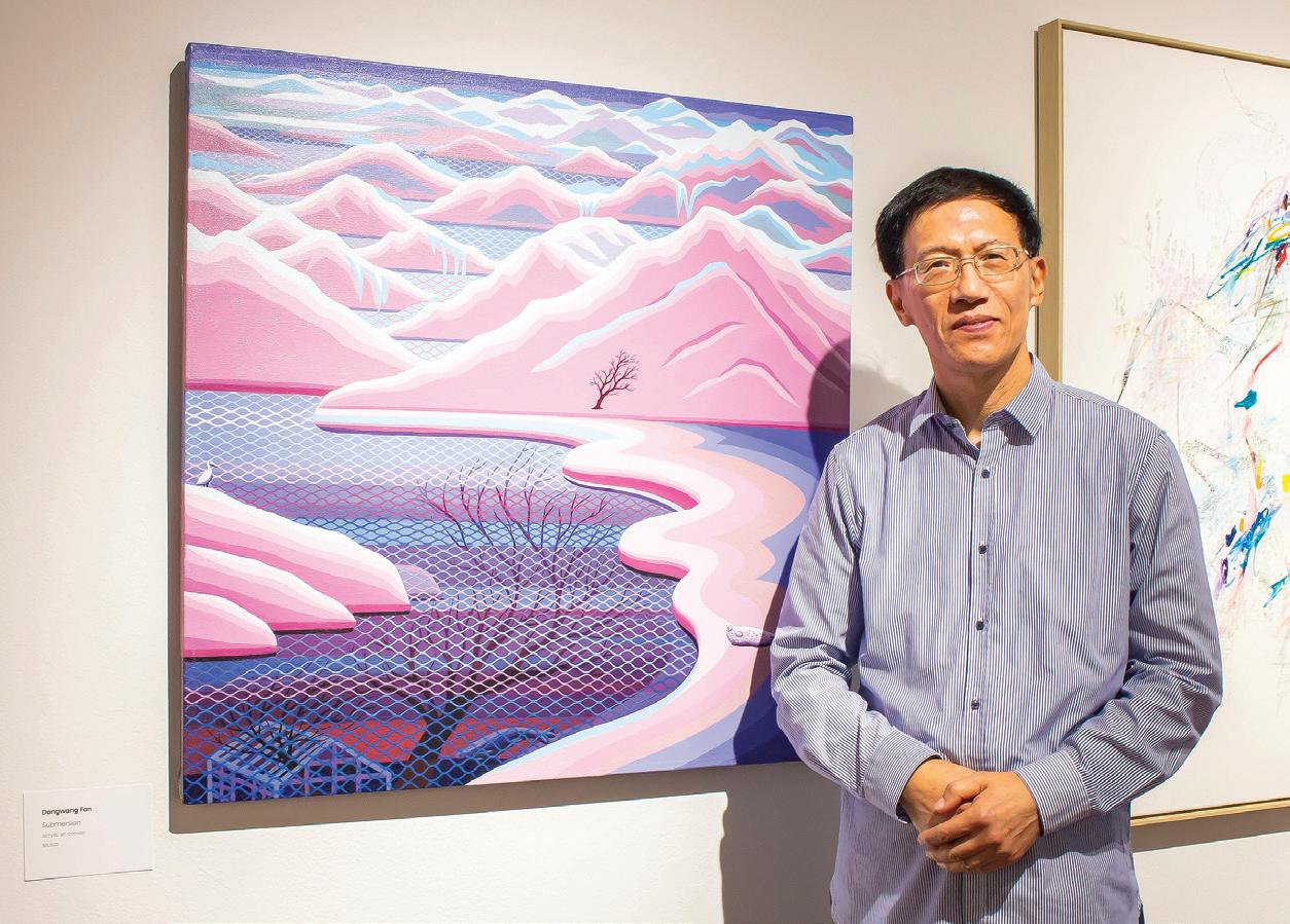 Fan’s artwork, Submersion, is a painting showcasing natural landscapes of mountains and water, blending Chinese traditional techniques and contemporary western painting.