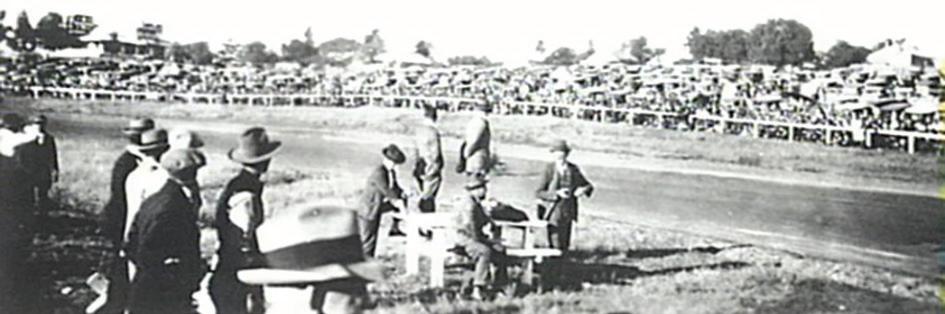 away in the ambulance to the hospital where he remained until 4 p.m. when he was discharged the same day. He knew that his brother was still unconscious and he remained in that condition in the hospital until his death on the 13th. Raymond said that no other motorcycle came in contact with them after the fall. The condition of the track as cycle tracks go was as perfect as possible and there could be no cause for complaint. The cause was the wheel coming away was the breaking of the bar six inches away from the axle and as far as he was aware the machine was in perfect order when they commenced the race and they both examined the machine thoroughly prior to the race and if there was a flaw it escaped our notice. His brother had travelled at a faster speed without the side car previous to this race. Horace was a competent rider and had six years experience and no one could have avoided an accident under those circumstances. He attributed no blame to anyone. Dr Barrow stated that the death was due to an extensive laceration of the brain. Horace had every attention possible in the hospital and was examined by a specialist on the day of the accident. A verdict of accidental death was returned. The Western Suburbs Motorcycle Club approached Sydney Smith for a loan of his paddocks known as Belmore Park west of Sydney’s home called “Thornton Hall”. In 1925 Sydney and his family floated Penrith Speedway as a public company with him the chairman of directors. Six thousand people attended its first meeting. Horace’s funeral took place on the Wednesday with the interment being in the Church of England cemetery at Rookwood. Photo of the Belmore racing track in Penrith (circa) 1920 courtesy of Penrith Library
