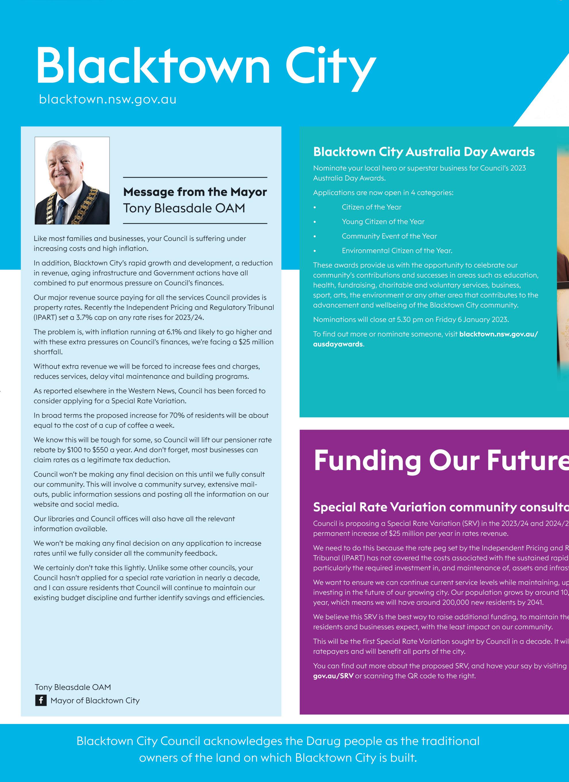 Blacktown city council is considering applying to IPaRt for a Special Rate Variation in the 2023/24 and 2024/25 years to provide a permanent additional $25 million in general revenue to ensure council’s financial sustainability.