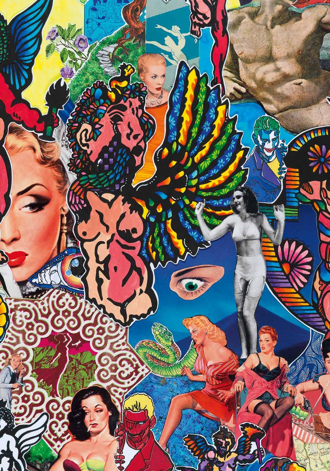 The art of Miranda Vatopoulou is characterized by the nuances of modern life. Pop culture scenes, emblematic characters, dynamic women and landmarks – either taken from hard-to-find books, or handcrafted by herself - emerge from within each other with an almost architectural precision. However, noteworthy is her ability to interlace modern aesthetics with the great masters. In her works, one can identify scenes from emblematic works of art, such as Michelangelo’s “The Creation of Adam”, establishing connections with the cosmos and the creation of man. A large part of her artistic creation stems from personal experiences and pursuits as well as the place of man within the world. Renaissance and Baroque scenes, in conjunction to modern references, constitute a multicolored mosaic of stories, within which one can wander, seek and ultimately form their own interpretation.