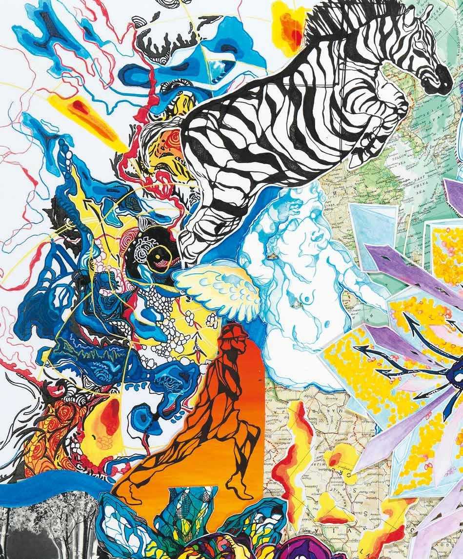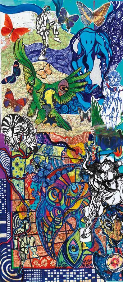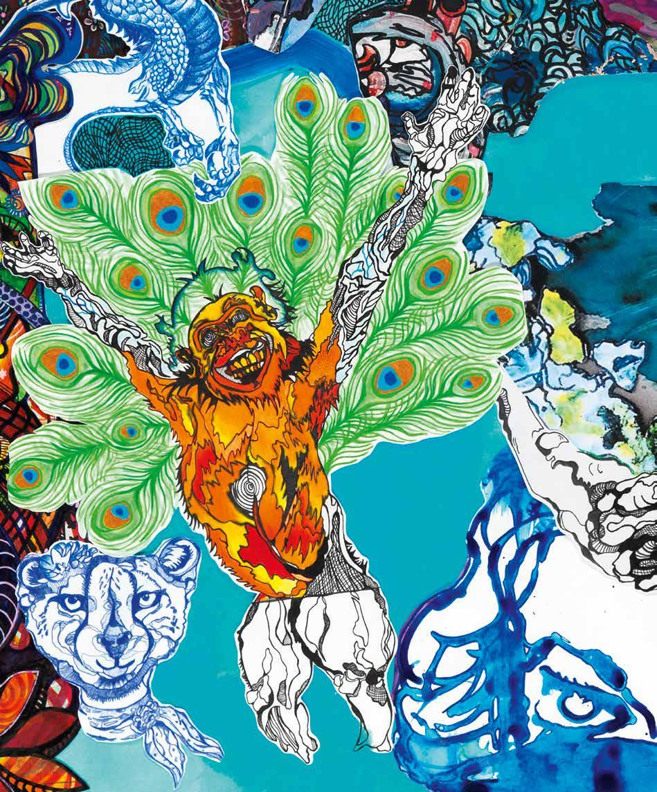 The varied characters in each artwork are in fact aspects of myself, representations of my state of mind and being at different moments. The recurring image of a zebra highlights the need to own your true colours and accept your true self – a process that is harder and more complicated than we like to admit. Snakes have a dual meaning in my works, as they shed their skin and resurface anew, but are also references to the Snakes and Ladders board game. The continuous ups and downs act as a metaphor for my journey and as a visual cue for the viewer to search into the entire composition. The monkey is an illusion of control, of being in charge – something I often pretended to be when I was still searching for the lost sun.