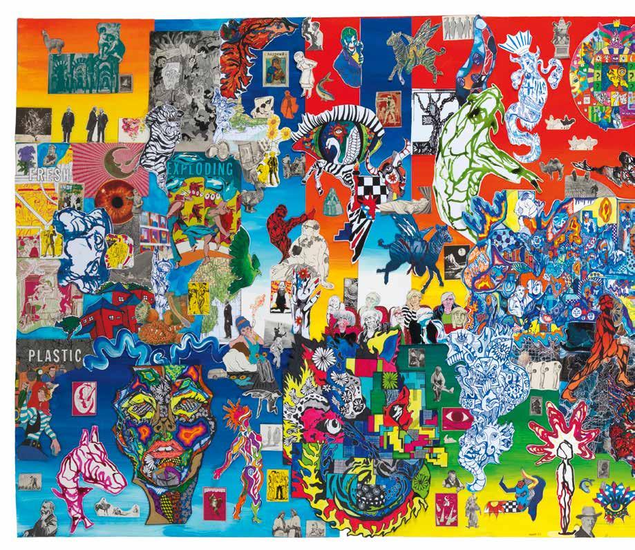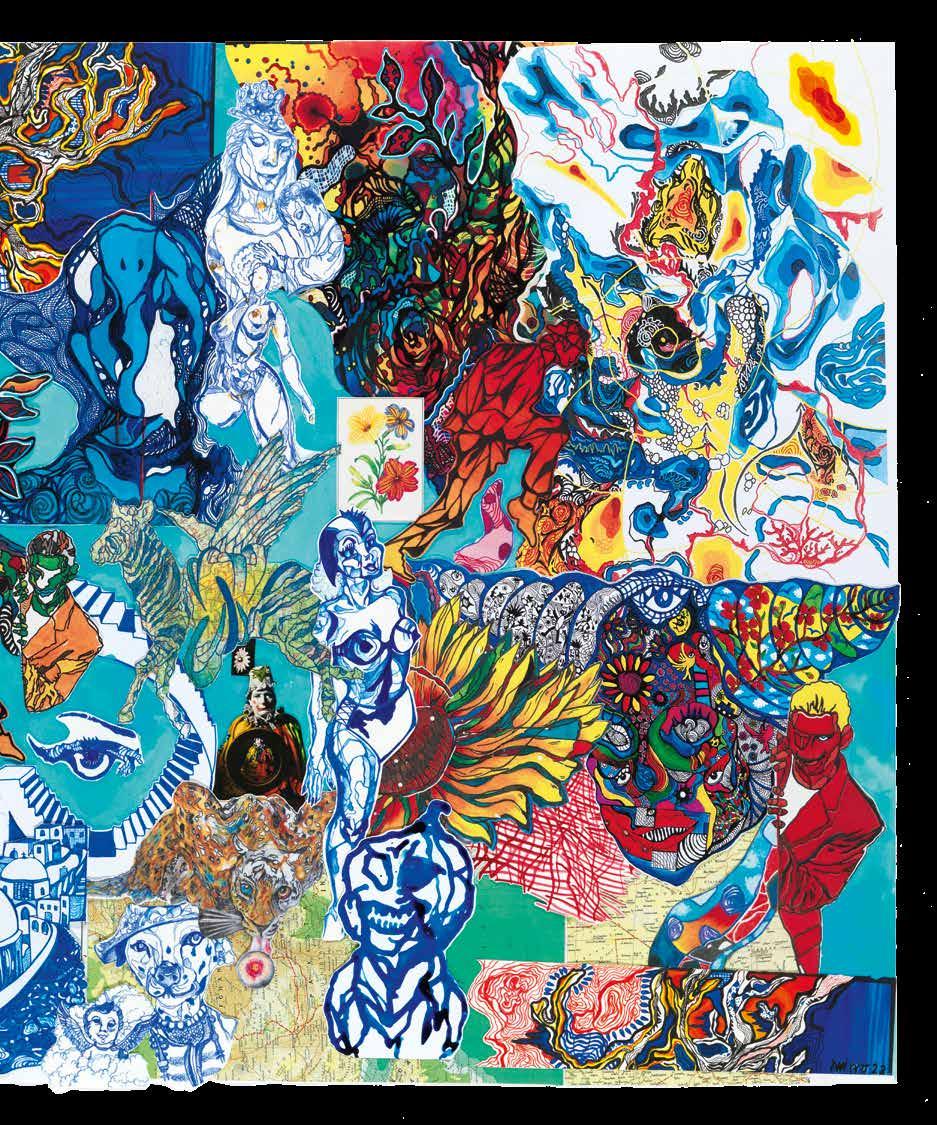 Miranda Vatopoulou’s work illustrates this condition with admirable lucidity. Her images metabolise into art the bulimic gaze of a young person – the modern subject par excellence. Street art, graffiti, the rapidfire imagery of a graphic novel, mediated interactions with classical art; architecture, history, pop culture, music, interculturalism – every mark on the map of the contemporary human perception unfolds spectacularly before us. The variety of images, the different mediums (drawing, painting, collage, and more), the colourful materiality of her works, all point to the same perception of a multidimensional ecosystem.
