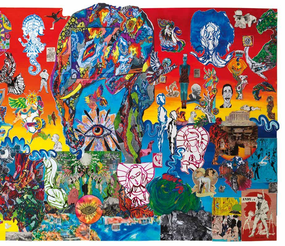 One close look at the images of Miranda Vatopoulou suffices: psychedelic forms and shapes, figures from the canon of painting, faces from magazines, posters and films, images sourced from science fiction book illustrations, self-portrait drawings, objects of material culture. Random words, fragments of phrases. The palimpsest of the young artist Miranda Vatopoulou could be likened to a map which, rather than encoding and simplifying the area it depicts, instead deposits layers in increasingly minute detail, plunging the viewer in an entropic act of “reading.” This is also punctuated by the titles of her works: Finding Your Lost Sun, Believe in Your Eyes, Heaven and Chaos (Big Bang), Lost Sun, Parallel Universe, The Same but Different, Disarray, Transition.