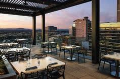 Elevated above the city, The Nines Hotel: A Luxury Collection Hotel offers striking rooftop views from expansive outdoor decks. Guests enjoy sweeping panoramas of the skyline, river, bridges, and distant mountain peaks. Whether sipping cocktails or dining at sunset, the setting blends urban energy with natural beauty, creating memorable moments framed by dramatic vistas and unforgettable evening light.