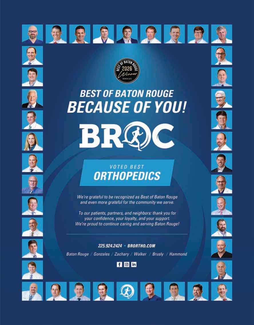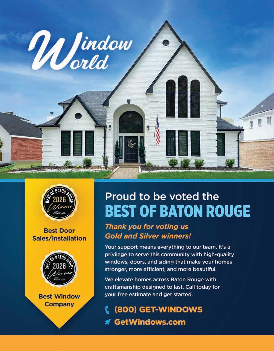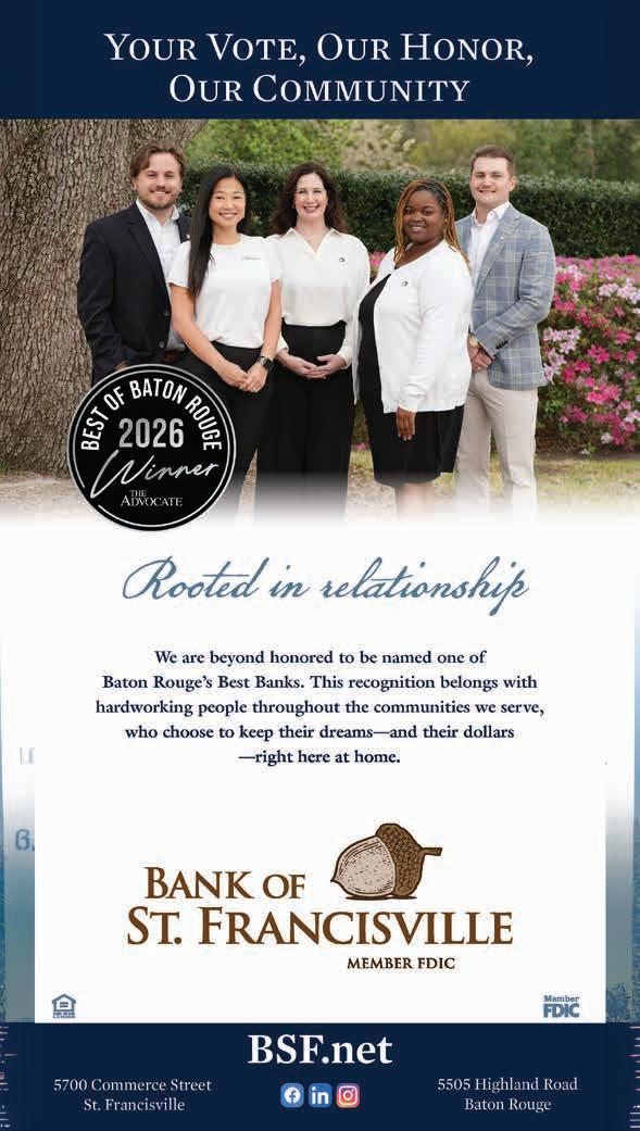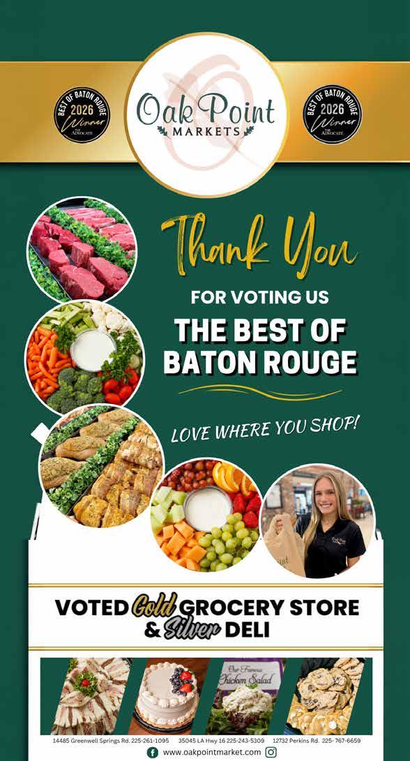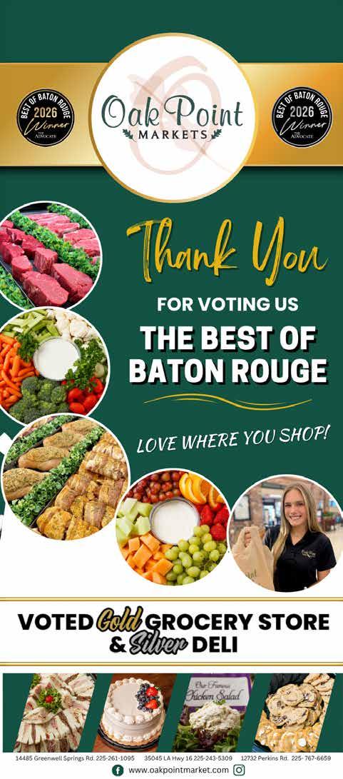 ©2026 The Advocate & NERUS Strategies, LLC. This is not a product of The Advocate newsroom. Best of Baton Rouge is powered by BestofPrograms.com and OptimumbyNERUS. com, part of nerus.net. Concepts and technology ©2026 NERUS Strategies. The reproduction by any means of this publication without express permission is prohibited. The use of the unique Best of Baton Rouge logo is by license only. Best of Baton Rouge is published as an advertising feature and is distributed to the subscribers of the The Advocate along with other select locations. To be included in future publications, visit VoteBestofBatonRouge.com or call 503-584-1627.
