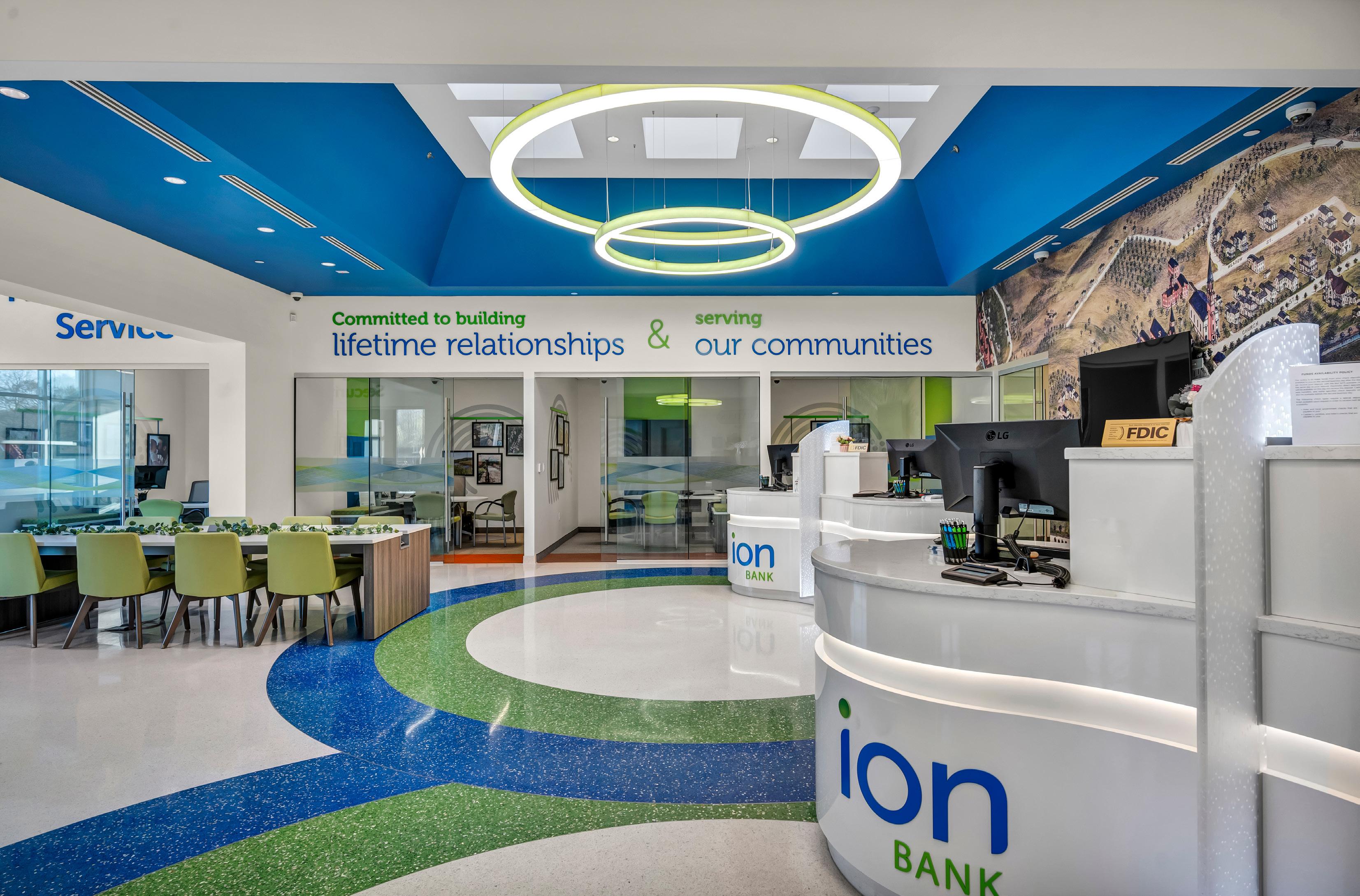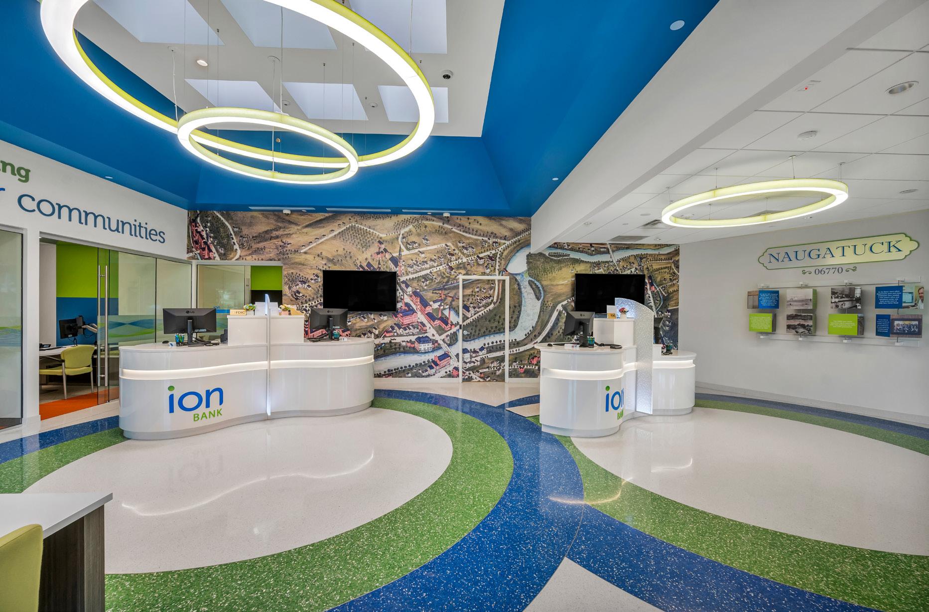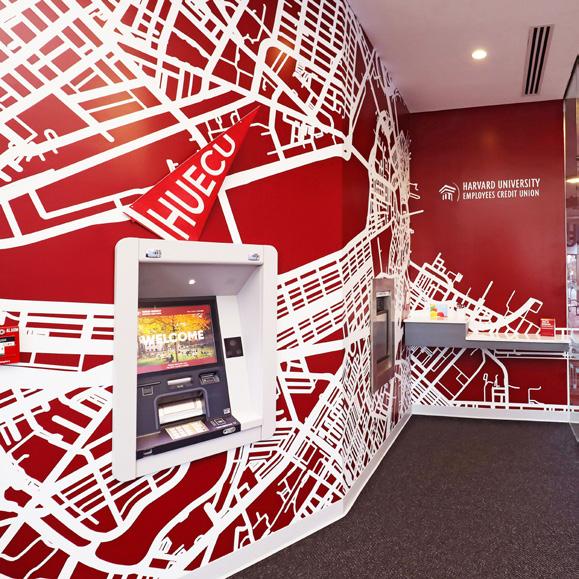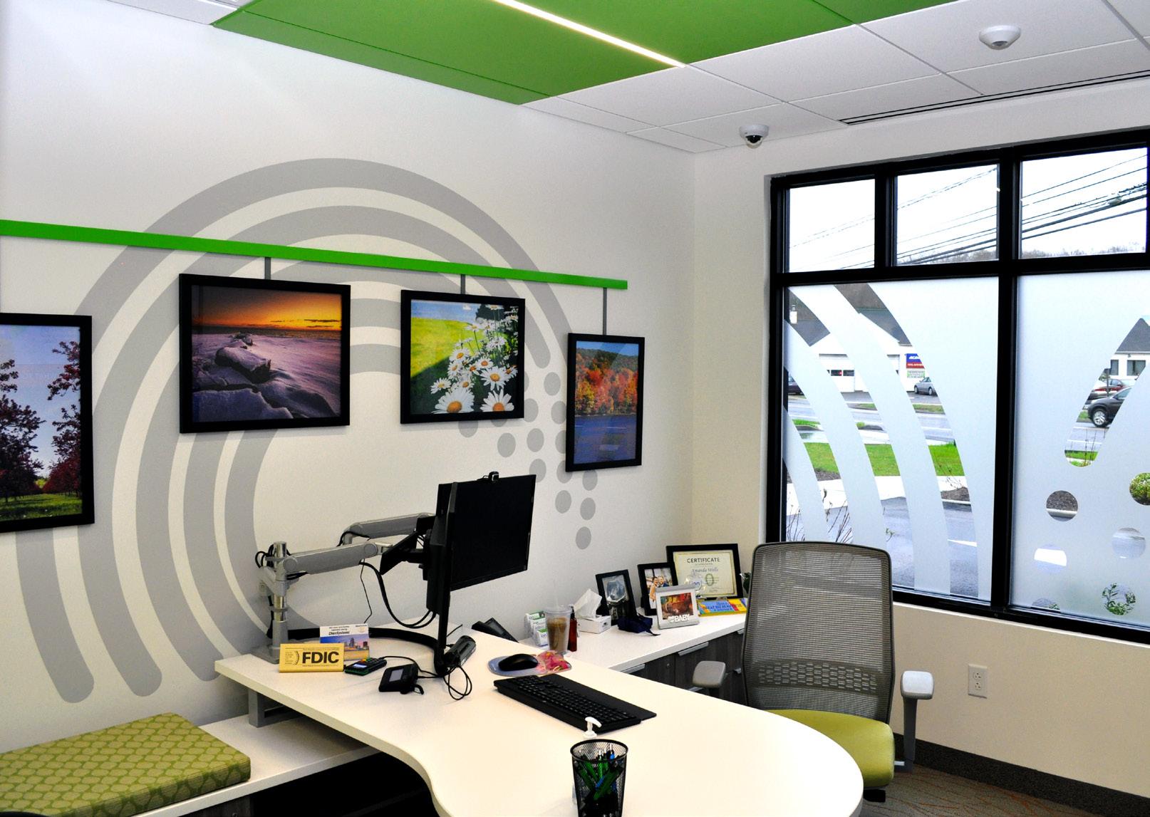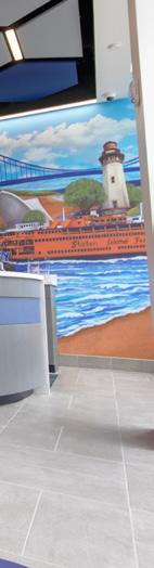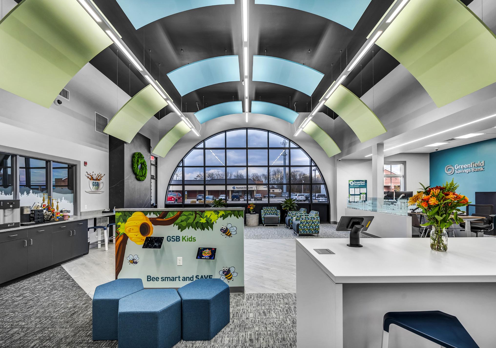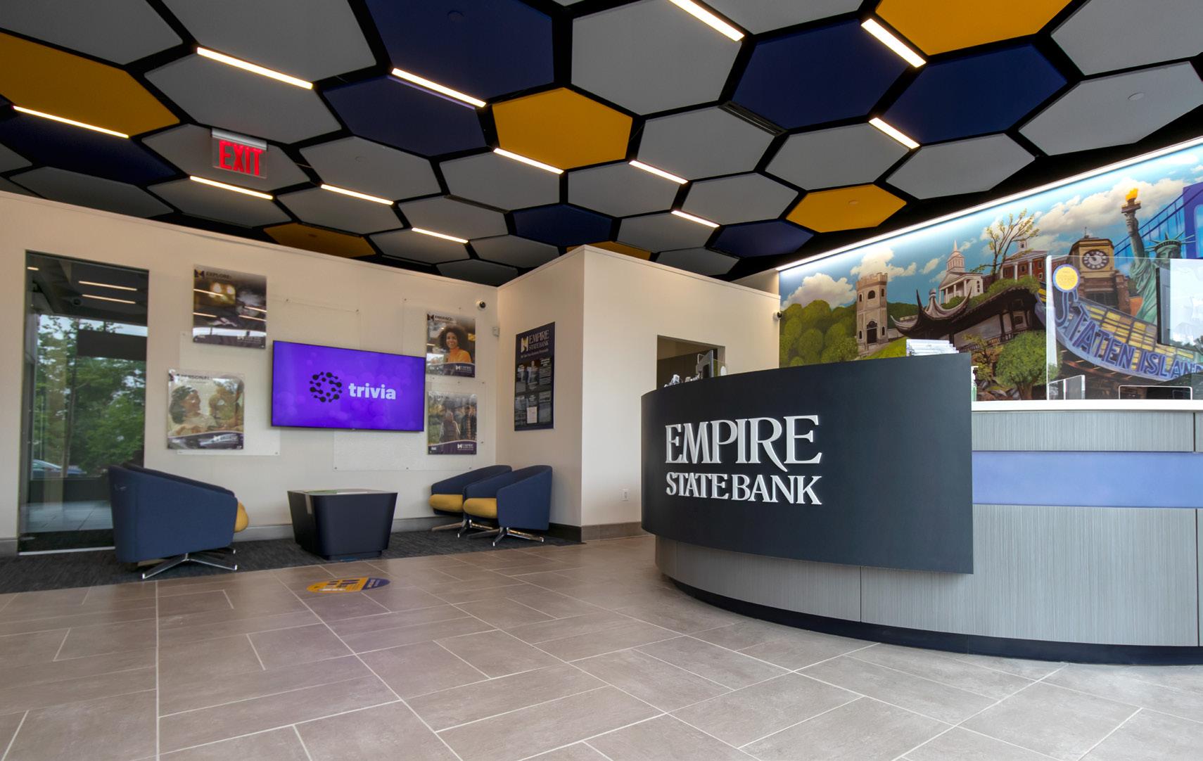 The vibrant wall mural representing Staten Island grounds customers in familiarity and pairs perfectly with the customized hexagon ceiling and the bank's brand palette consistent with their other locations.
