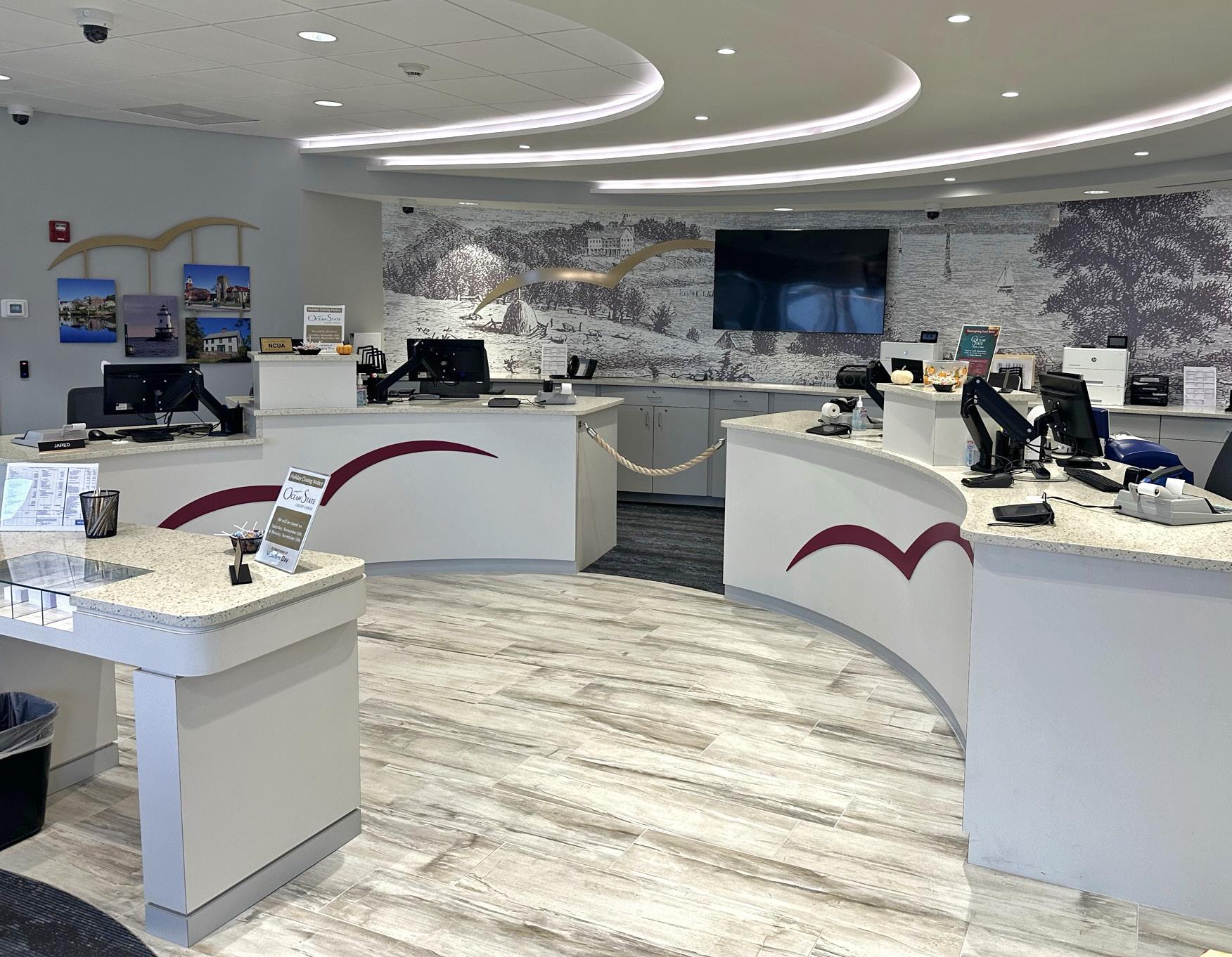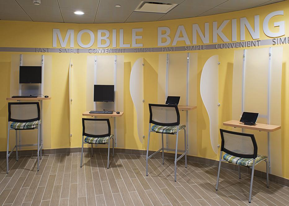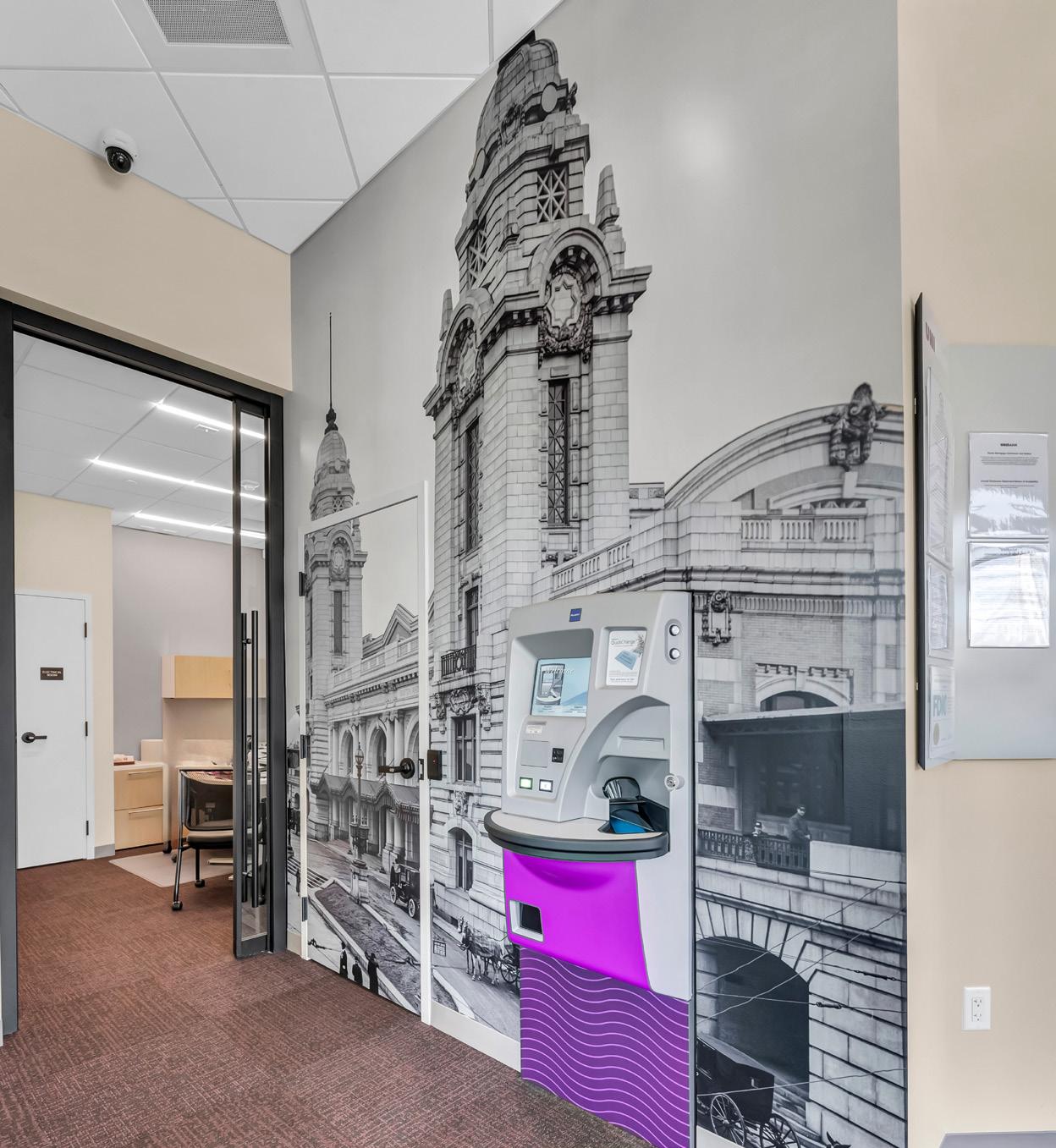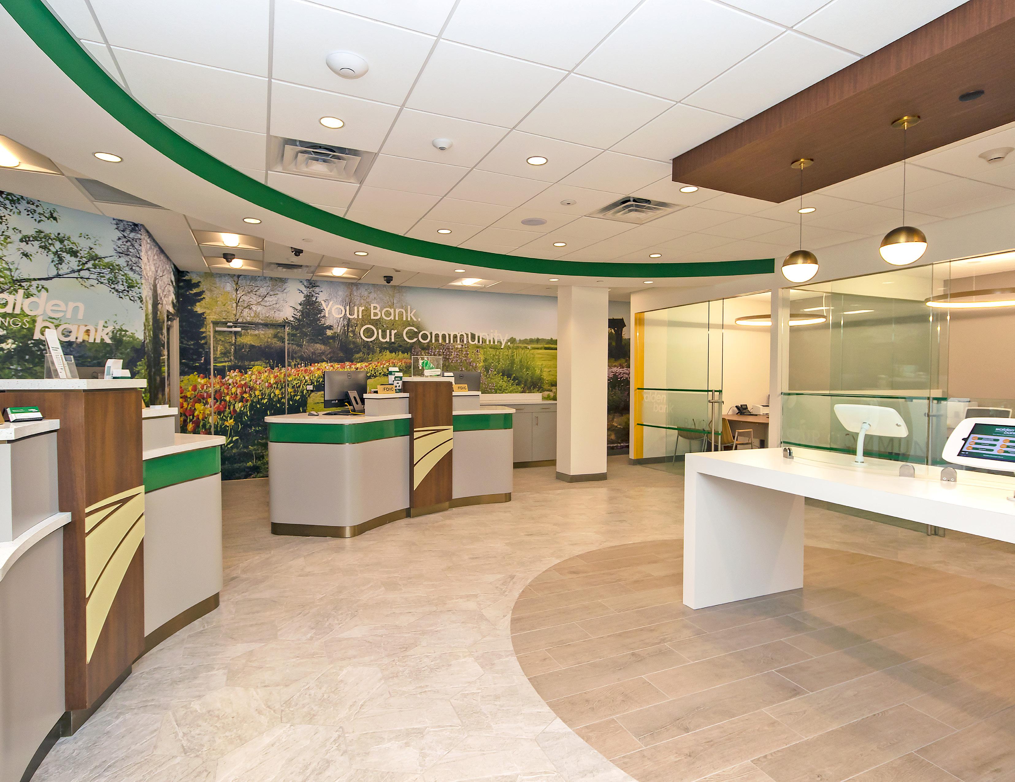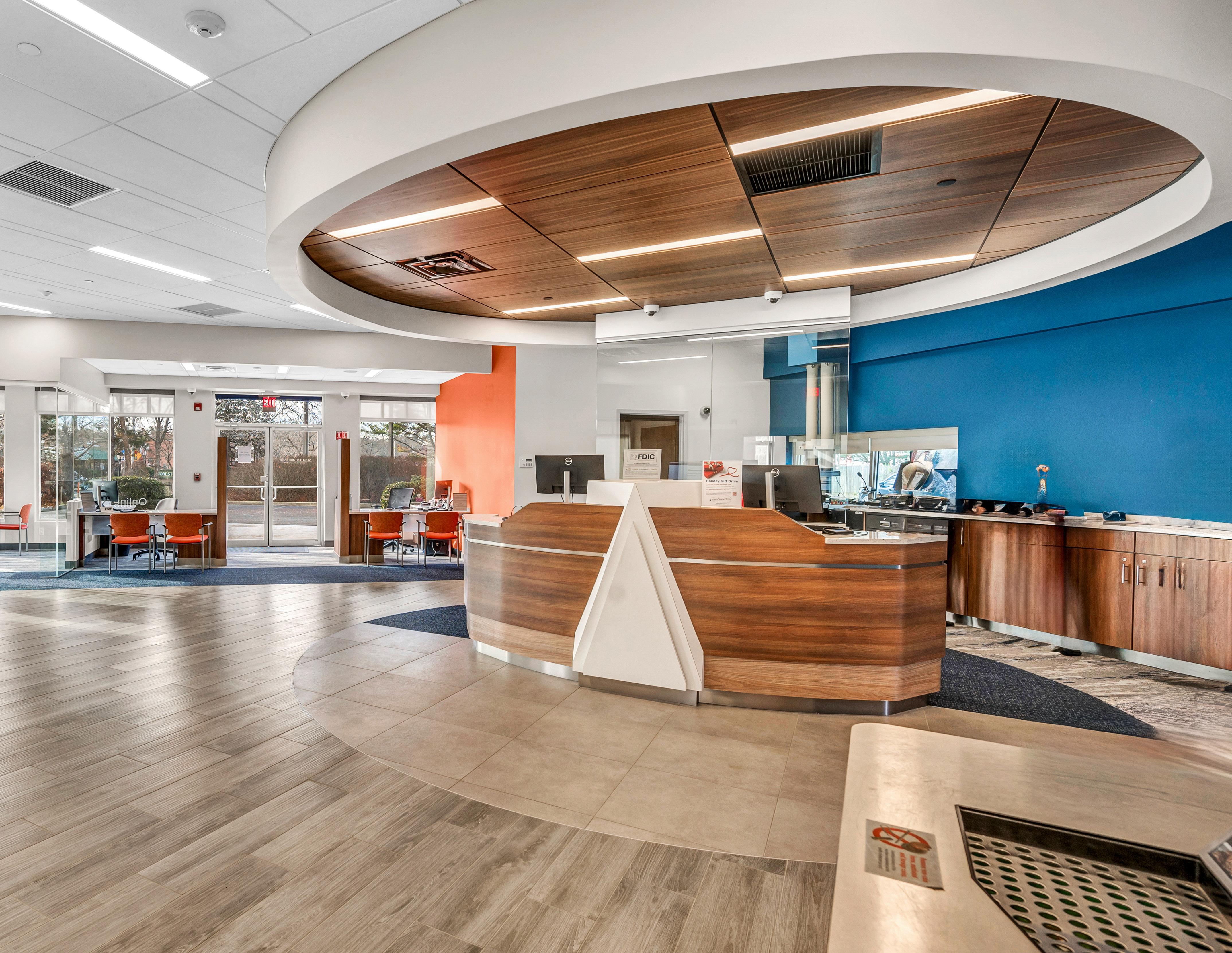 The vibrant wall mural representing Staten Island grounds customers in familiarity and pairs perfectly with the customized hexagon ceiling and the bank's brand palette consistent with their other locations.