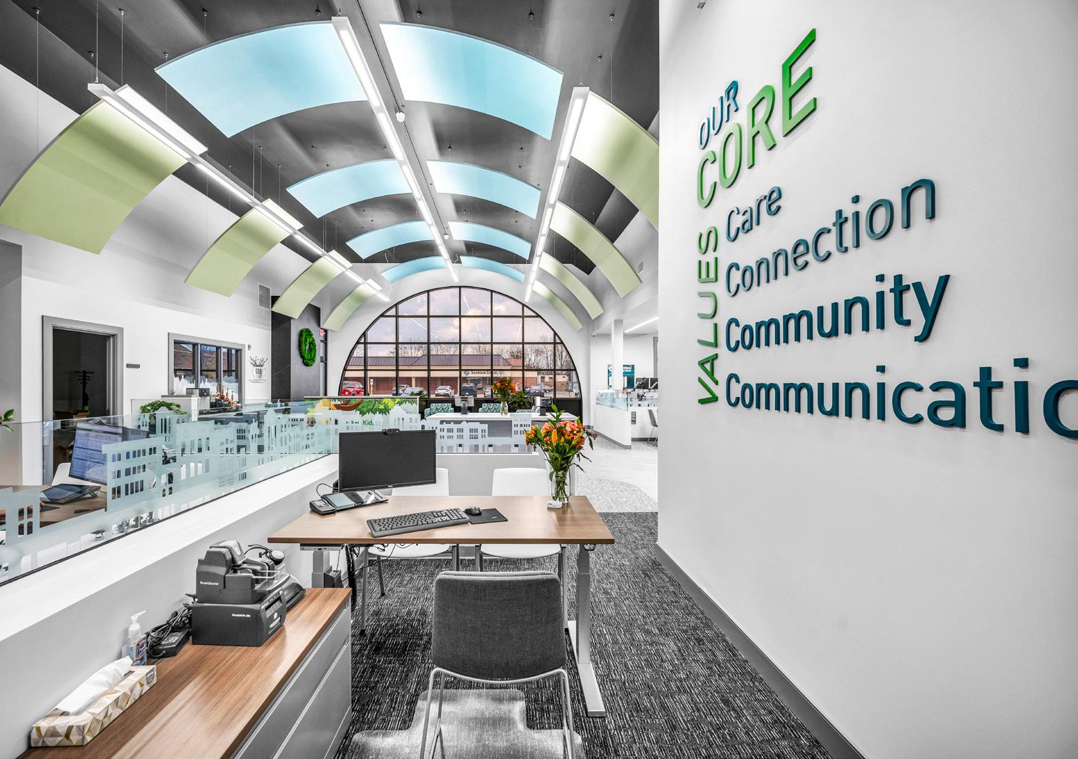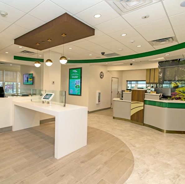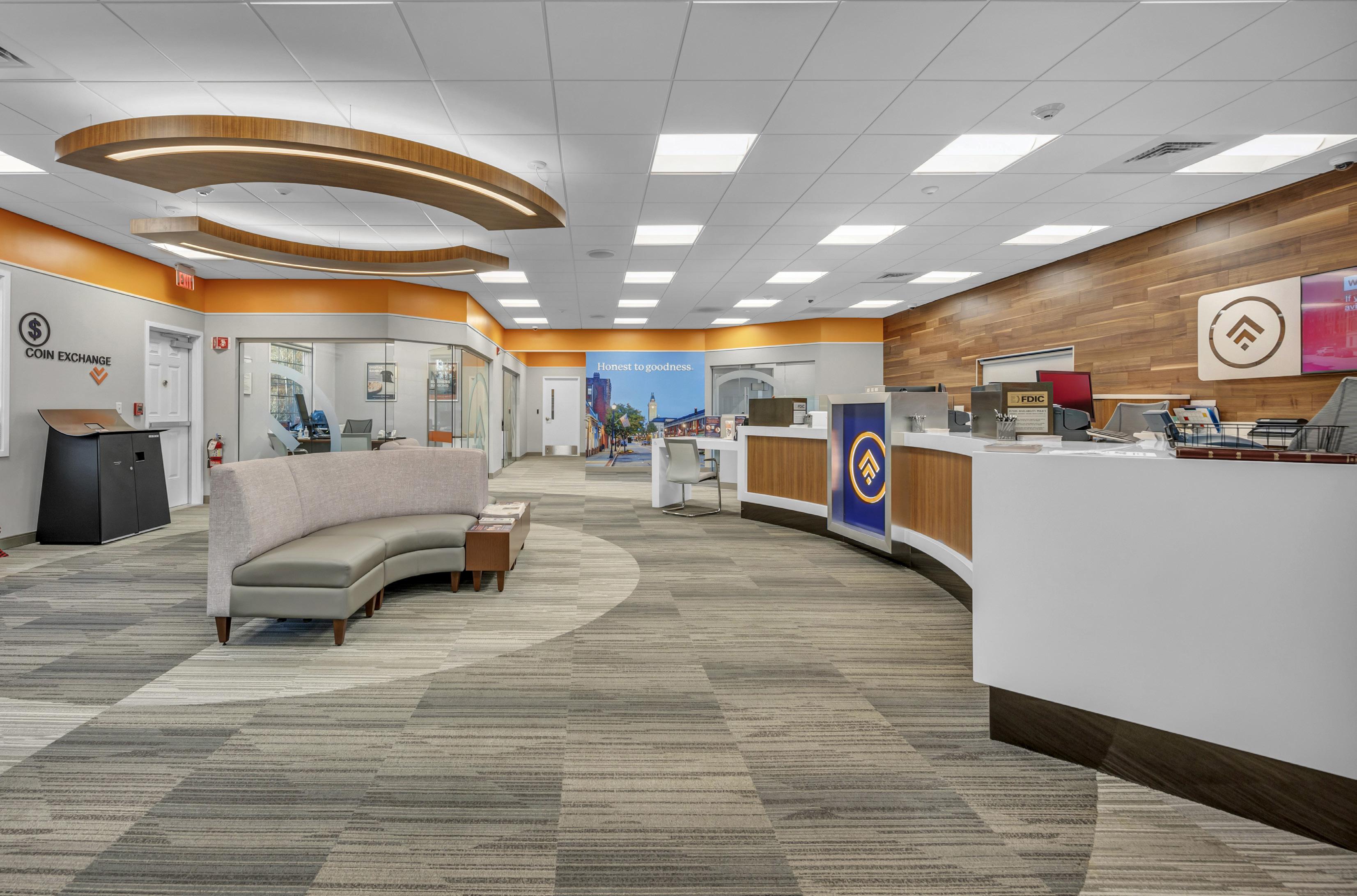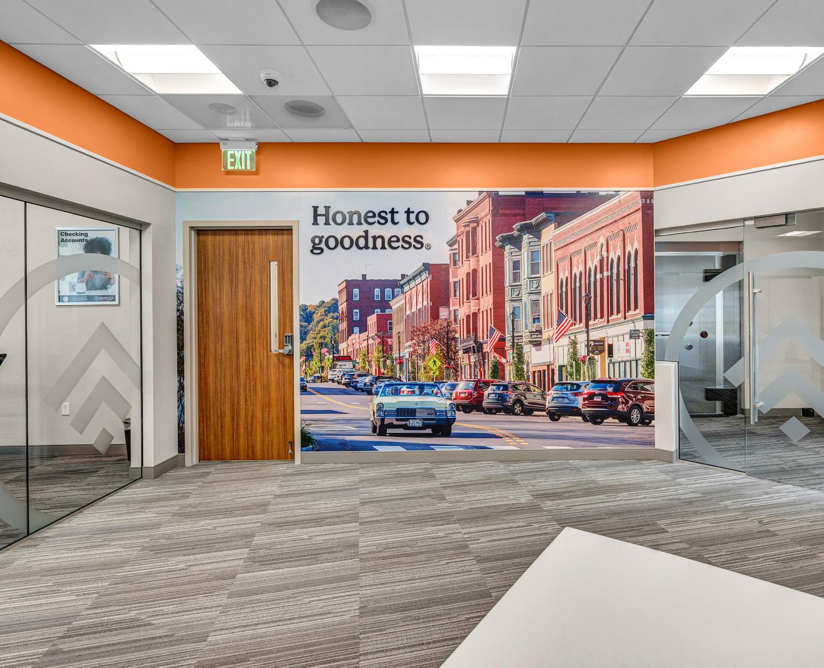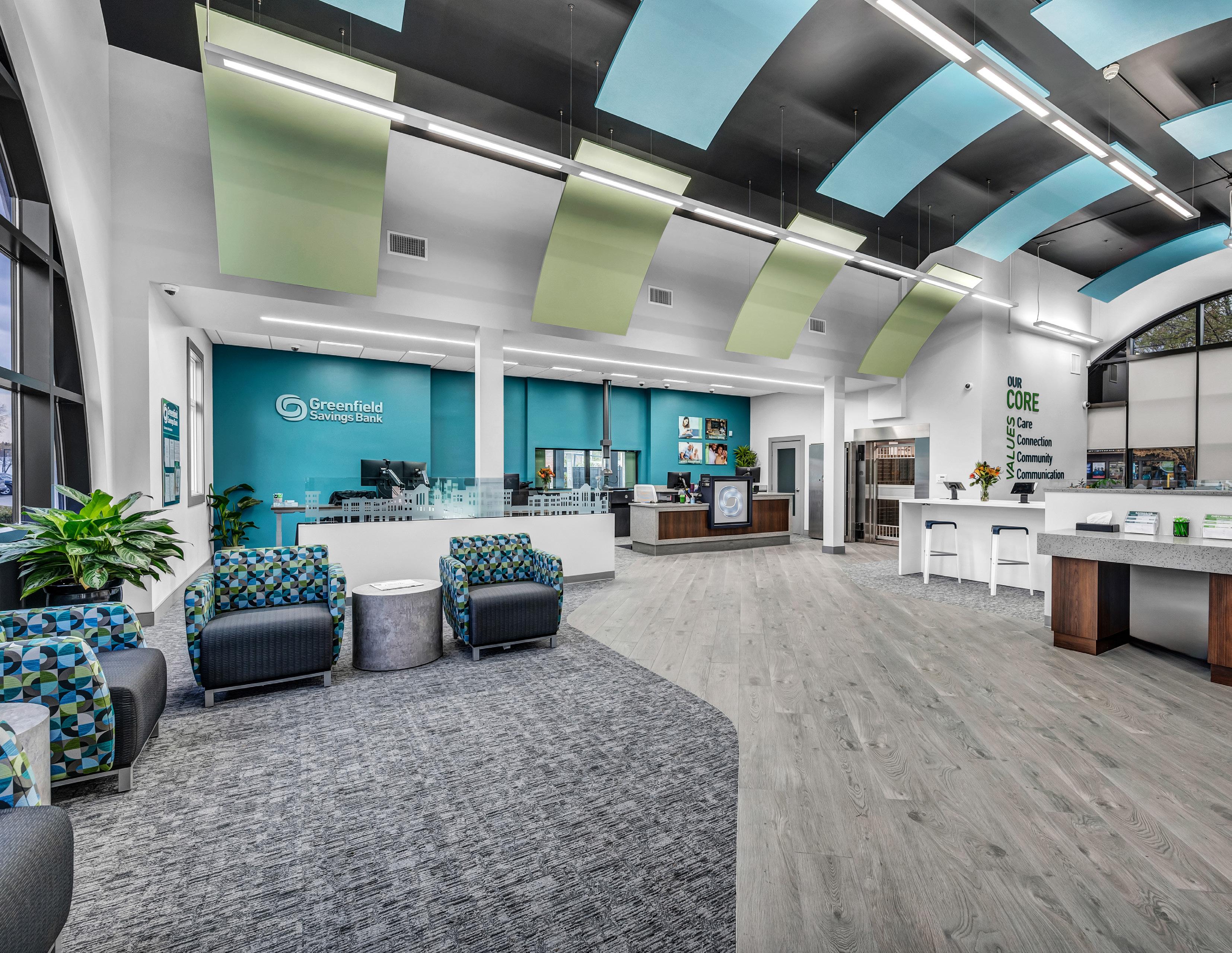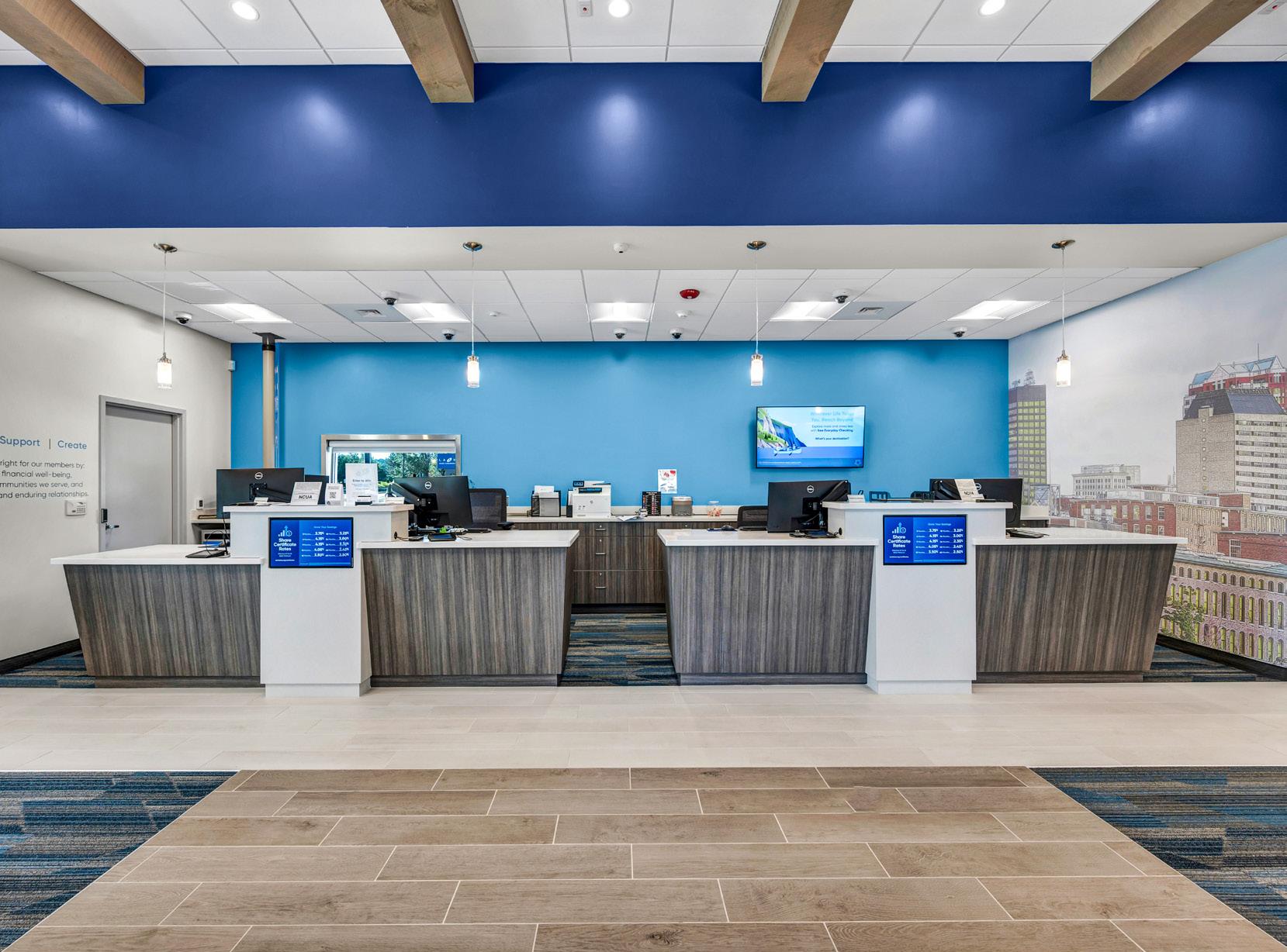 The vibrant wall mural representing Staten Island grounds customers in familiarity and pairs perfectly with the customized hexagon ceiling and the bank's brand palette consistent with their other locations.