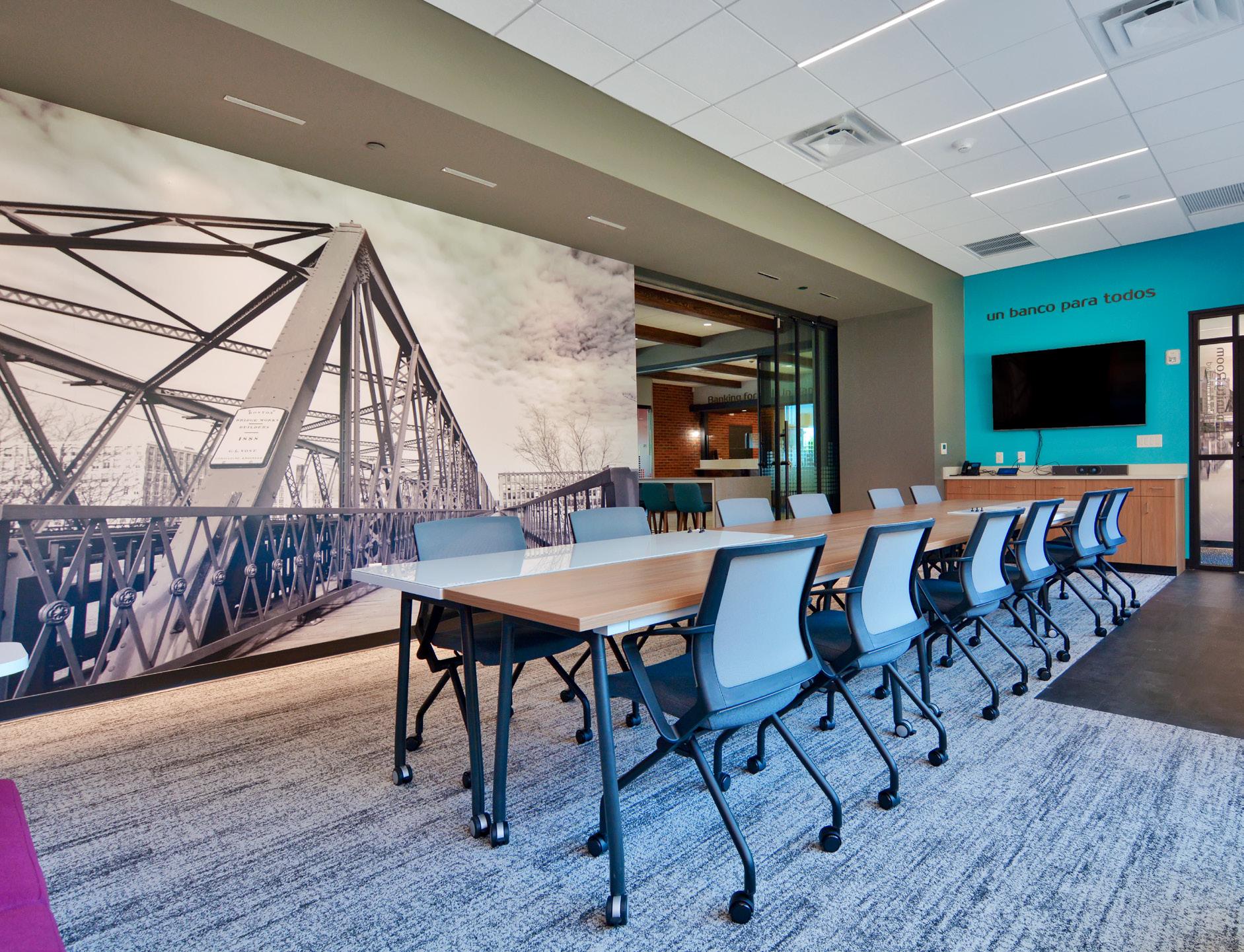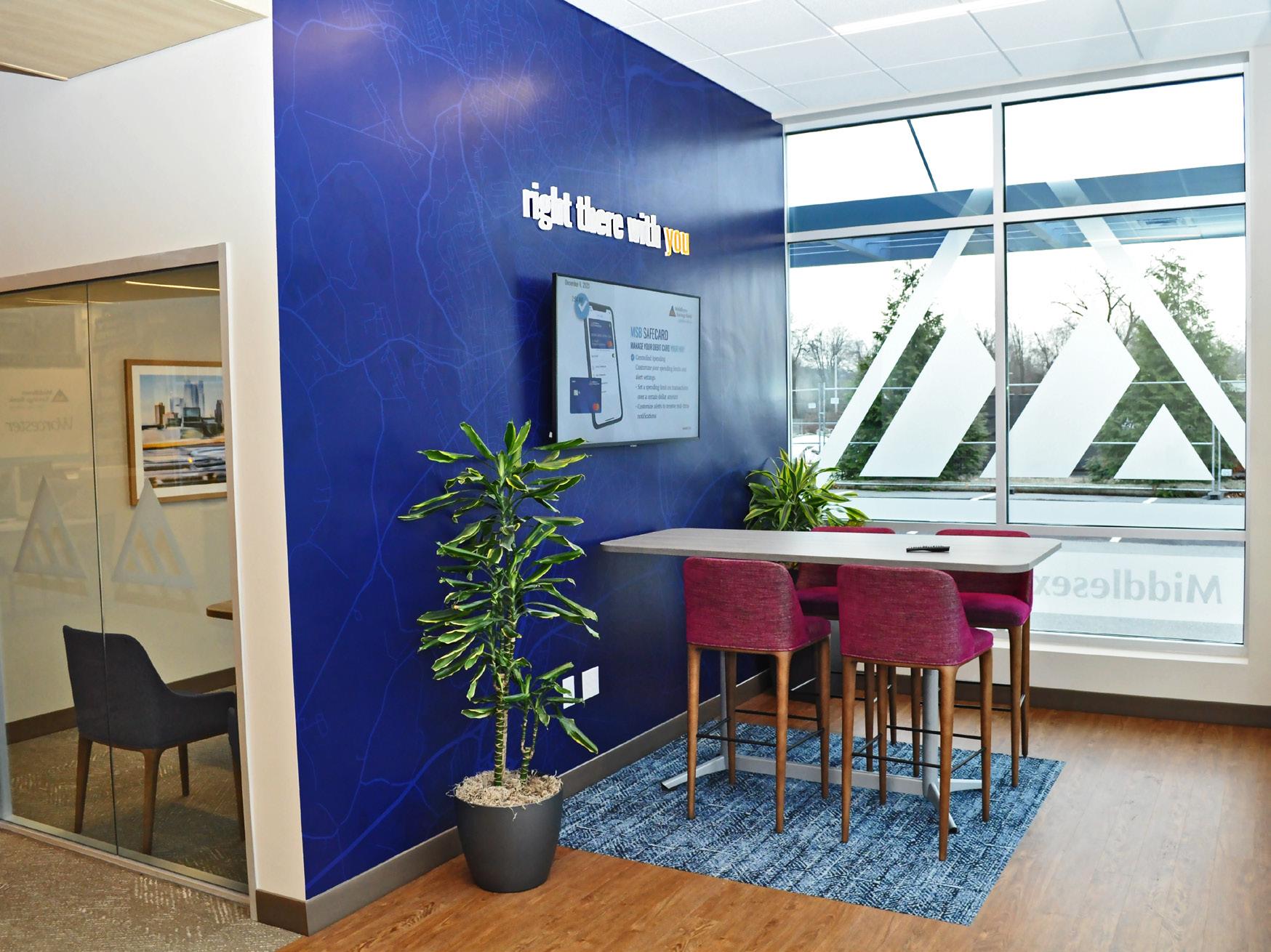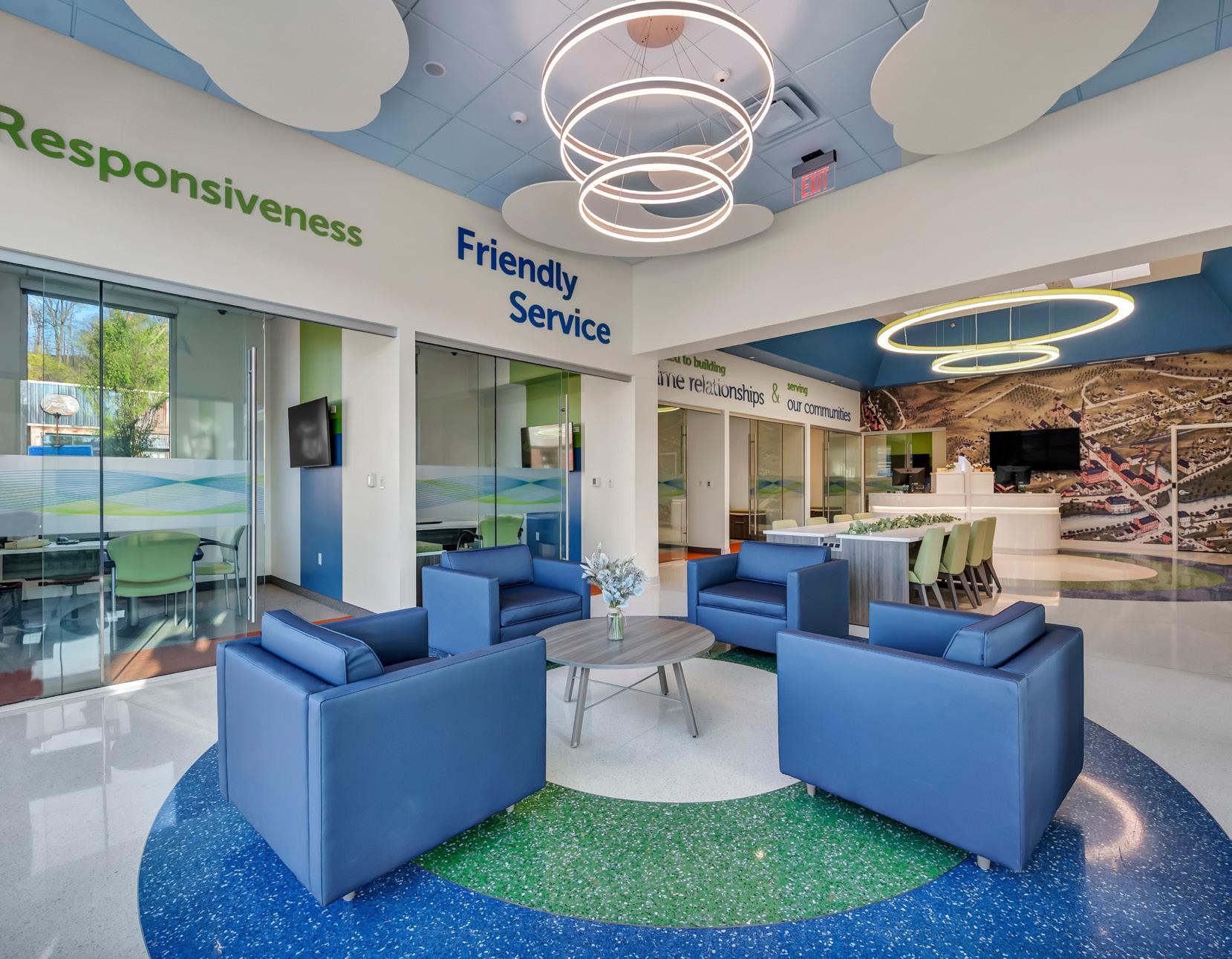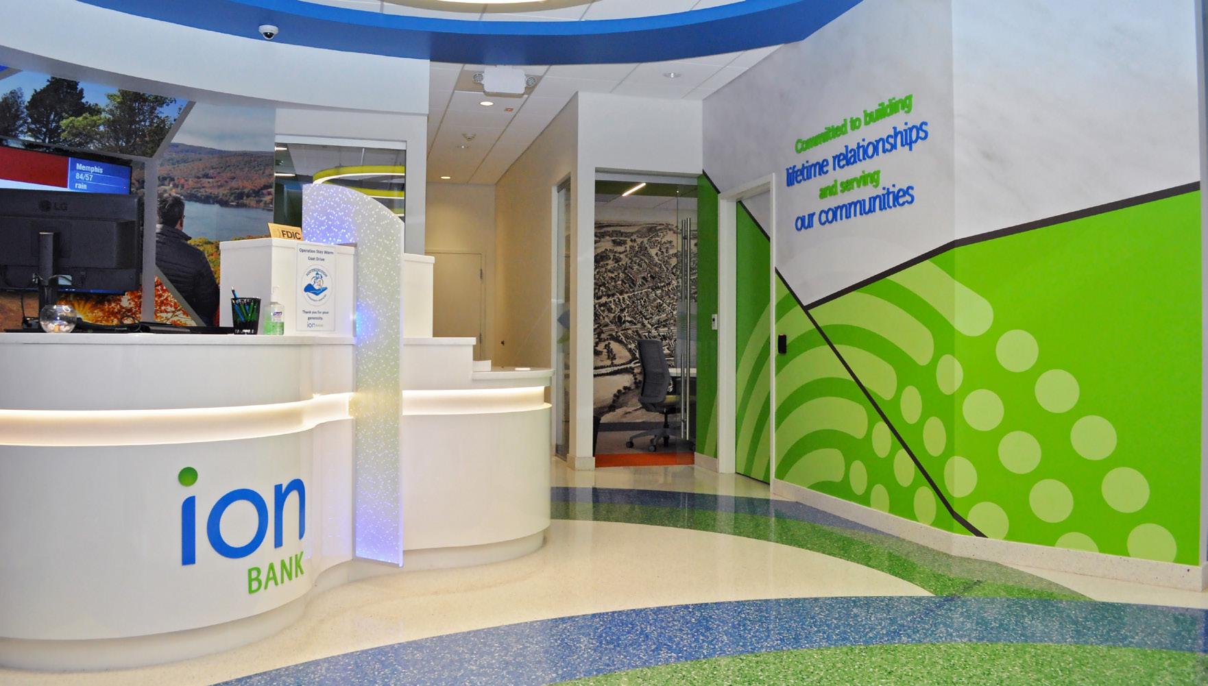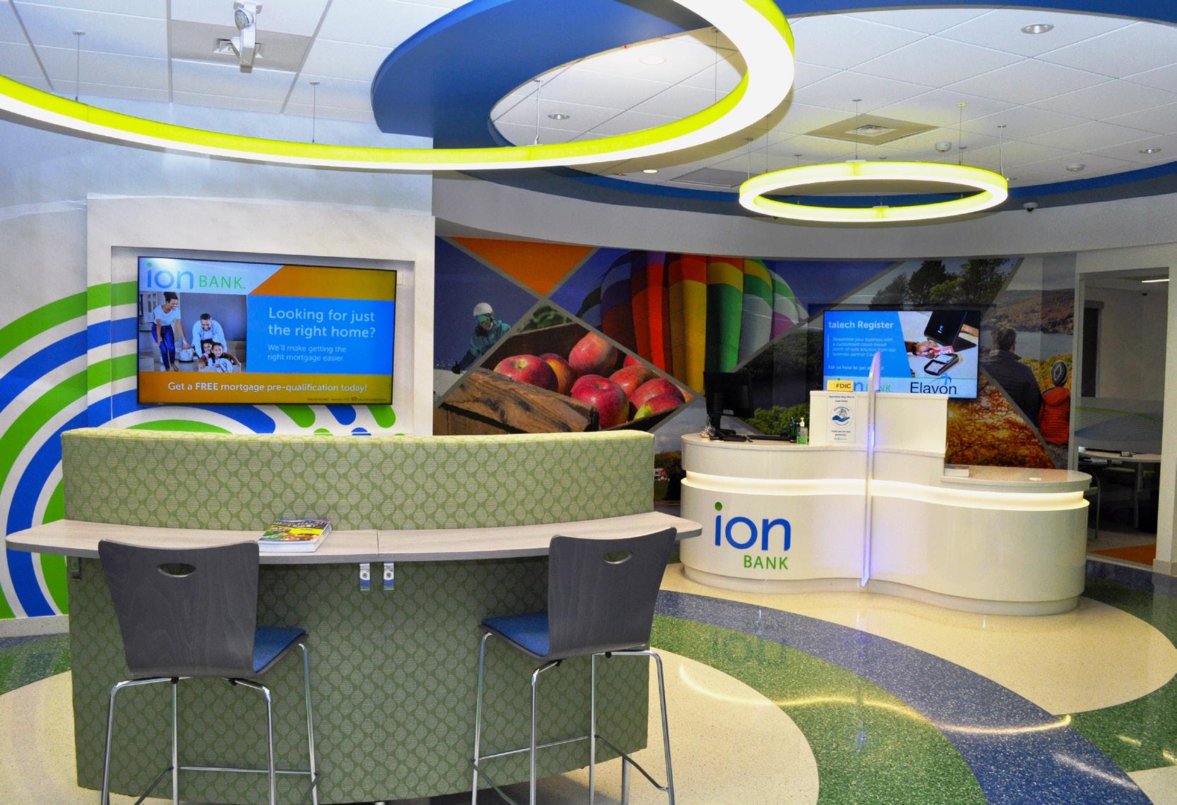The vibrant wall mural representing Staten Island grounds customers in familiarity and pairs perfectly with the customized hexagon ceiling and the bank's brand palette consistent with their other locations.