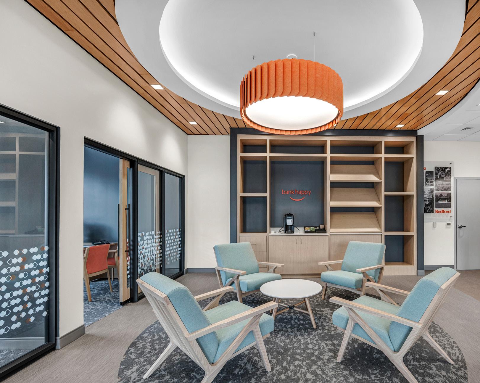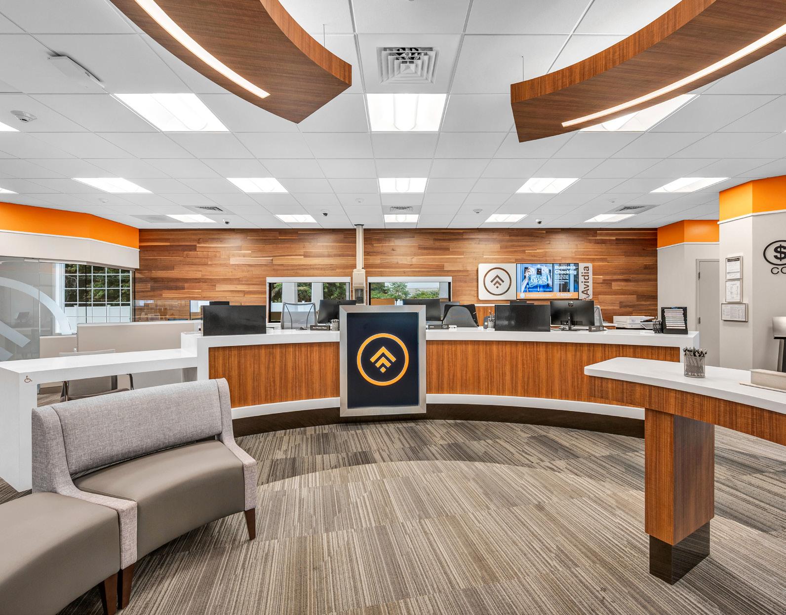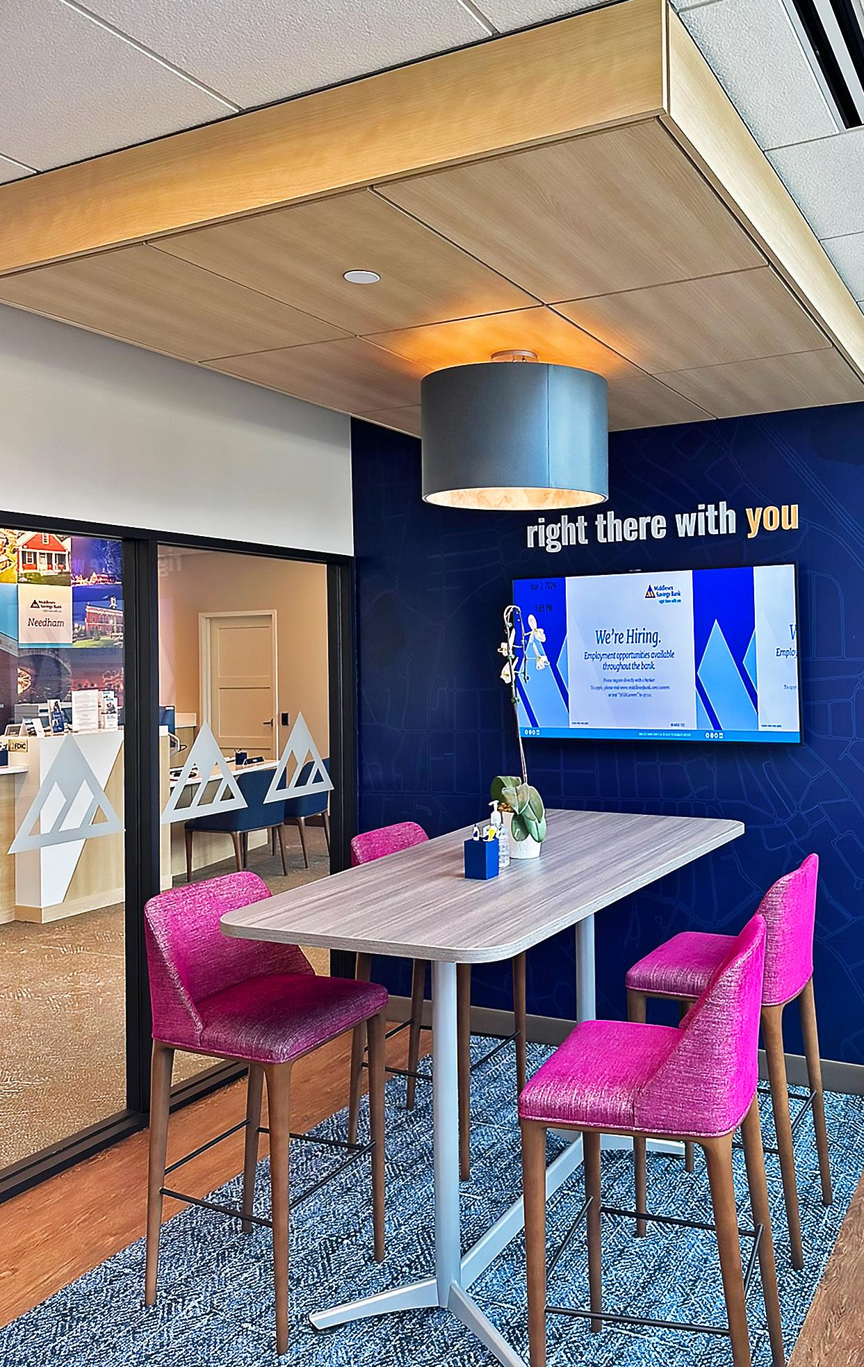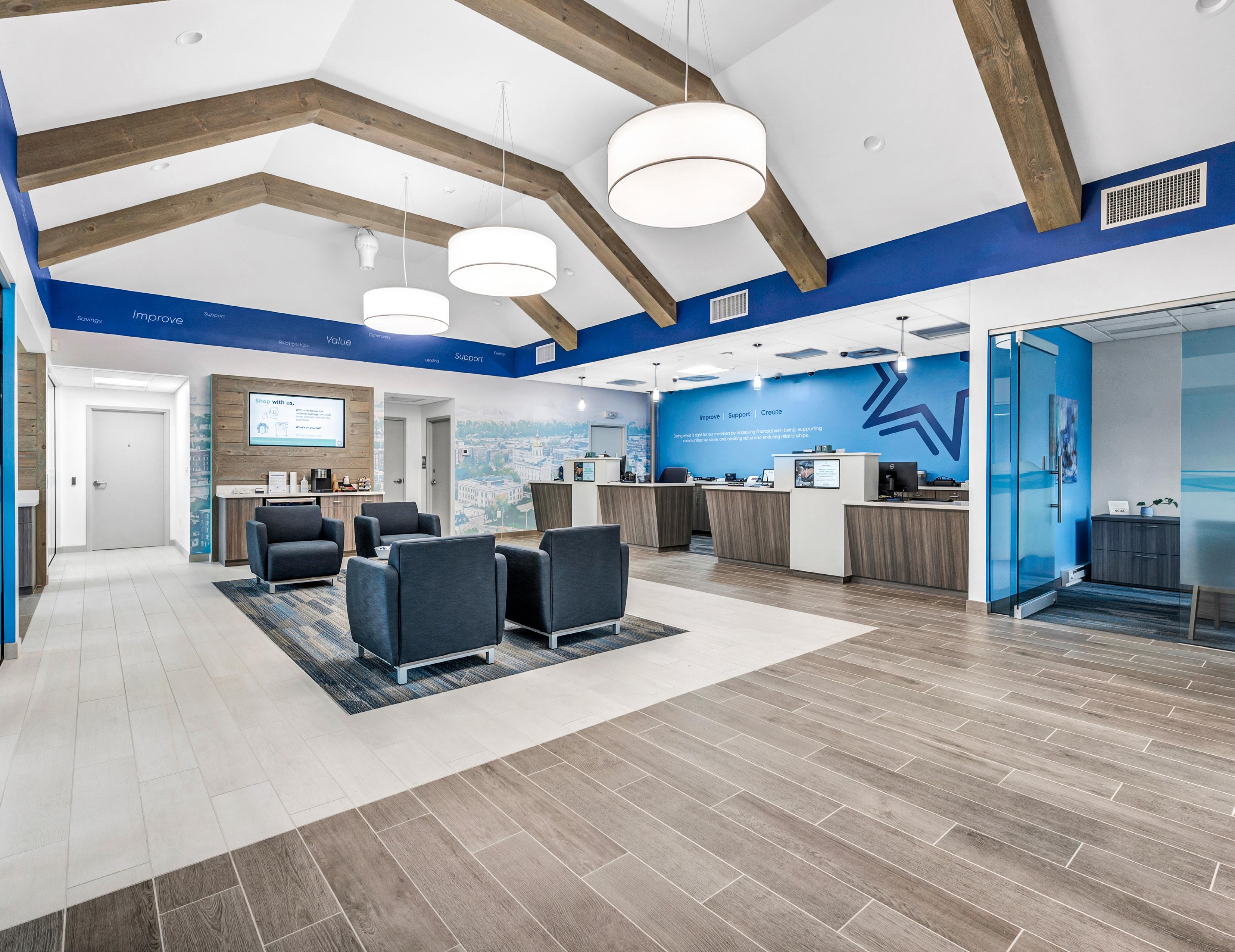 The vibrant wall mural representing Staten Island grounds customers in familiarity and pairs perfectly with the customized hexagon ceiling and the bank's brand palette consistent with their other locations.