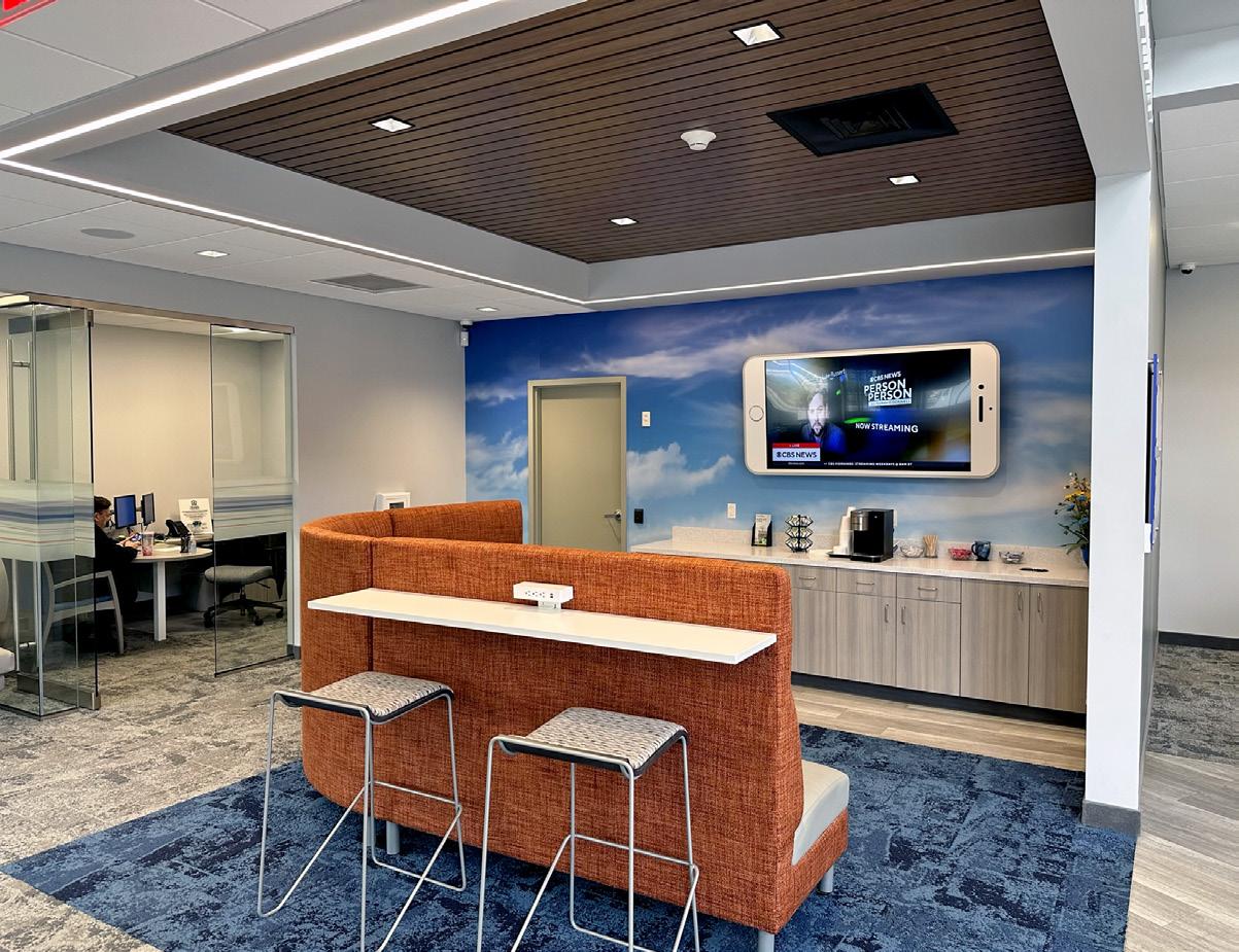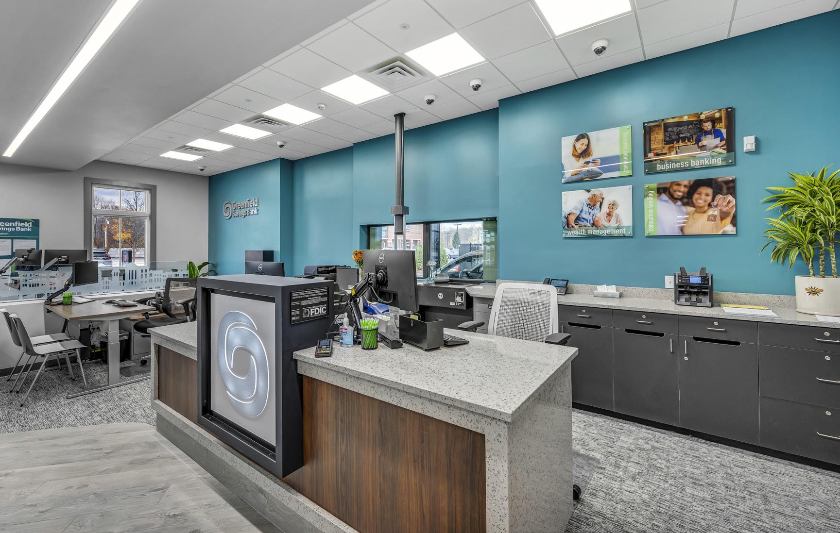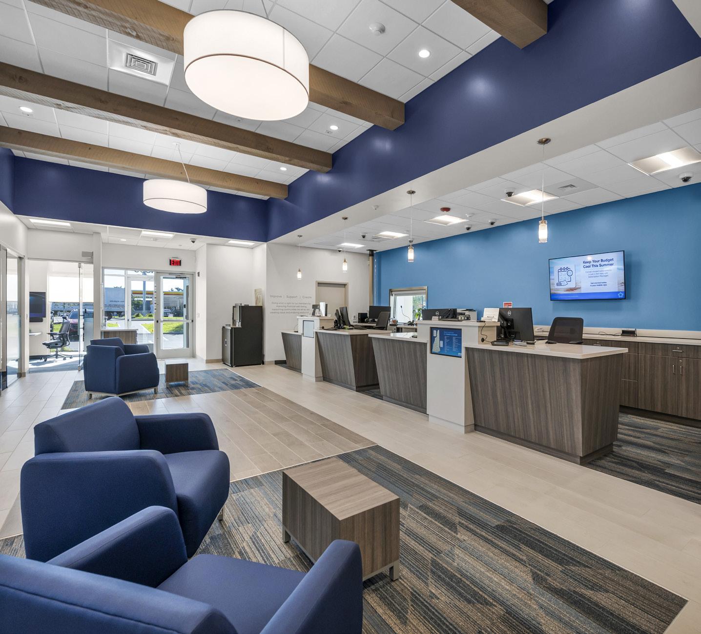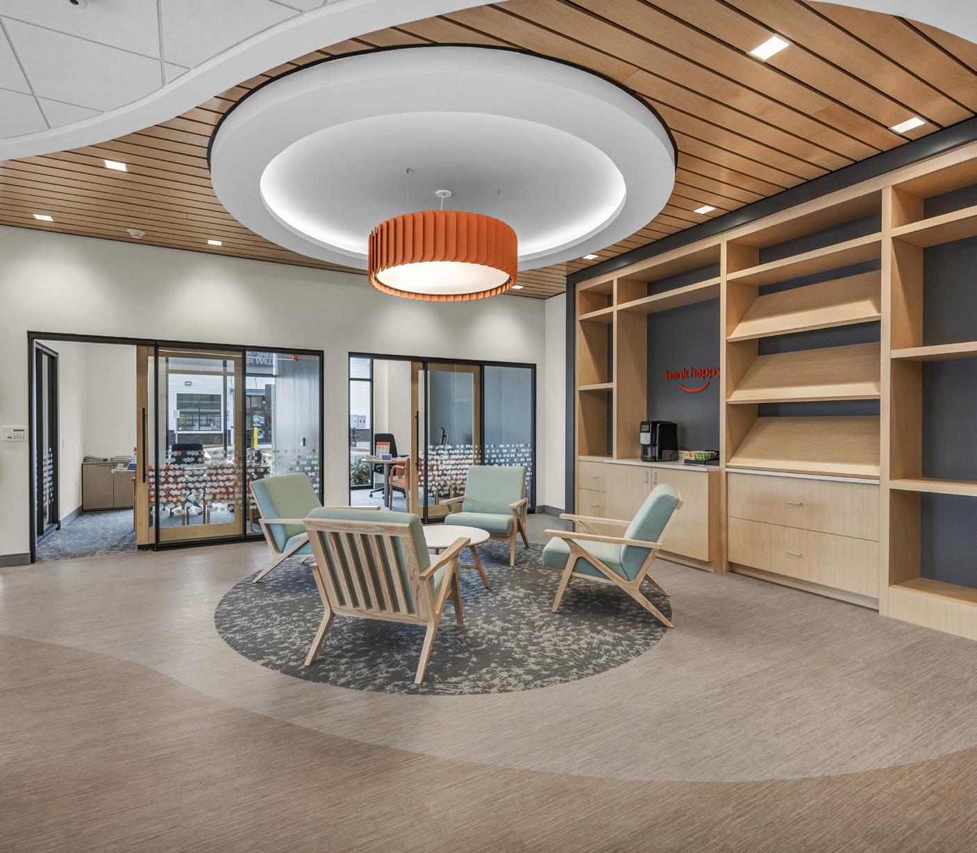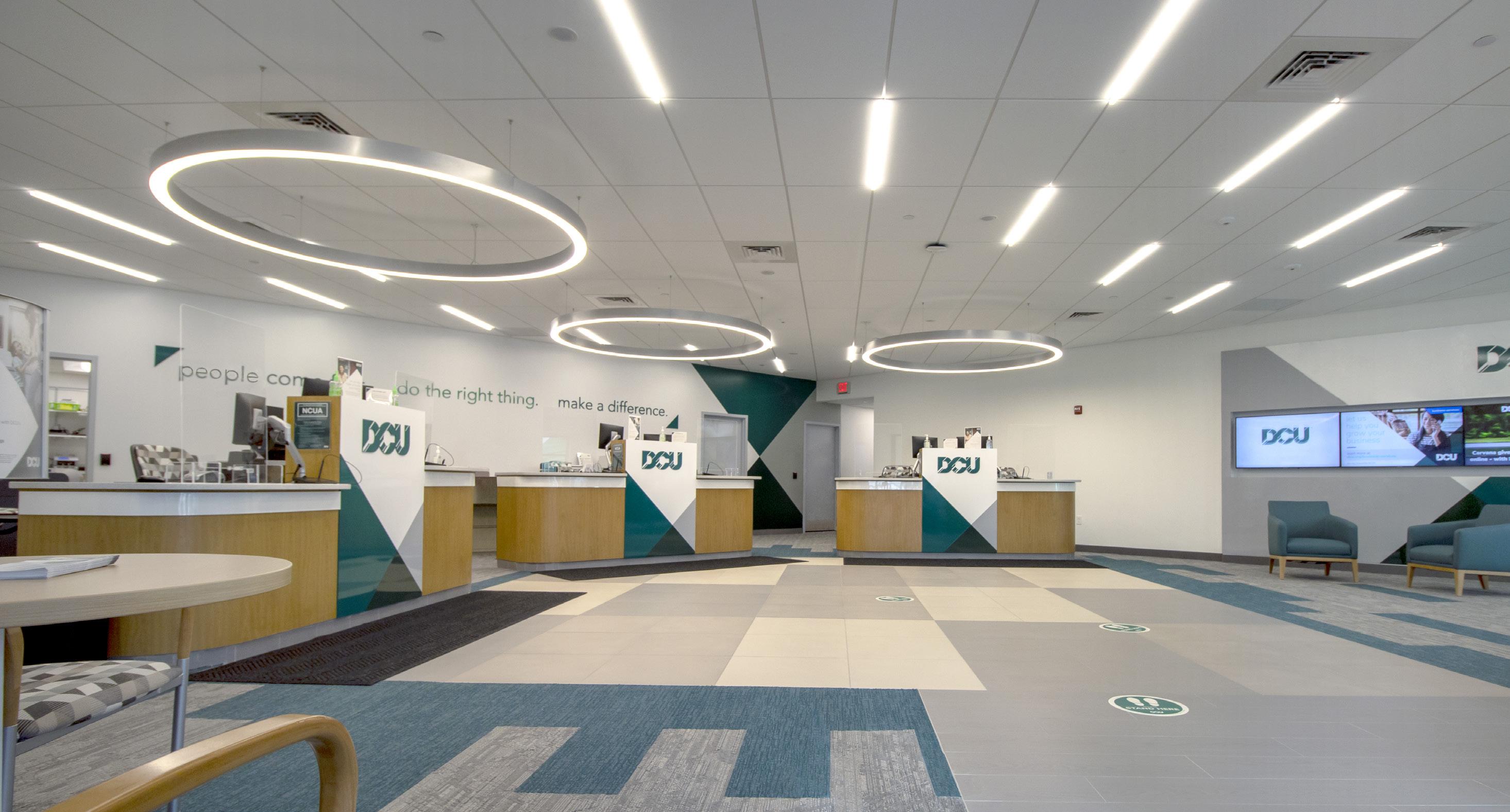 The vibrant wall mural representing Staten Island grounds customers in familiarity and pairs perfectly with the customized hexagon ceiling and the bank's brand palette consistent with their other locations.