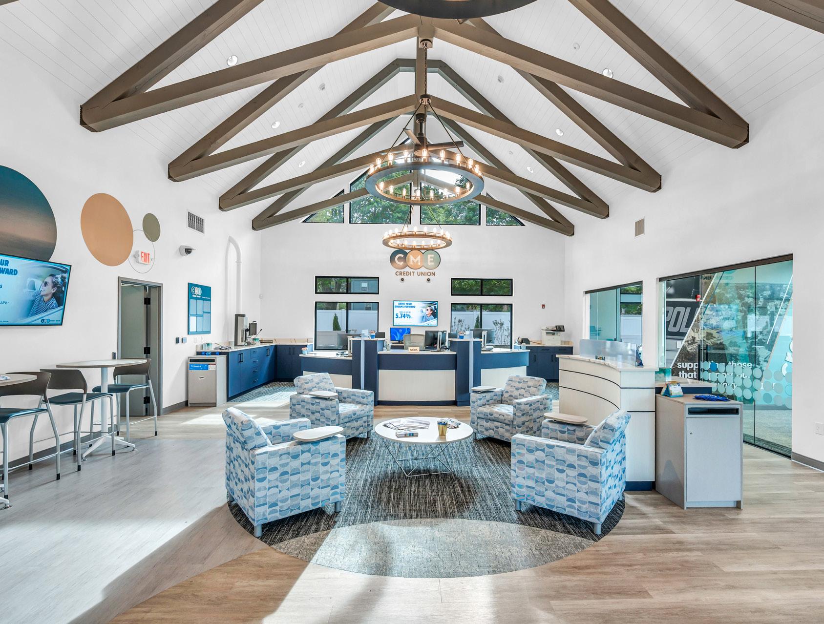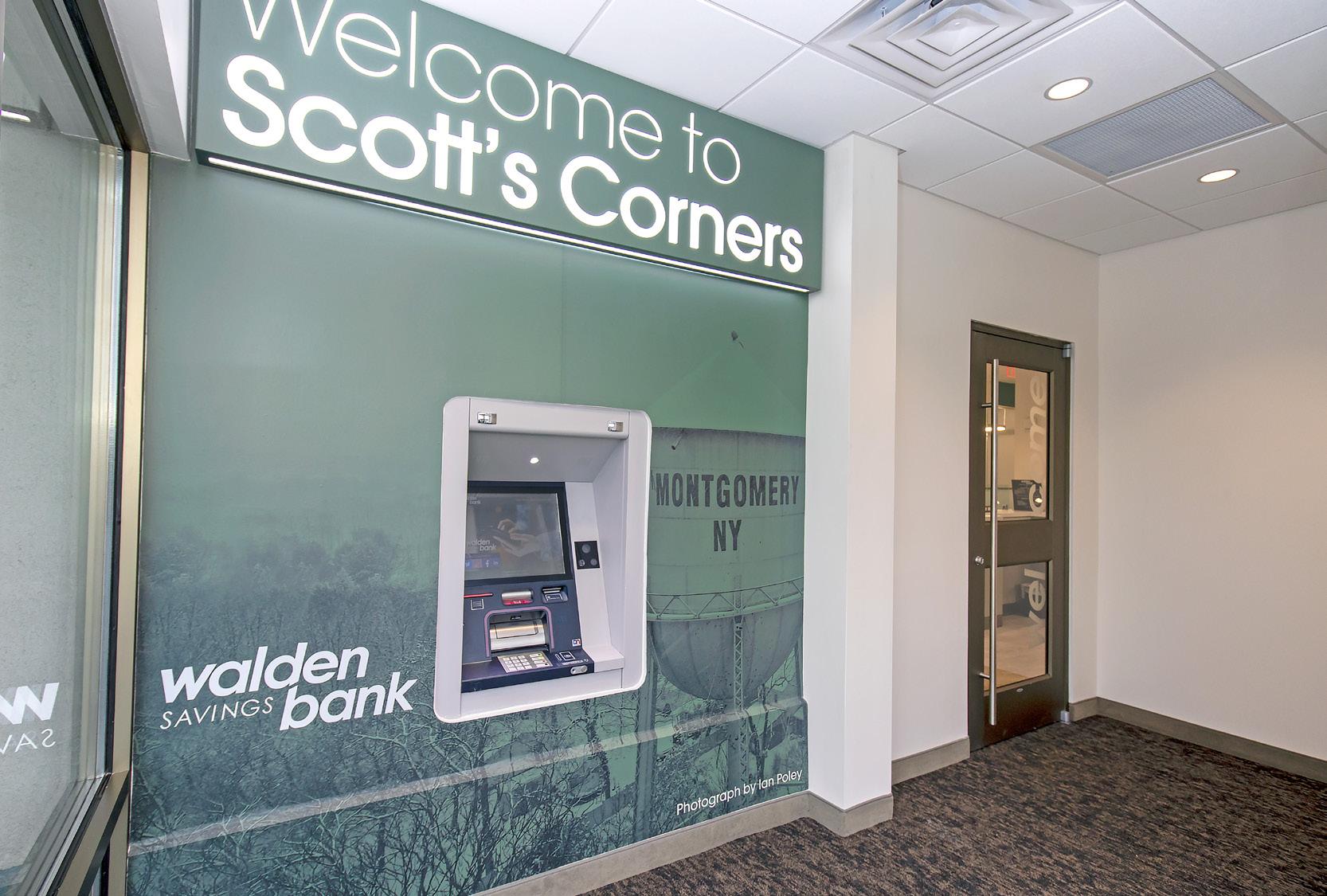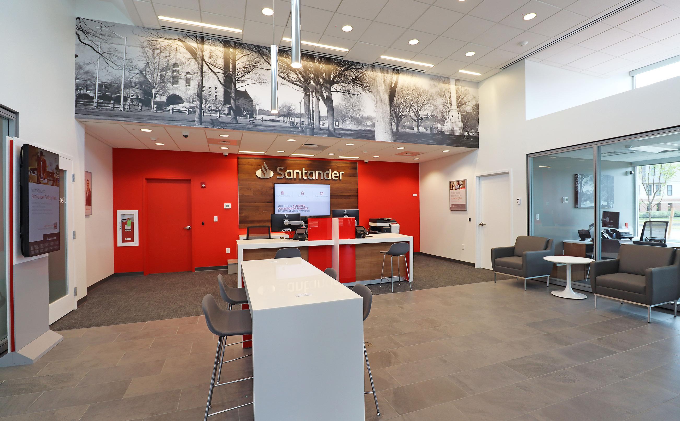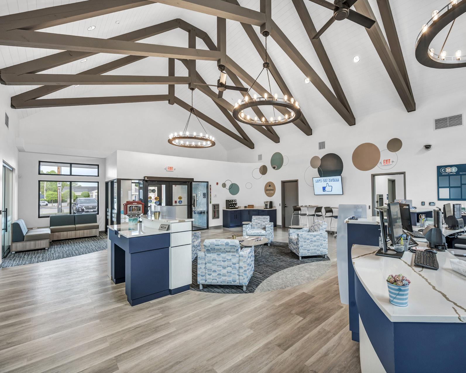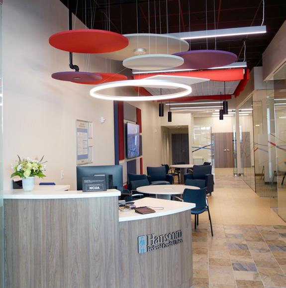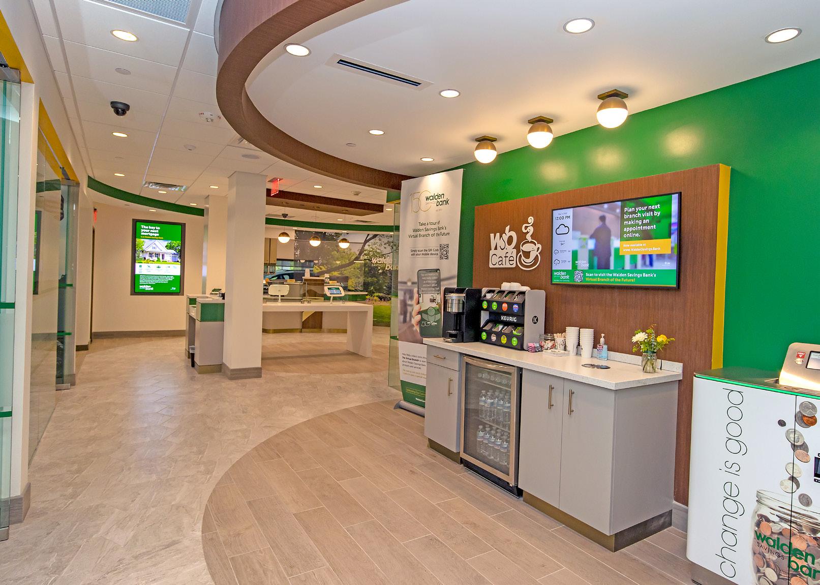 The vibrant wall mural representing Staten Island grounds customers in familiarity and pairs perfectly with the customized hexagon ceiling and the bank's brand palette consistent with their other locations.