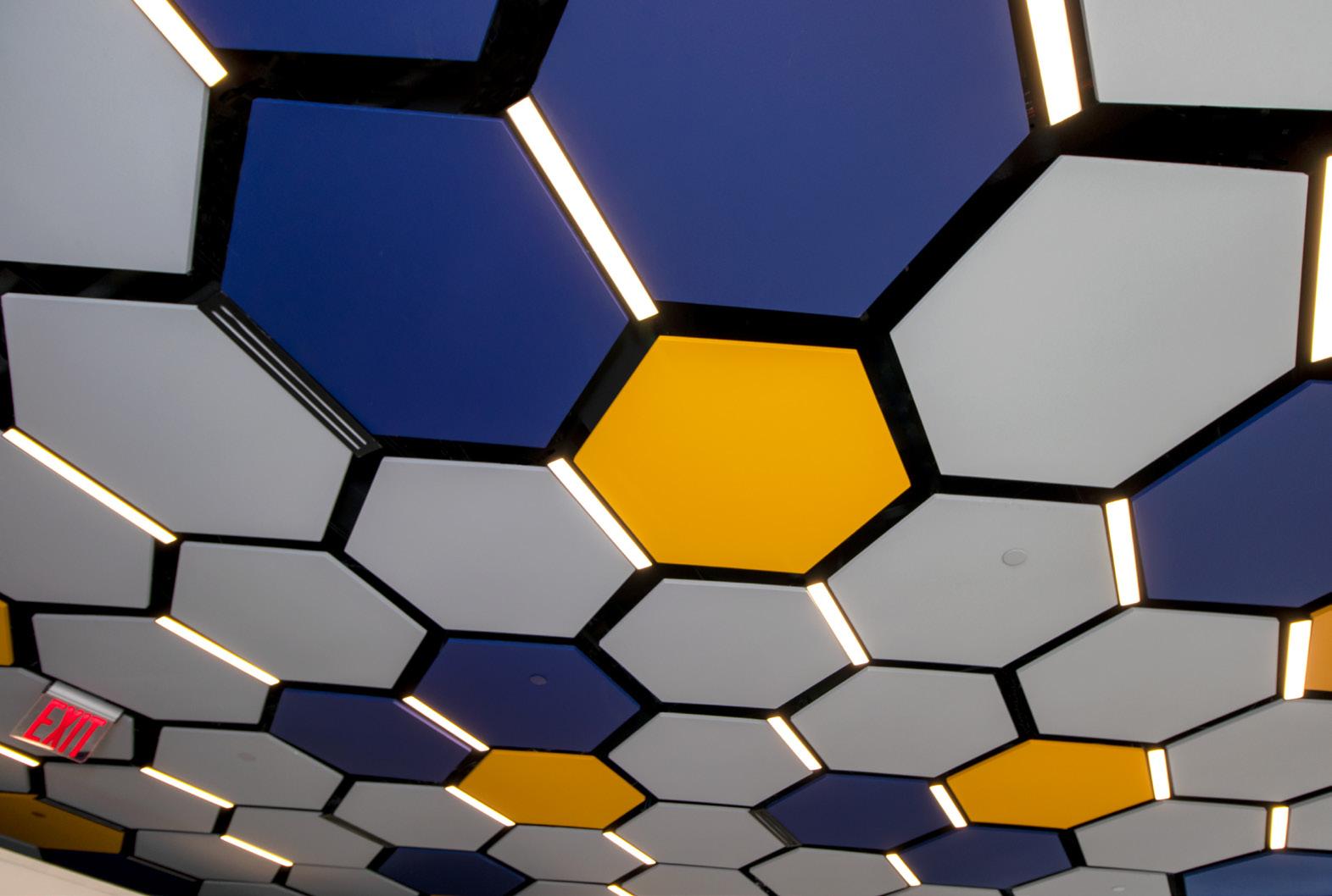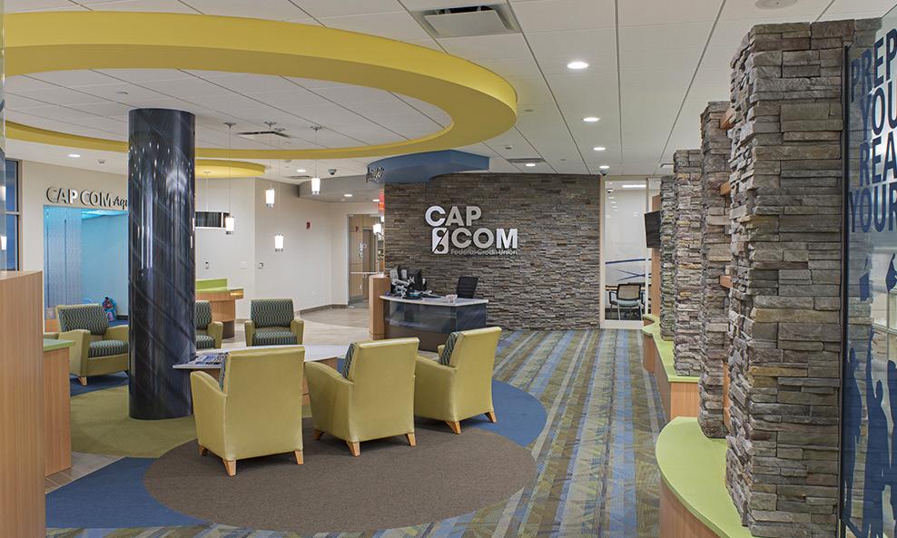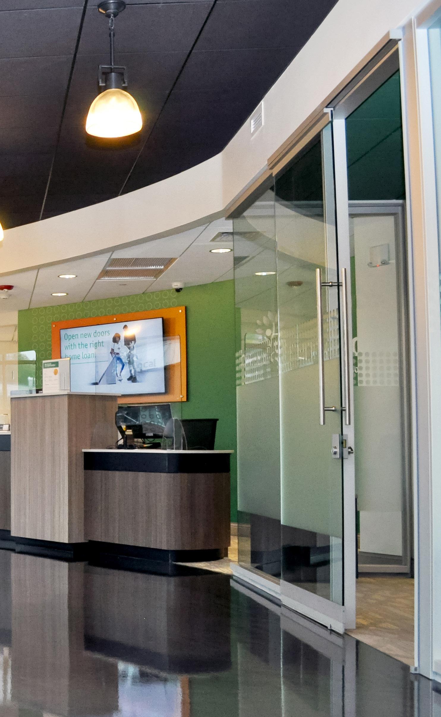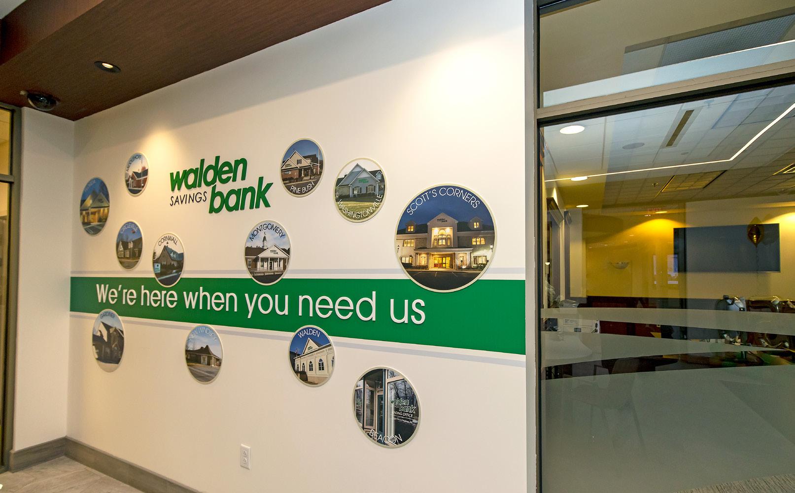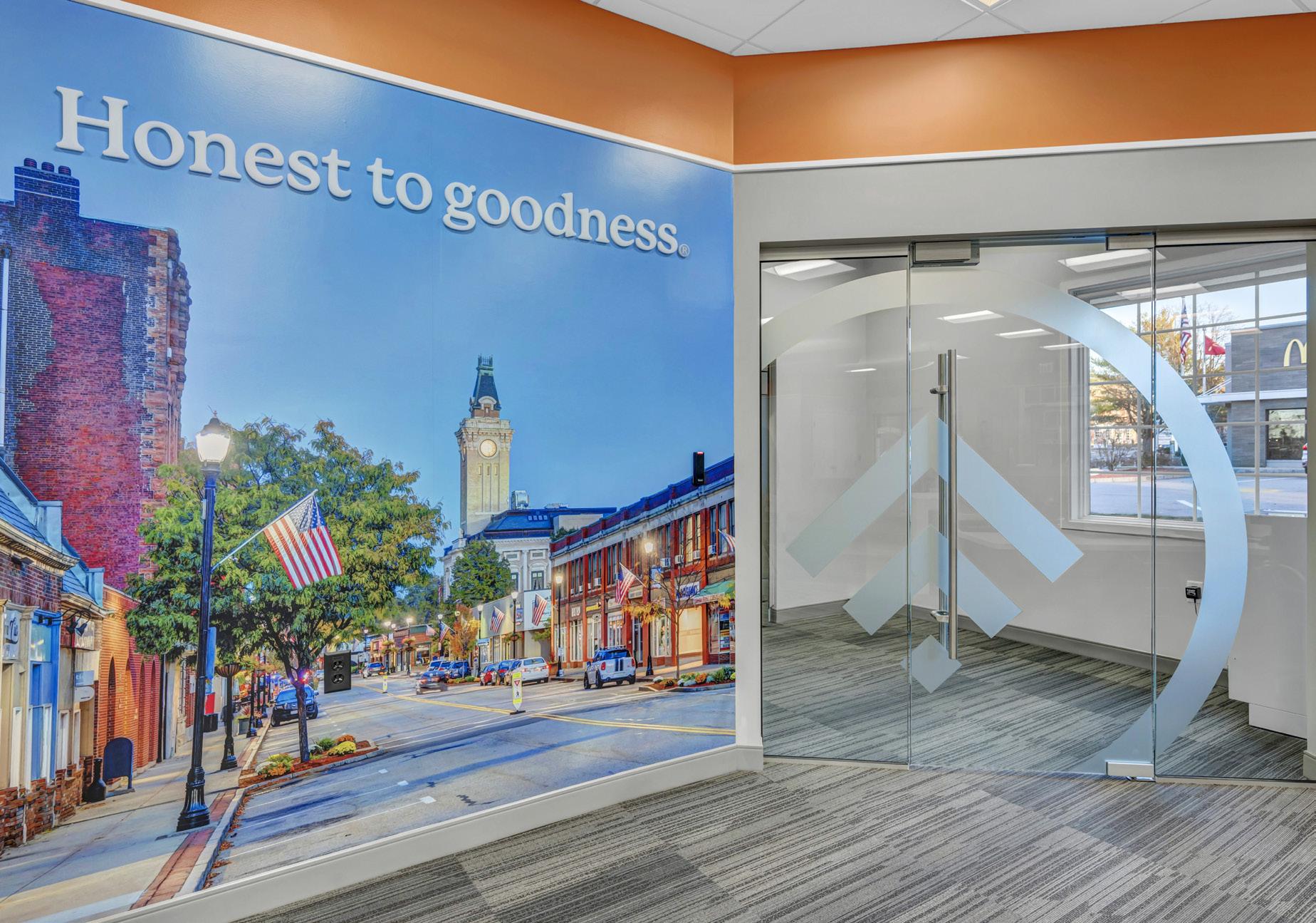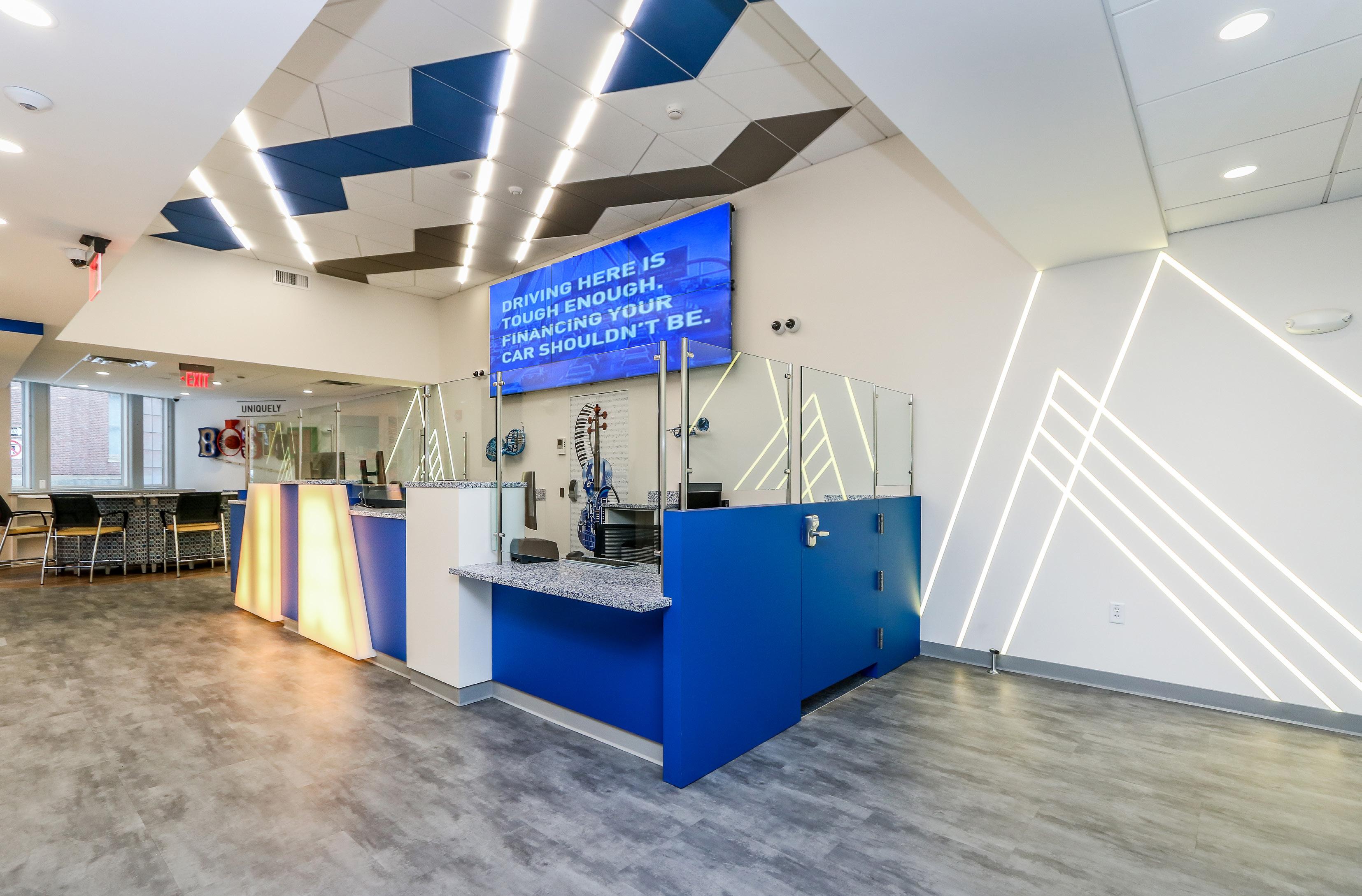 The vibrant wall mural representing Staten Island grounds customers in familiarity and pairs perfectly with the customized hexagon ceiling and the bank's brand palette consistent with their other locations.