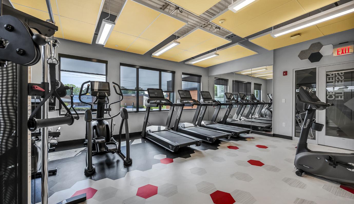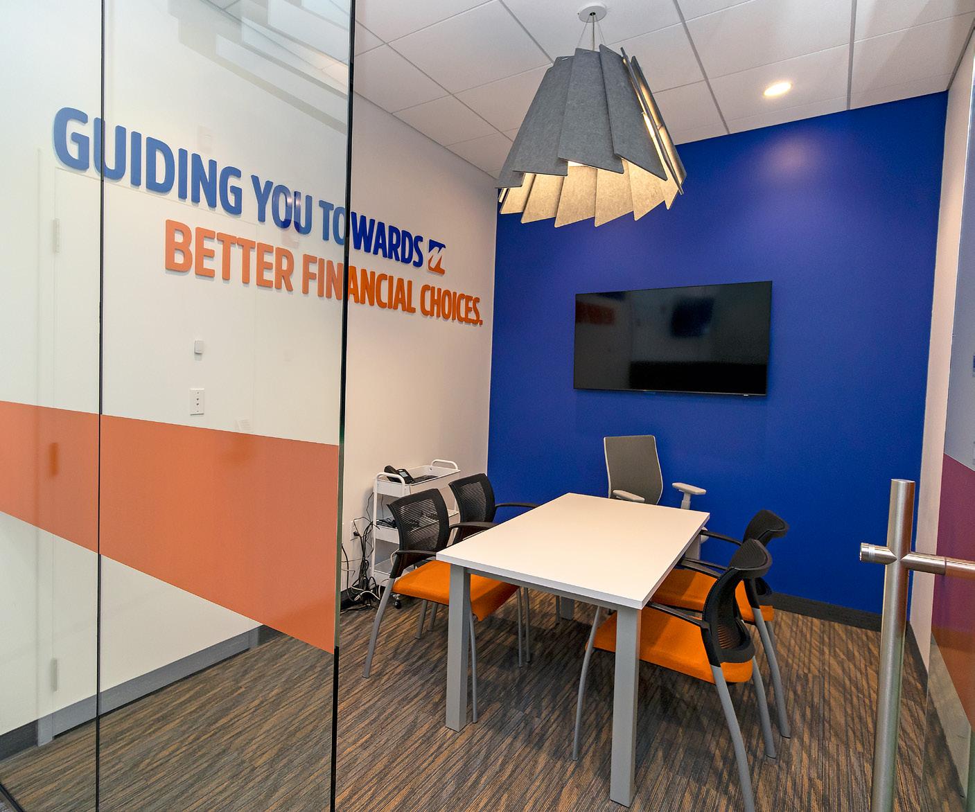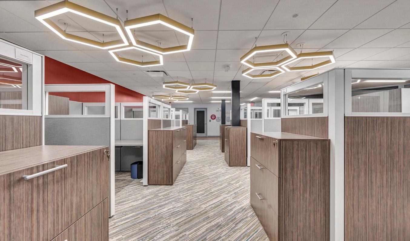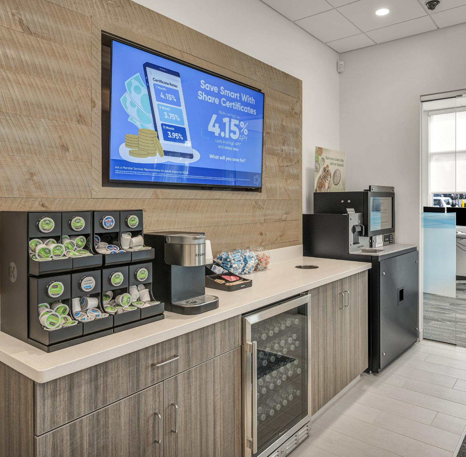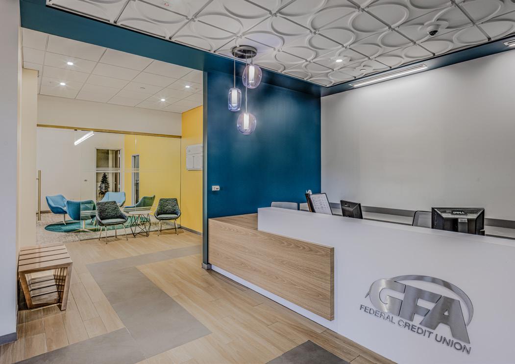 The vibrant wall mural representing Staten Island grounds customers in familiarity and pairs perfectly with the customized hexagon ceiling and the bank's brand palette consistent with their other locations.
