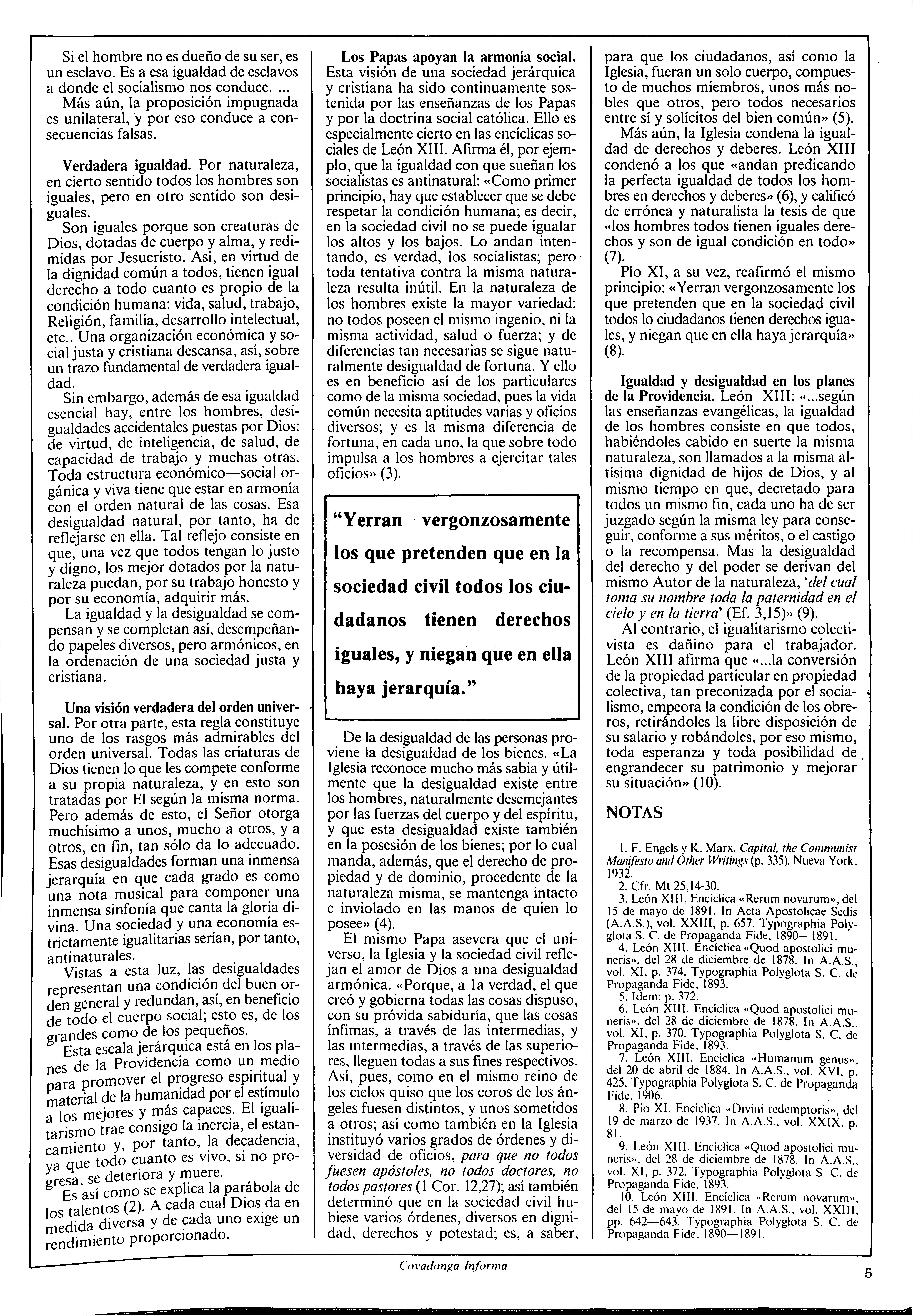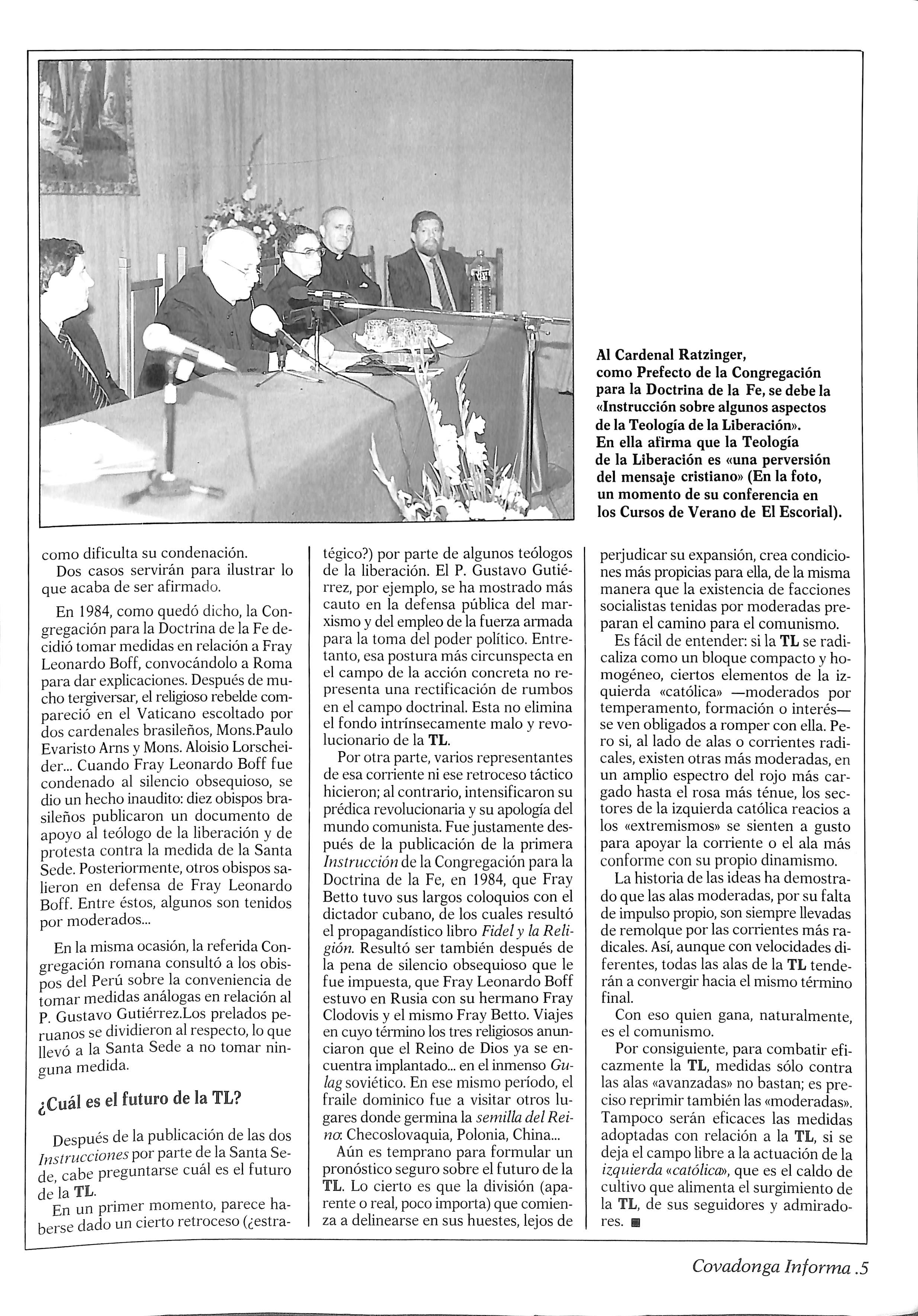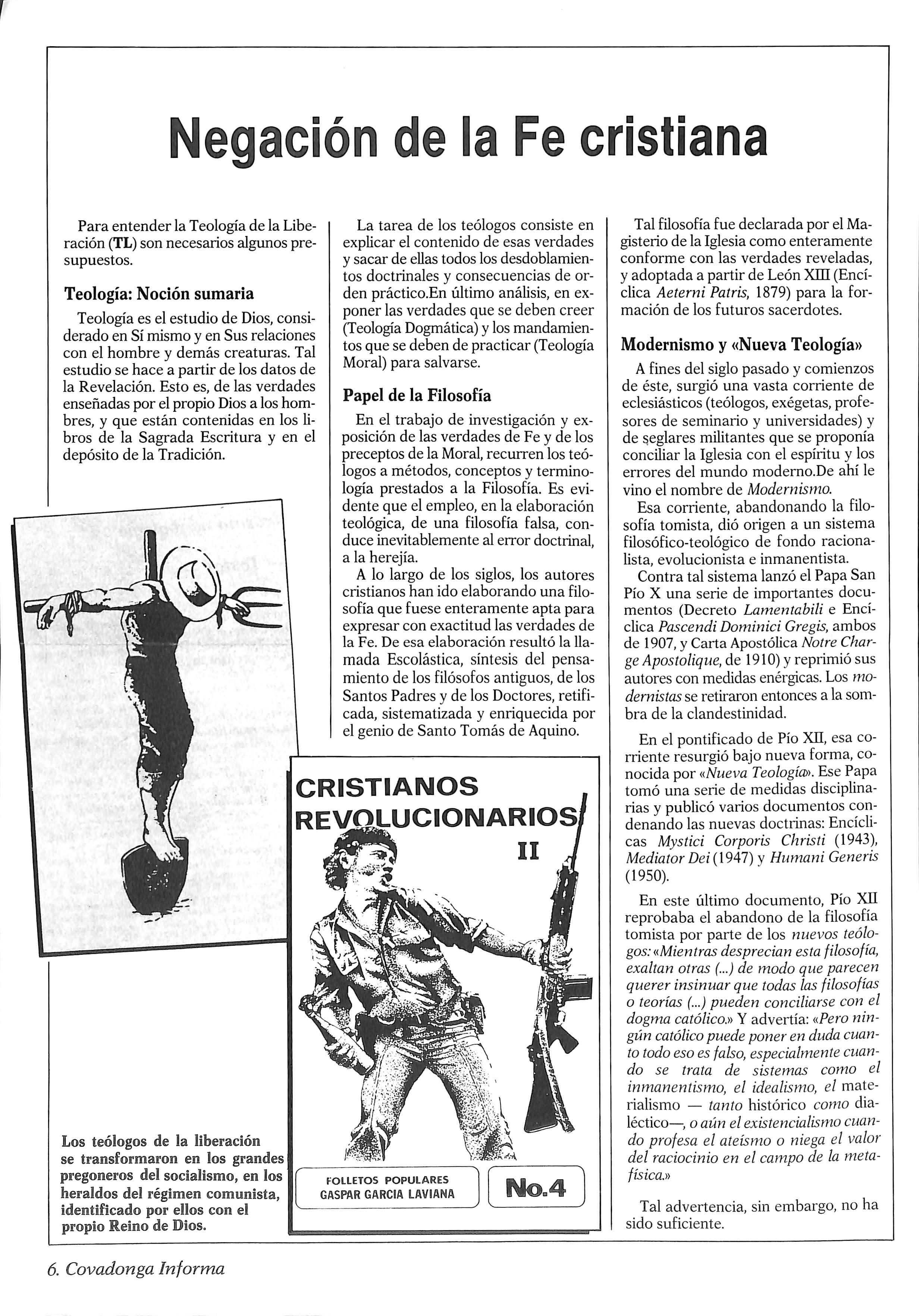 A pesar de esto, otros son condescencientes, simpatizantes, y hasta se identifican con el marxismo. Es sobre esta infiltra ción del comunismo en la "Teología de la Liberación" —tan difundida en el izquierdismo católico chileno— que la Santa Sede viene últimamente advirtiendo a los católicos por medio del Cardenal Ratzinger, pues en ella se encuentra un gravísimo peligro para la Fe.