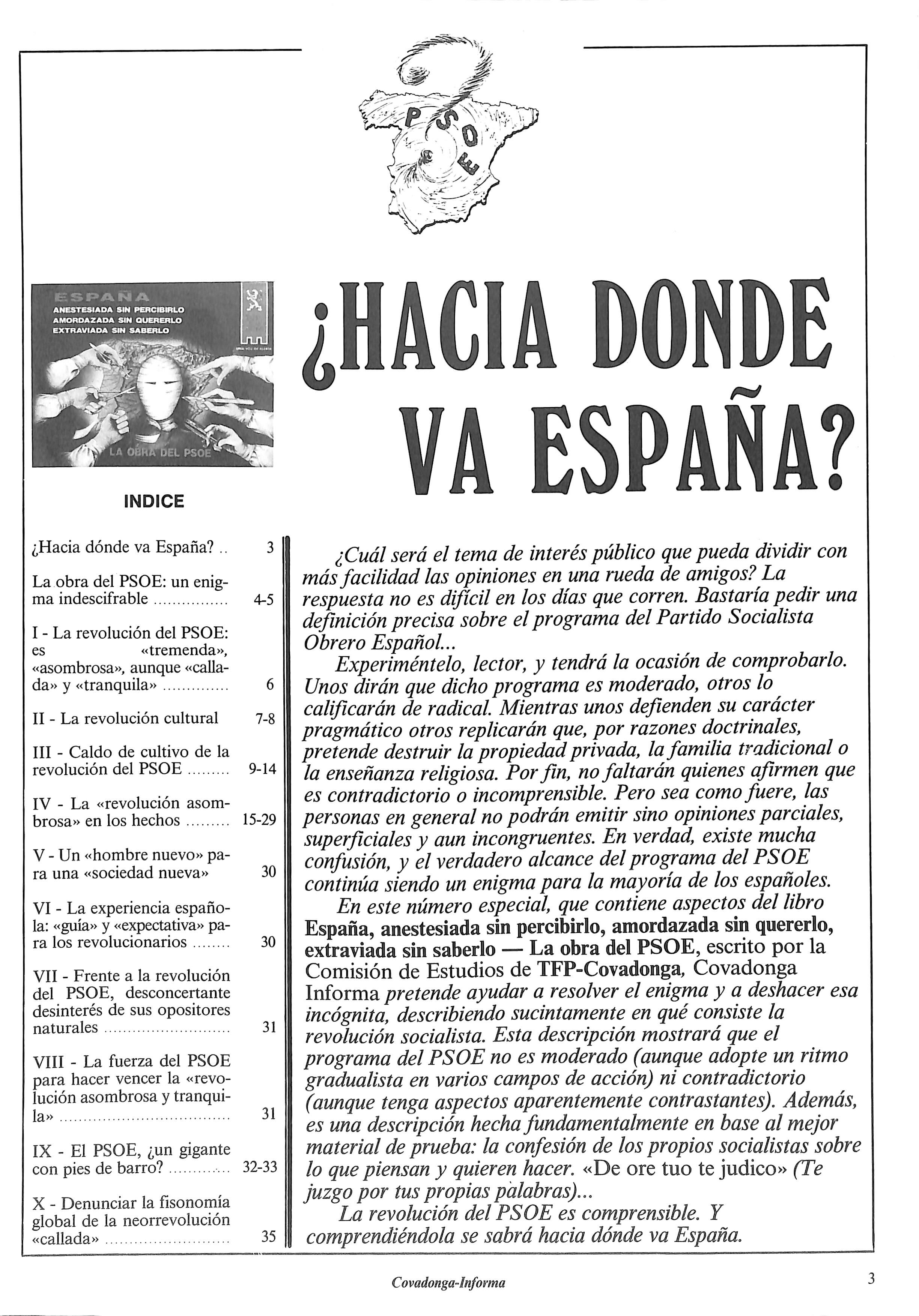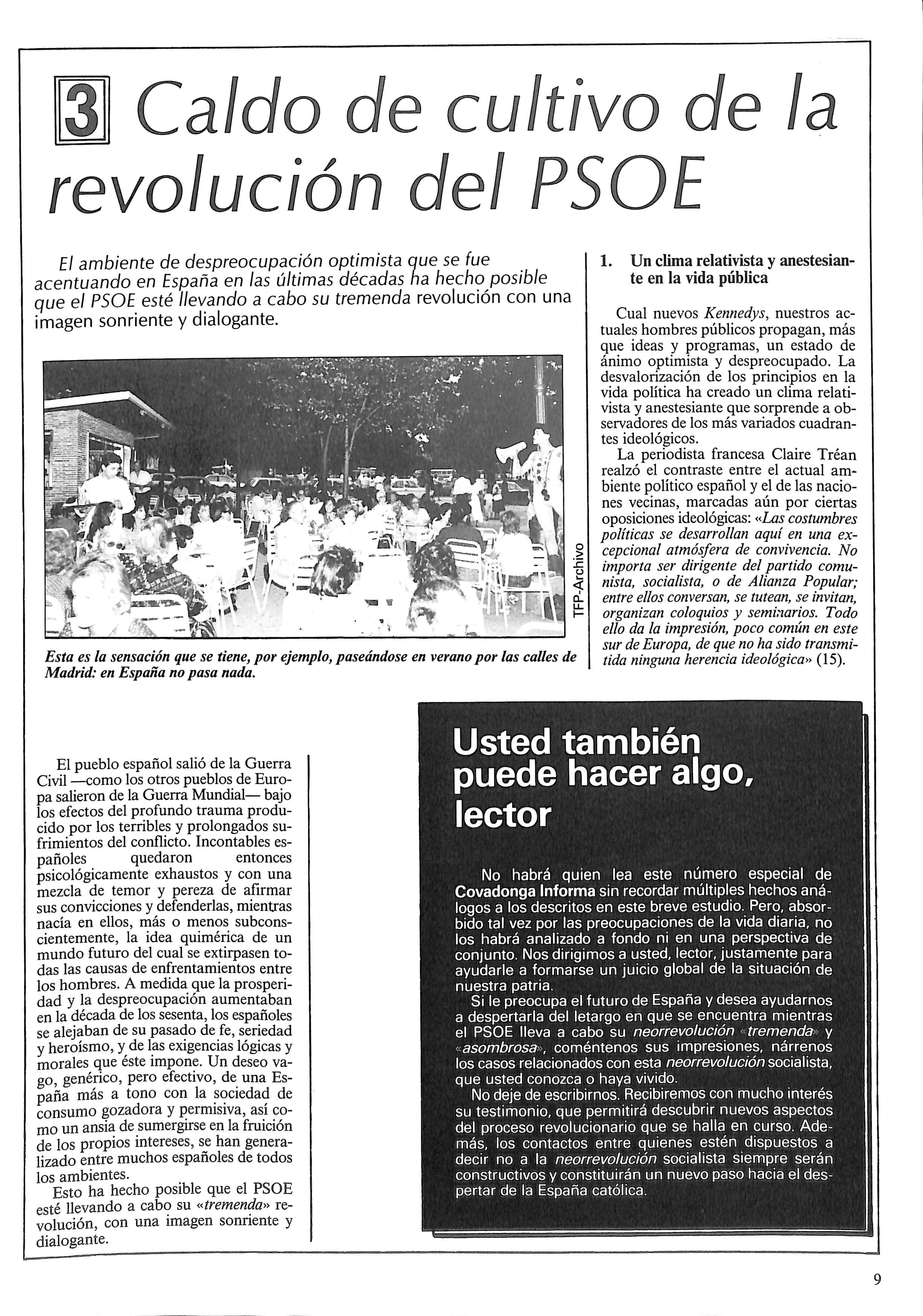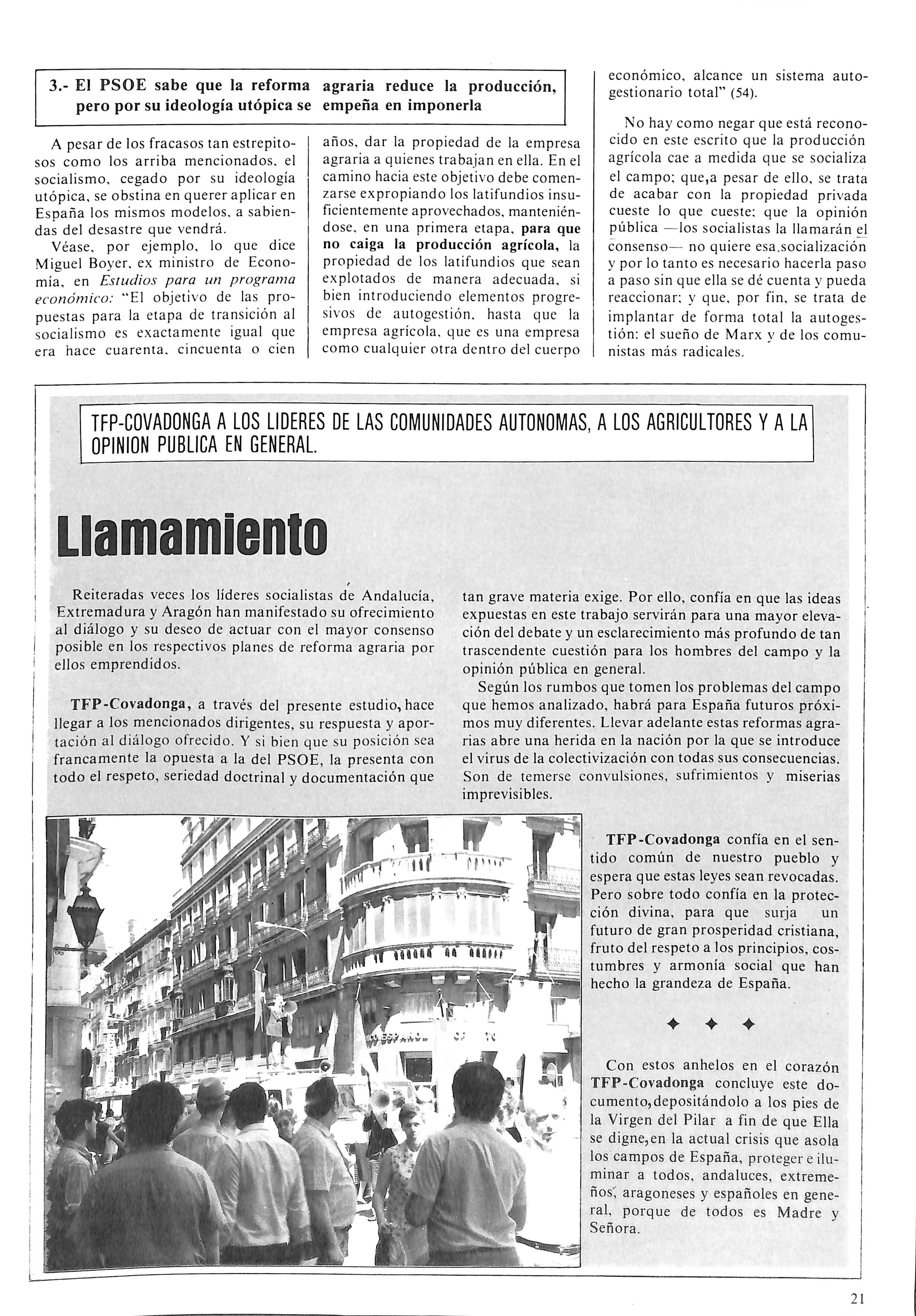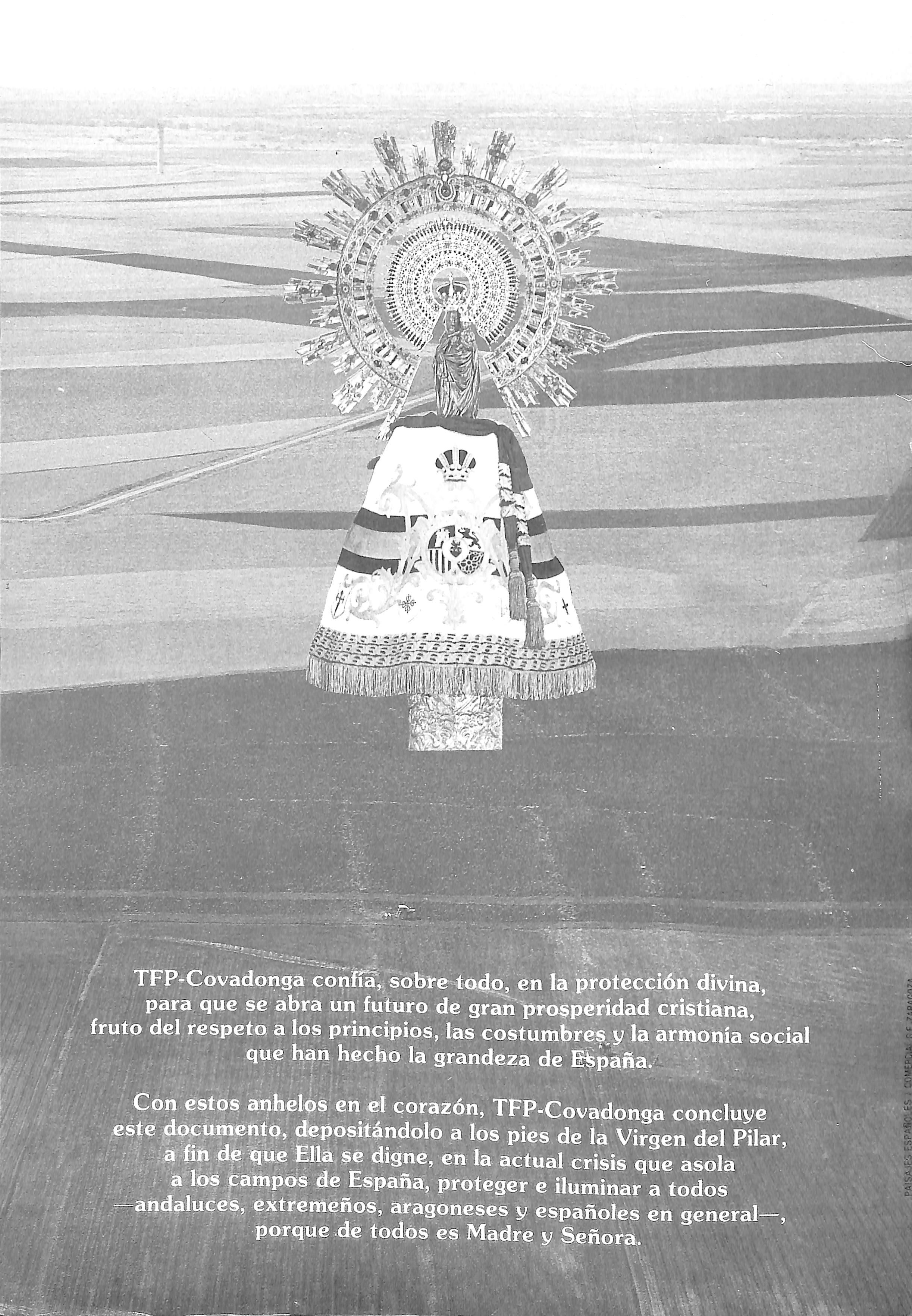 2TFP-Covadonga actúa,en base a las enseñanzas tradicionales del Supremo Magisterio de la Iglesia, para preservar a España contra la expansión —llena de tretas, pero no por eso menos rápida—de los errores del socialismo y del comunismo. Nuestra entidad violaría sus deberes más elemen tales si omitiese su palabra de esclareci miento en un momento tan trascenden tal. Para ello hace uso de la libertad de expresión que le concede el artículo 20.1. de la Constitución.