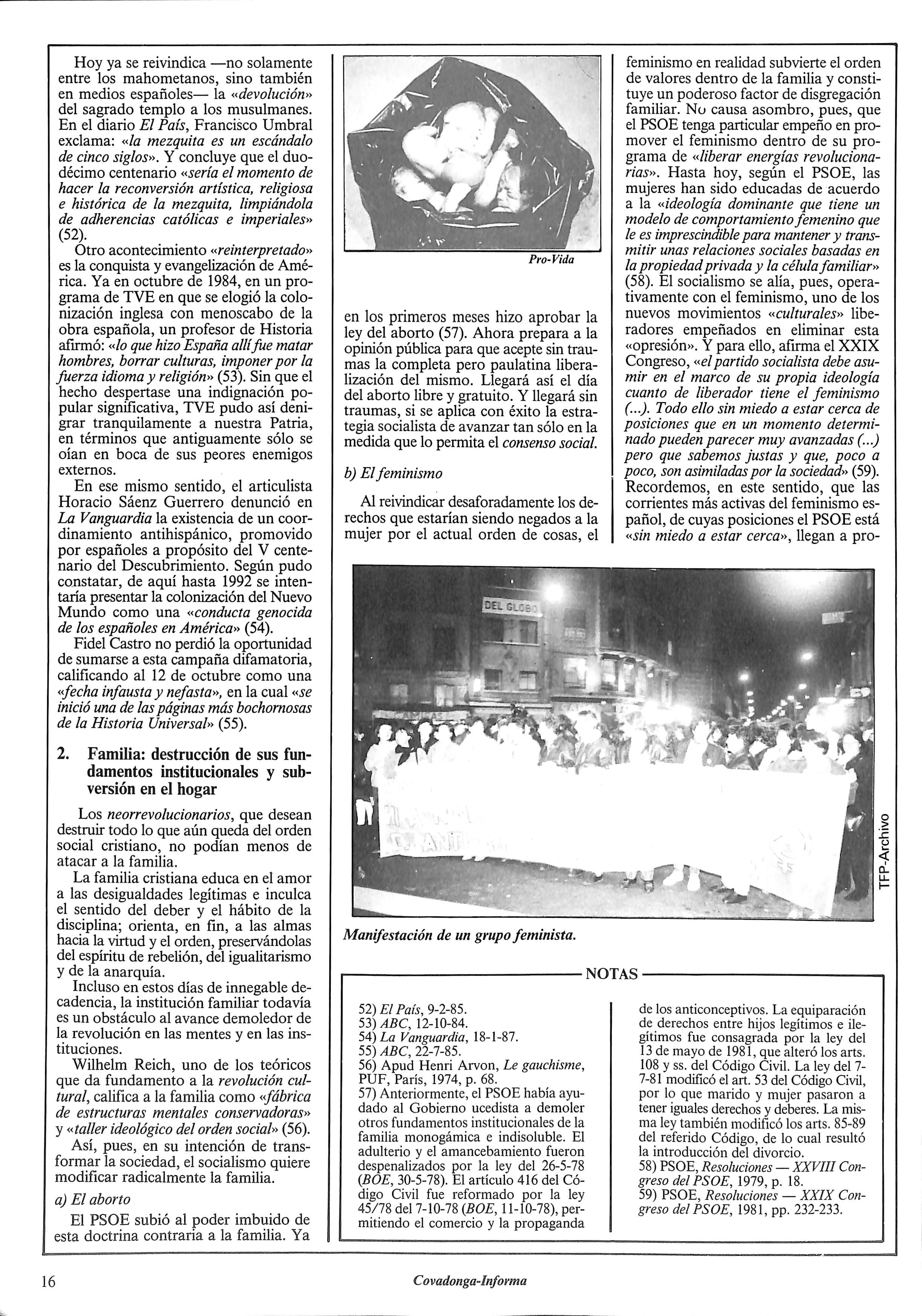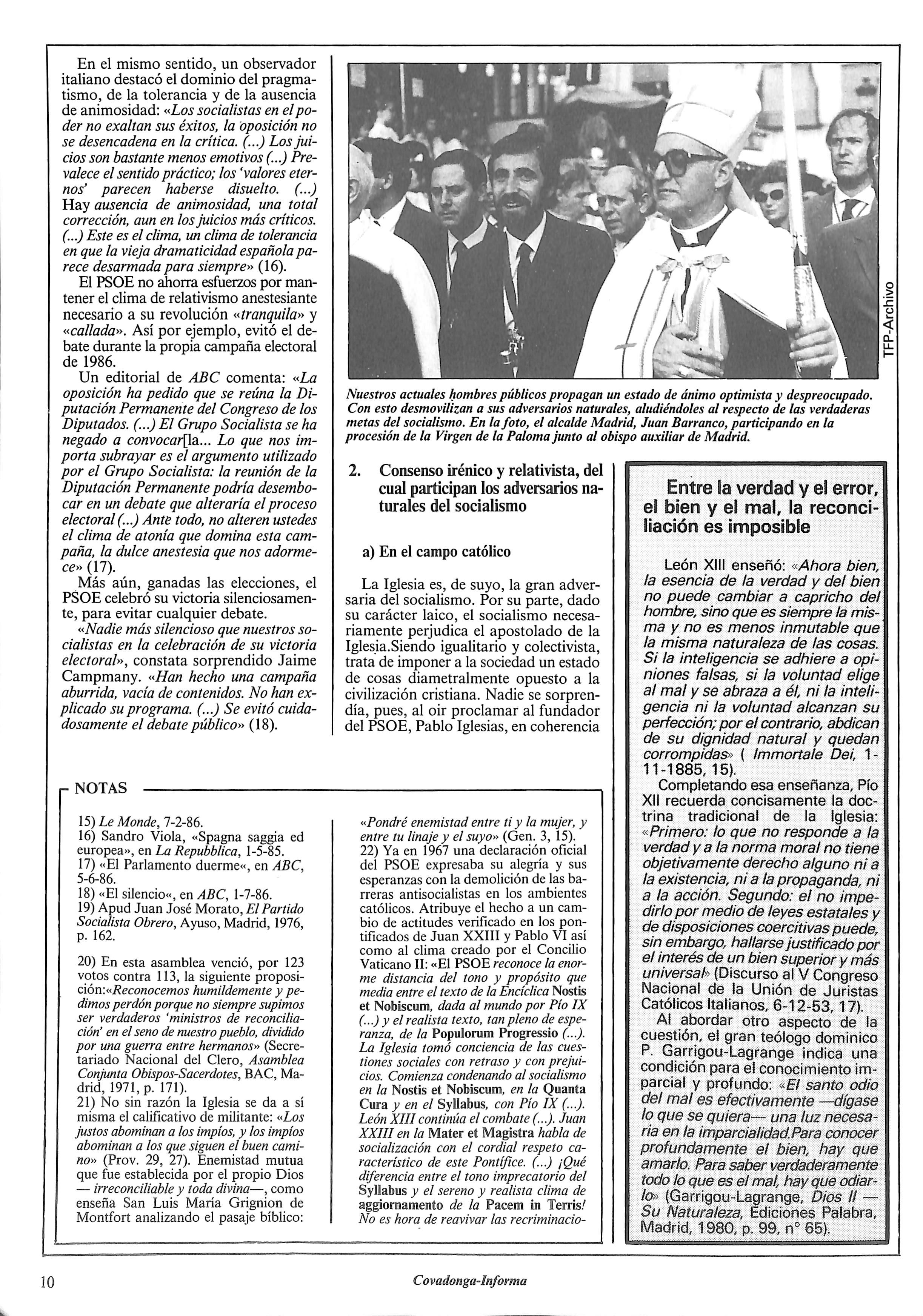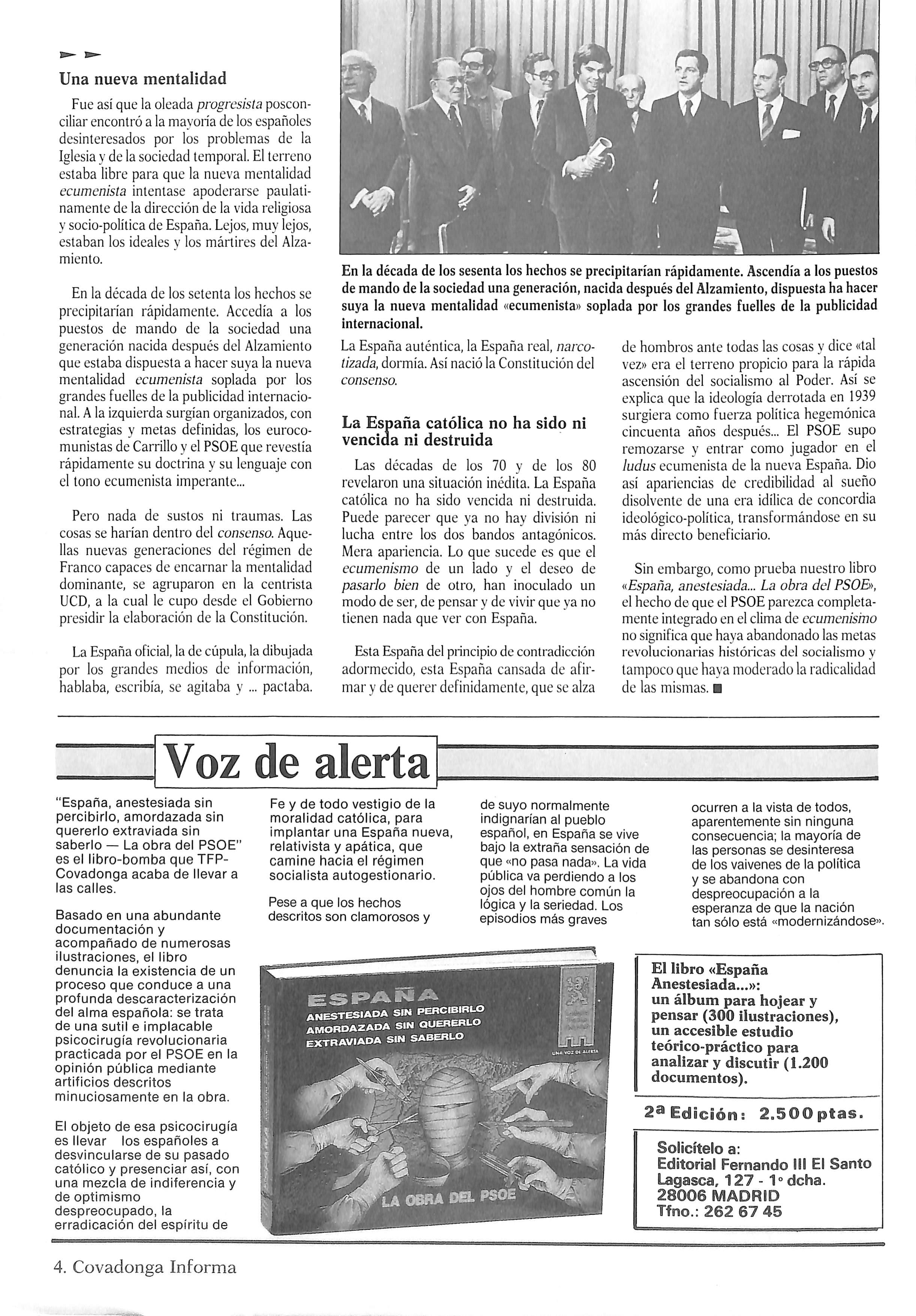 2TFP-Covadonga actúa,en base a las enseñanzas tradicionales del Supremo Magisterio de la Iglesia, para preservar a España contra la expansión —llena de tretas, pero no por eso menos rápida—de los errores del socialismo y del comunismo. Nuestra entidad violaría sus deberes más elemen tales si omitiese su palabra de esclareci miento en un momento tan trascenden tal. Para ello hace uso de la libertad de expresión que le concede el artículo 20.1. de la Constitución.
