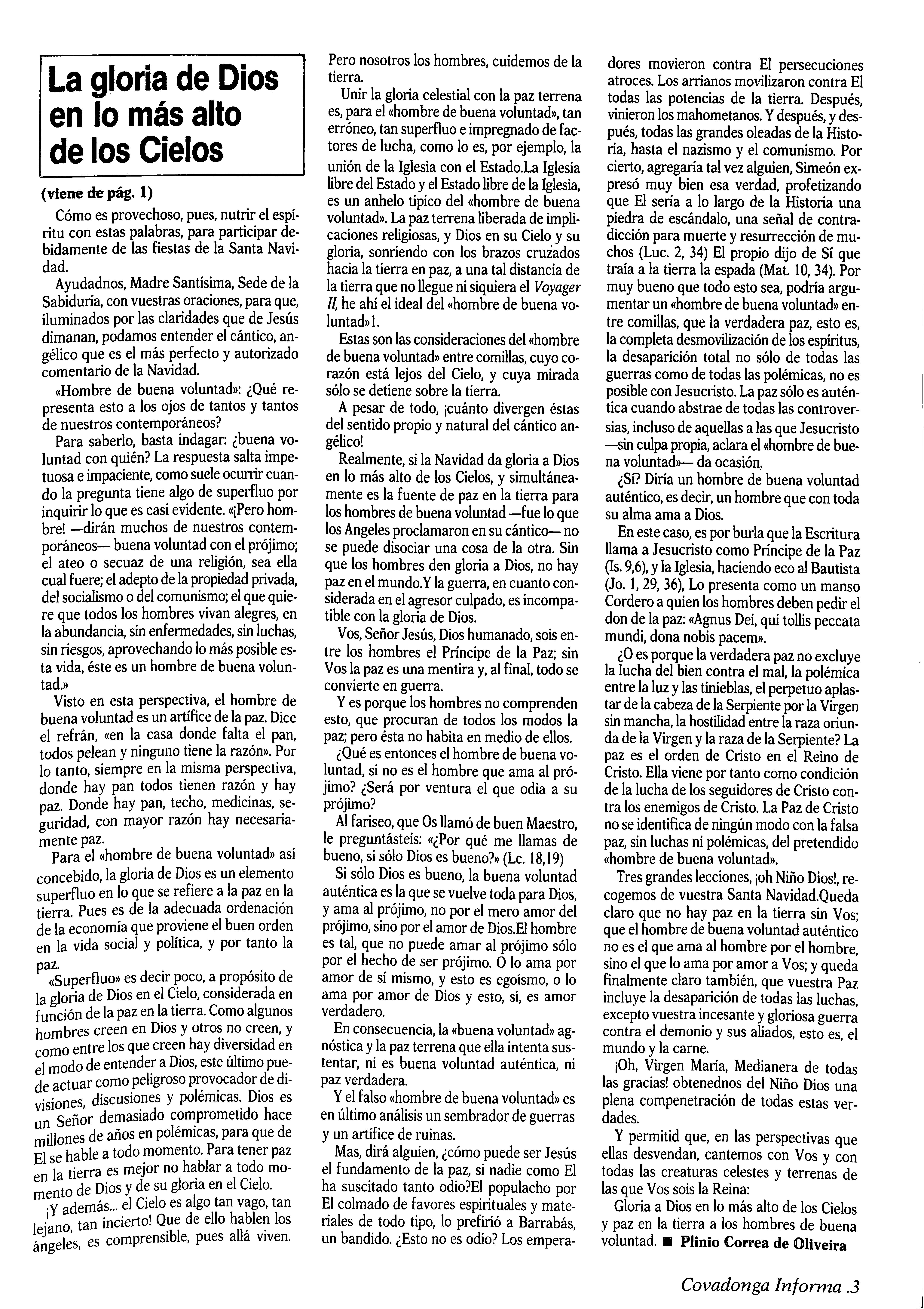 guetes poco recomendables. La presión de los compañeros,la propaganda televisiva,o mil otros motivos pueden llevarle a ello. Recuerden,entonces,los padres que estas cosas no son indiferentes, que los juguetes son algo más que juguetes, y traten de co rregir en sus hijos estas tendencias y reavi var en ellos la llama de la inocencia. La tarea puede ser difícil, pero no por ello va a abandonarse.Tengamos en cuenta que desde el pobre pesebre en que fue amoro samente depositado por la Virgen, el Niño Jesús nos sonríe y parece decirnos: «Lo que a tí te parece imposible, para mí es fácil. Aunque me veas pequeño y aparentemente indefenso,no olvides que soy Dios, y que un simple deseo mío puede cambiarlo todo. Mí rame,embébete en mi inocencia,considera la bondad de la Madre de Misericordia que me acuna y, por medio de Ella, pídeme aque llo que desees. Ninguno de los que han lla mado a mi puerta para pedirme gracias de vida eterna han sido por mí desamparados.»
