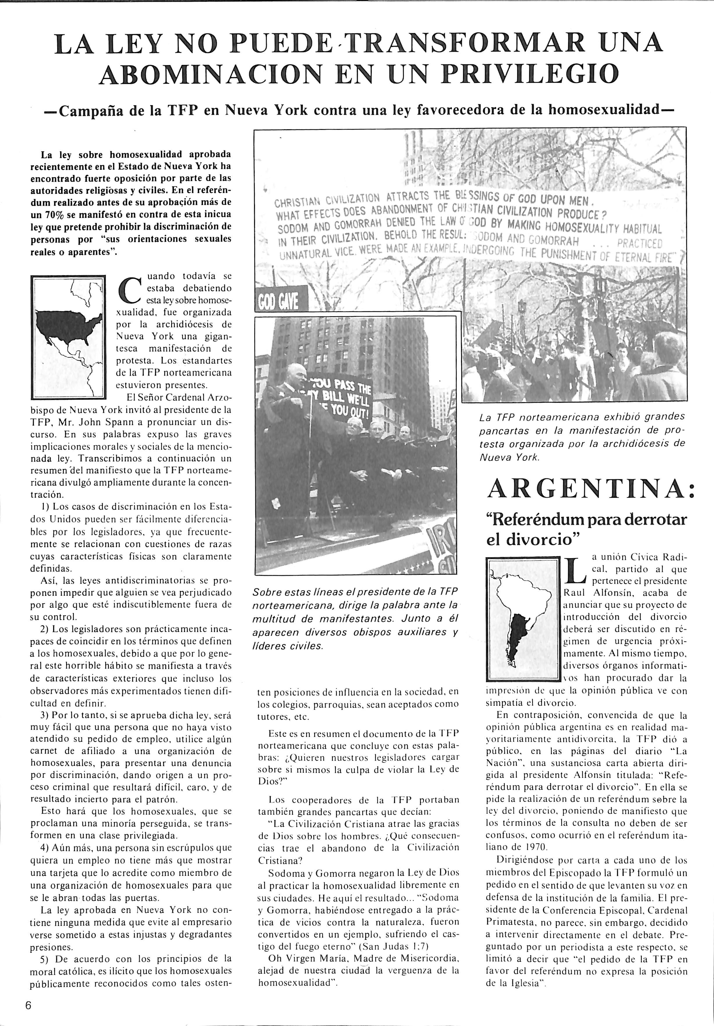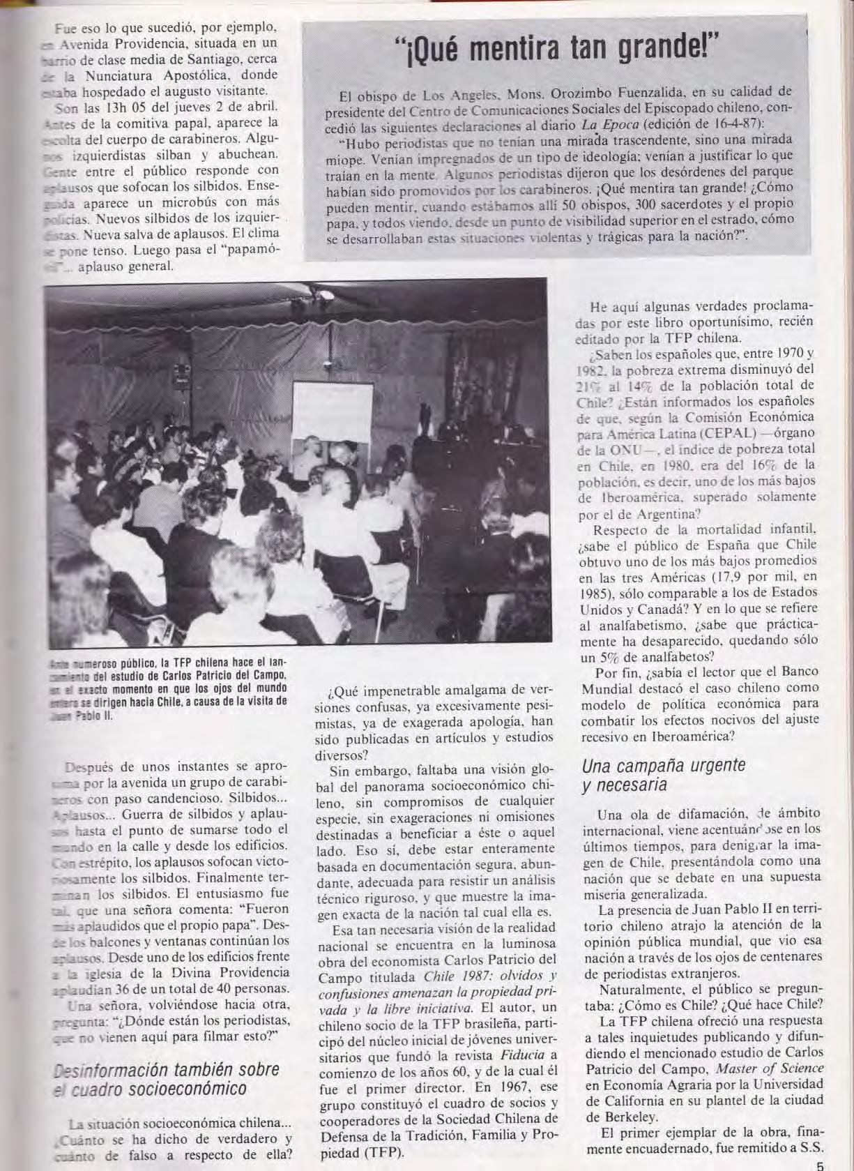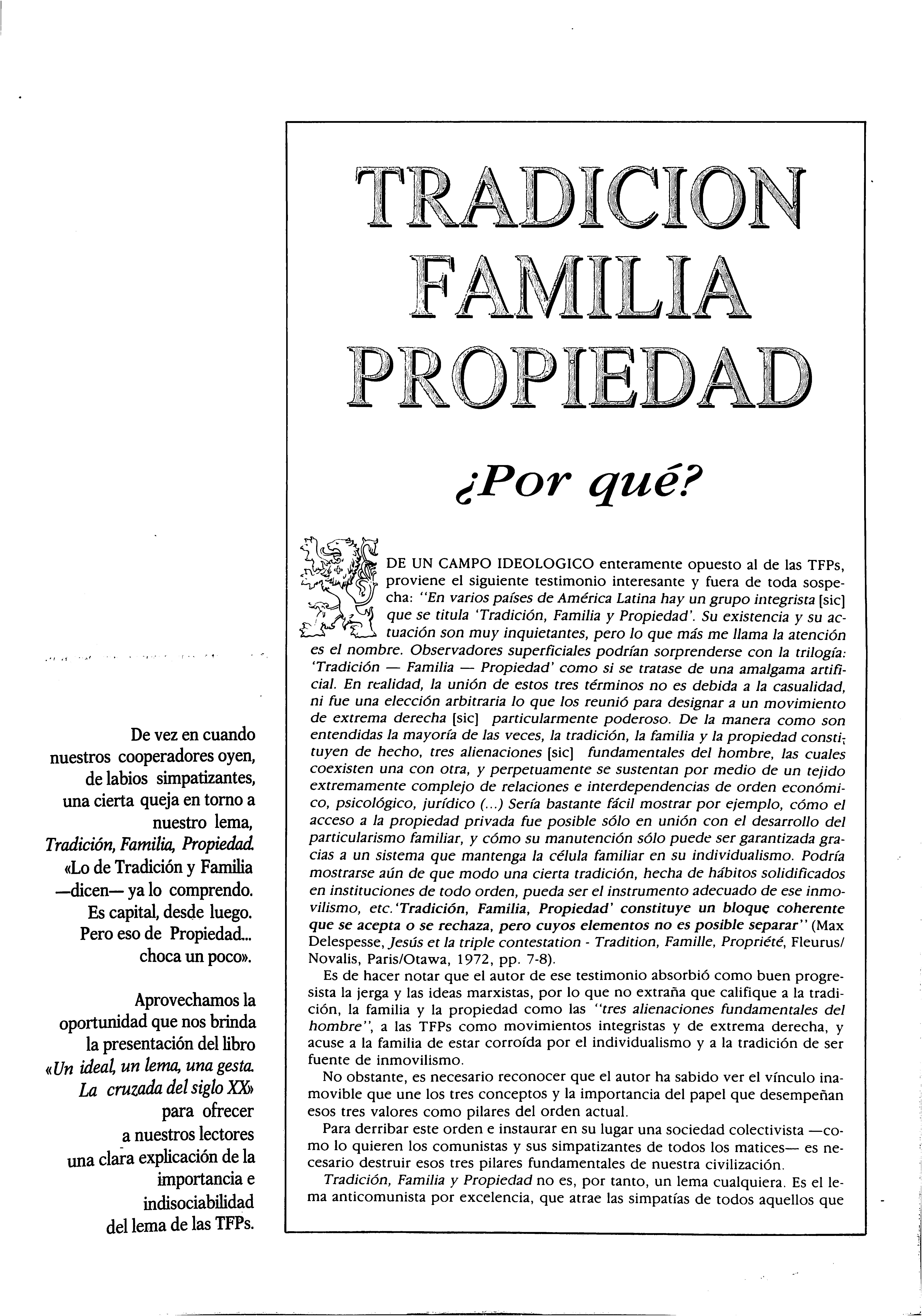 Ahora, la Sociedad Chilena de Defensa de la Tradición, Fami lia y Propiedad publicó en el periódico "Ultimas Noticias" de dicha capital, un comunicado del cual extraemos los siguientes trechos: