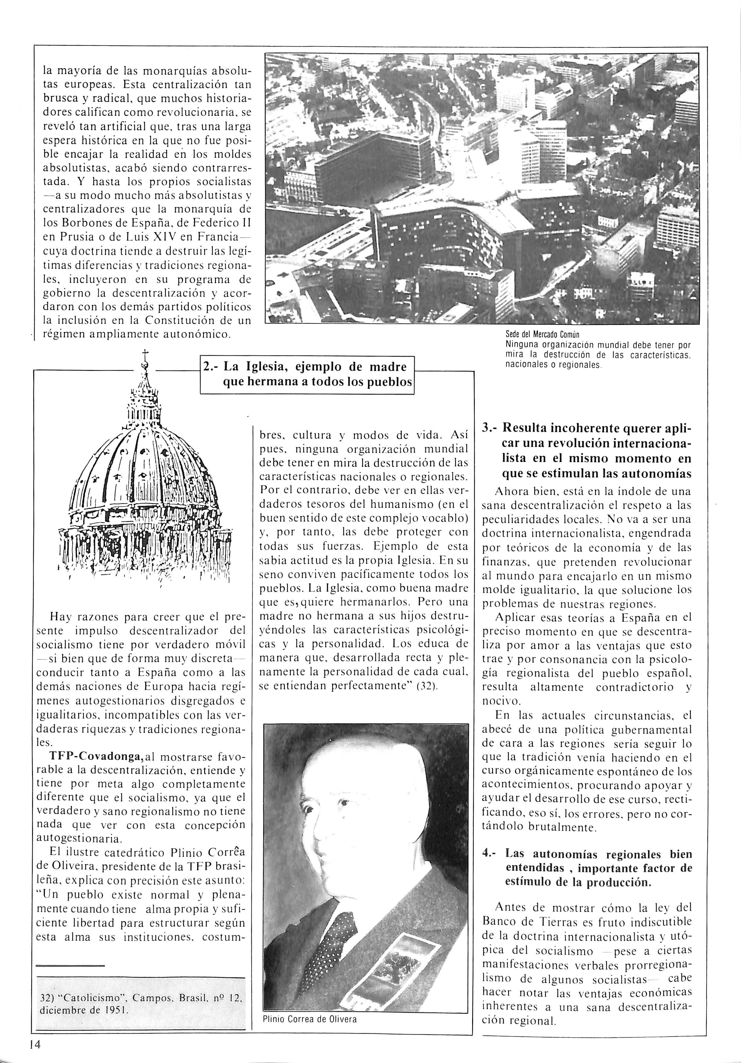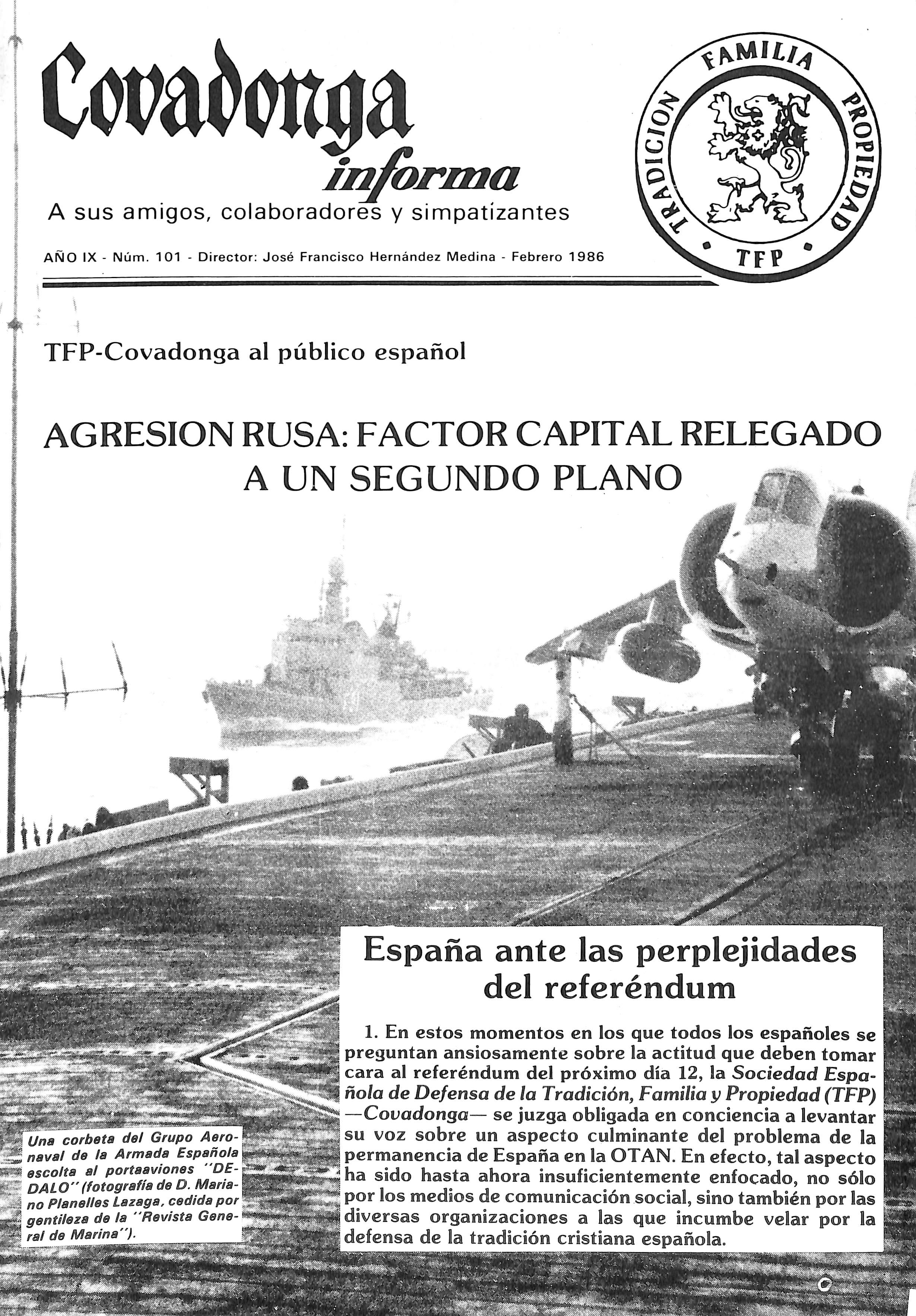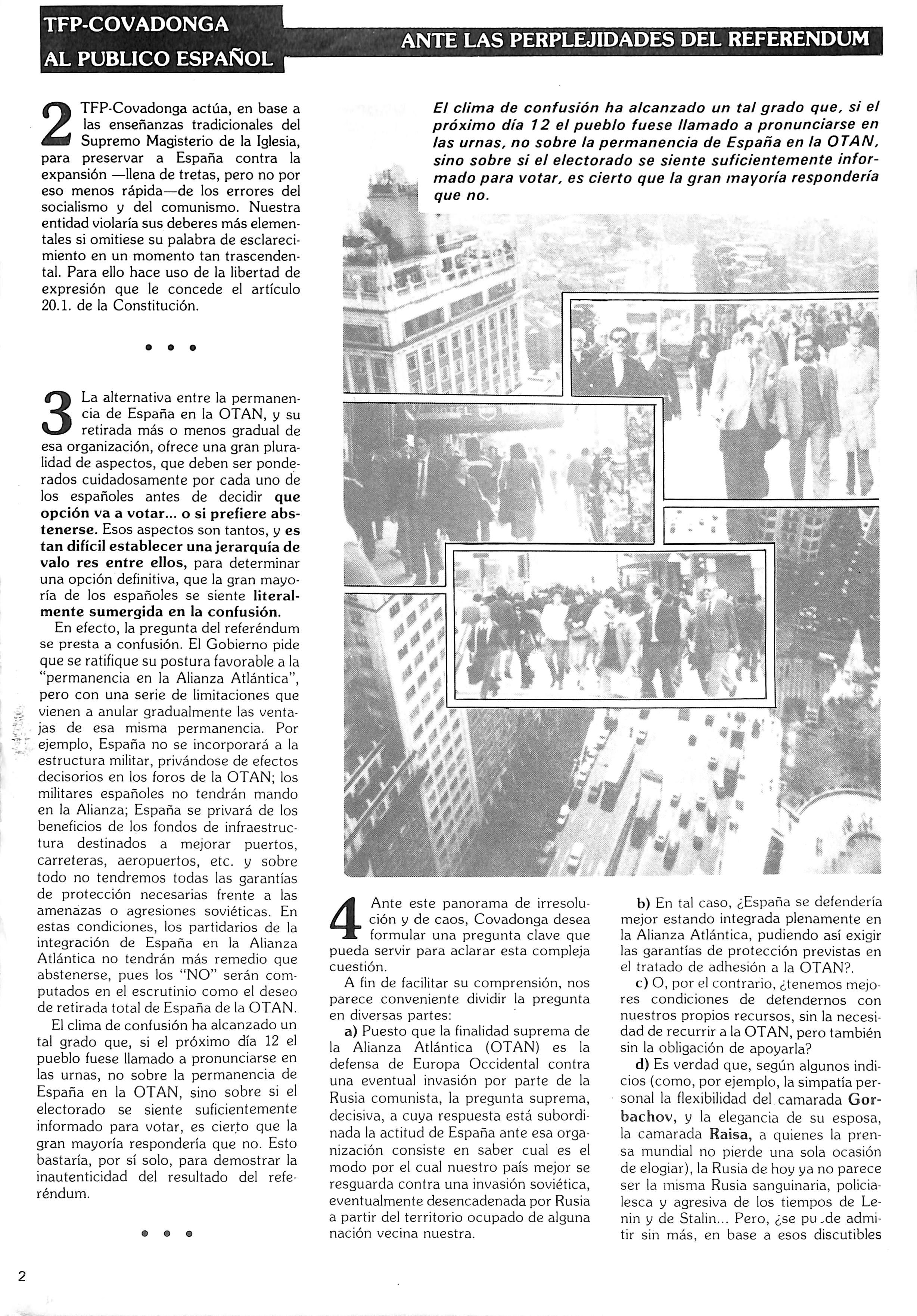 1. En estos momentos en los que todos los españoles se preguntan ansiosamente sobre la actitud que deben tomar cara al referéndum del próximo día 12, la Sociedad Espa ñola de Defensa de¡a Tradición,Familia y Propiedad(TFP) —Covadonga— se juzga obligada en conciencia a levantar su voz sobre un aspecto culminante del problema de la permanencia de España en la OTAN.En efecto,tal aspecto ha sido hasta ahora insuficientemente enfocado, no sólo por los medios de comunicación social,sino también por las diversas organizaciones a las que incumbe velar por la defensa de la tradición cristiana española.