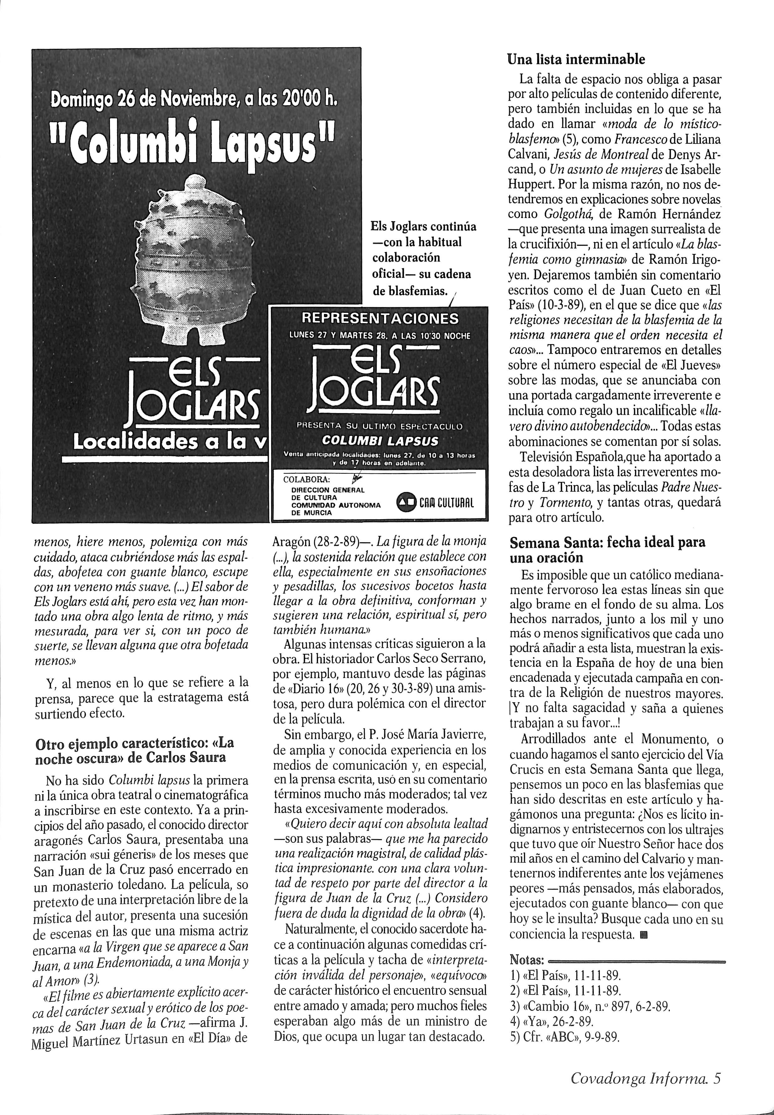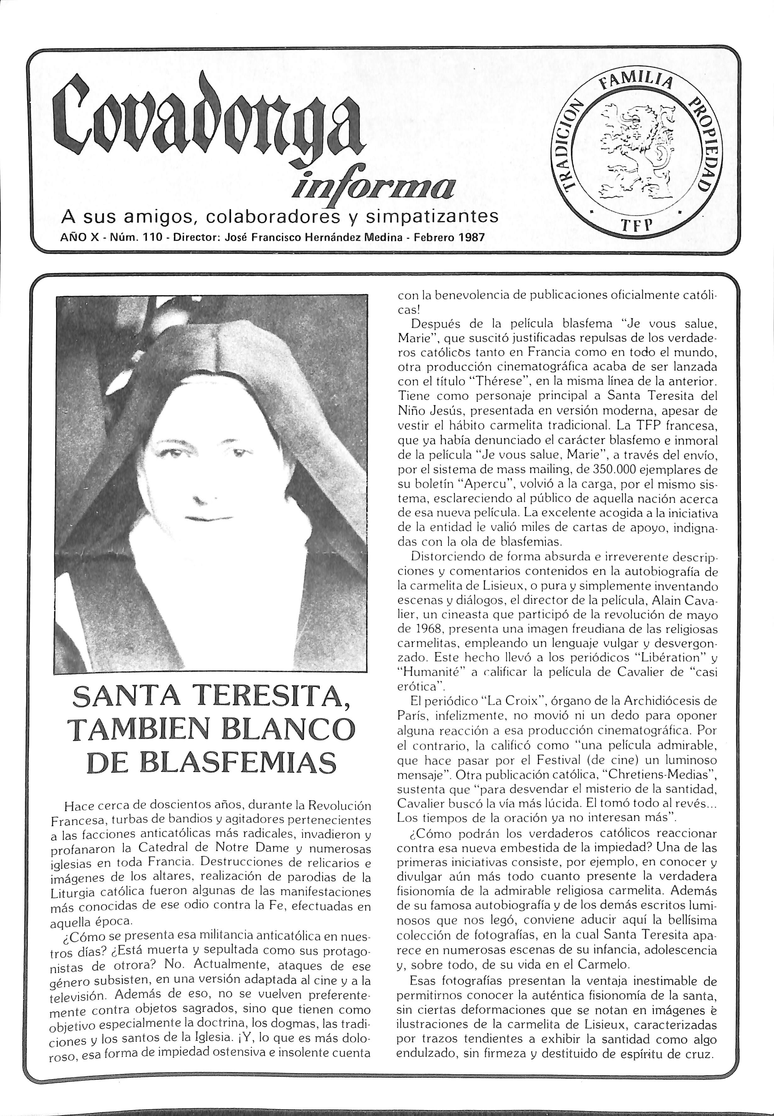 Por cierto, es seguro que V. Excia, no ignorará se trata de una película agresivamente blasfema e inmoral, cuya pre sentación en la Ciudad Eterna fue considerada de tal manera ultrajante a la Religión Católica, que motivó especial repara ción, públicamente hecha por S.S. Juan Pablo II en acto difundido por el mundo entero a través de la Radio Vaticana. Además, en todos los países en que —como en Francia y en Italia —gobiernos socialistas han autorizado esa infeliz proyección, viene siendo objeto de vehementes protestas por parte de la flor y nata de la opinión pública.