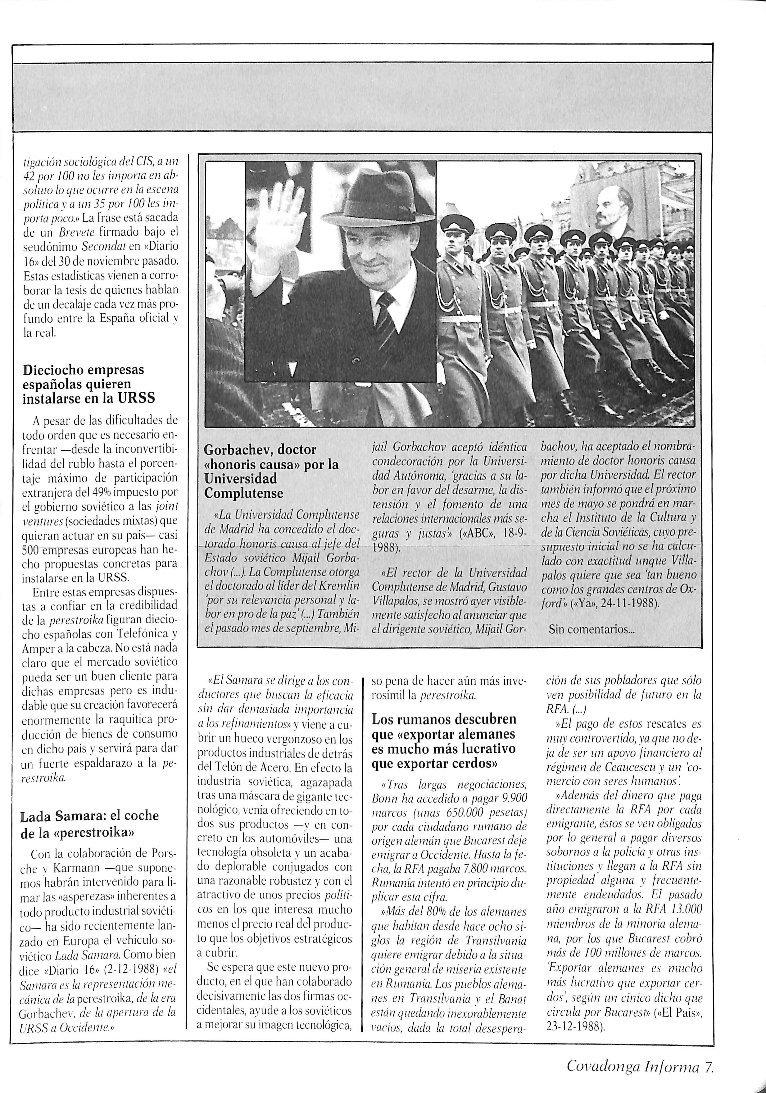 «La premura con que se negociaron los acuerdos entre España y la Unión Soviética, en la reciente visita de Gorbachov,forzó el aplazamiento de la discusión del caso cubano contemplado en los borradores de la agenda. La propuesta soviética prevé que España aumente su ayuda económica al régimen castrista para paliar la disminución de las aportaciones de Moscú, que afronta su propia crisis económica».(Cambio 16,19-11-90).