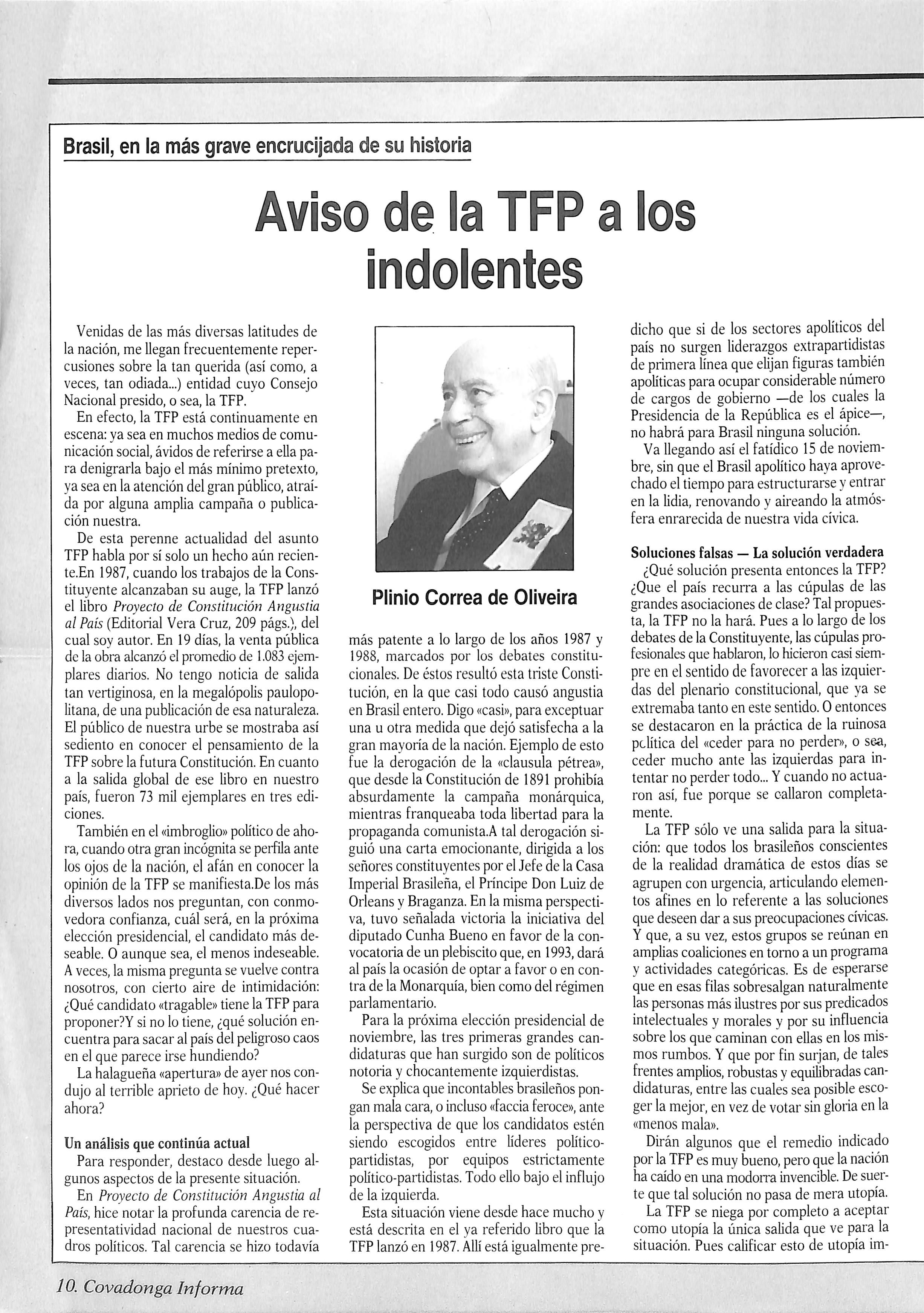 Plinio Correa de Oüveira ^nte tal eventualidad, el profesor Plinio Correa de Oliveira, Presidente del Consejo Nacional de la TFP, envió al Presidente del Gobierno, José Sarney y al Ministro de Justicia, Fernando Lyra, el siguiente telegrama: