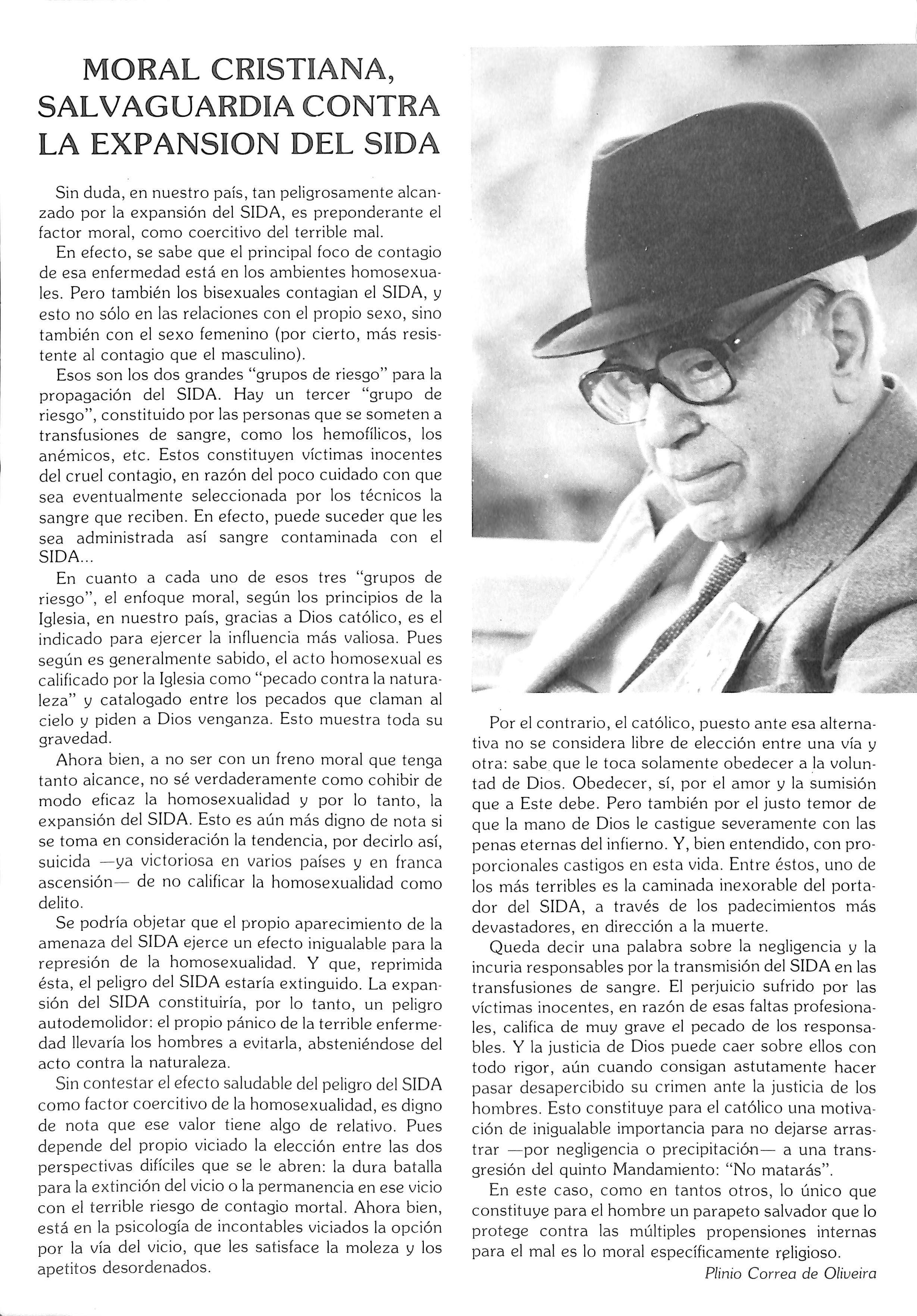 En todo el mundo, sin embargo, los órganos de prensa han recomendado una serie de precauciones farisáicas y superficiales para evitar el SIDA. Es sintomático, sin embargo, que la prensa, incluyendo la española, no indique la profilaxia más eficaz contra la enfermedad: la abstención de relaciones sexuales ilícitas y,"a fortiori", de relaciones antinaturales.