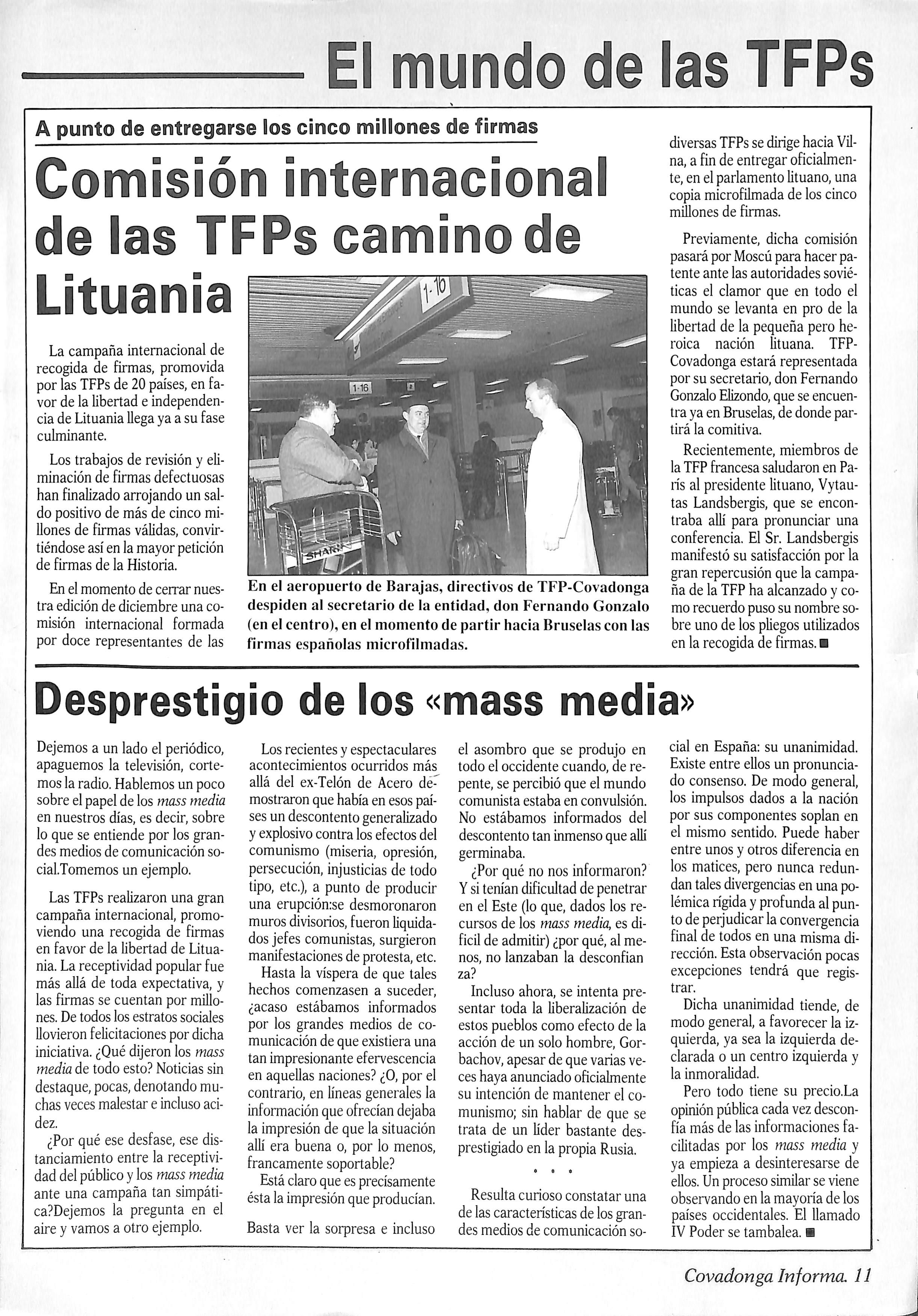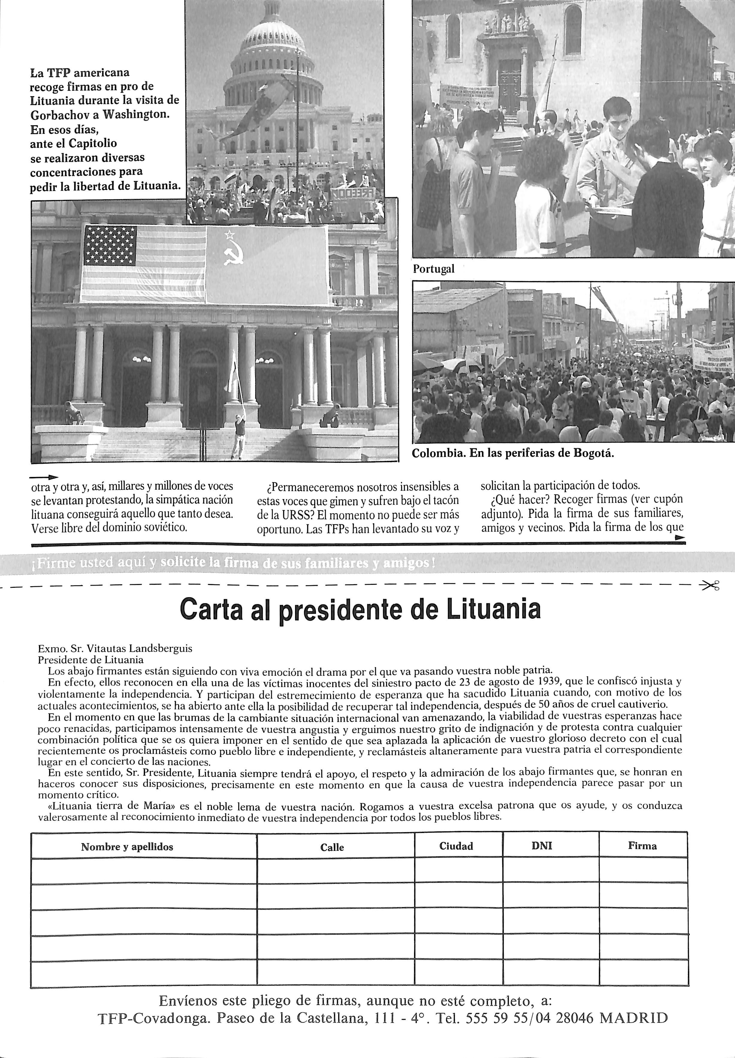 Las TFPs realizaron una gran campaña internacional, promo viendo una recogida de firmas en favor de la libertad de Litua nia. La receptividad popular fue más allá de toda expectativa, y las firmas se cuentan por millo nes. De todos los estratos sociales llovieron felicitaciones por dicha iniciativa. ¿Qué dijeron los mass media de todo esto? Noticias sin destaque,pocas,denotando mu chas veces malestar e incluso aci dez.