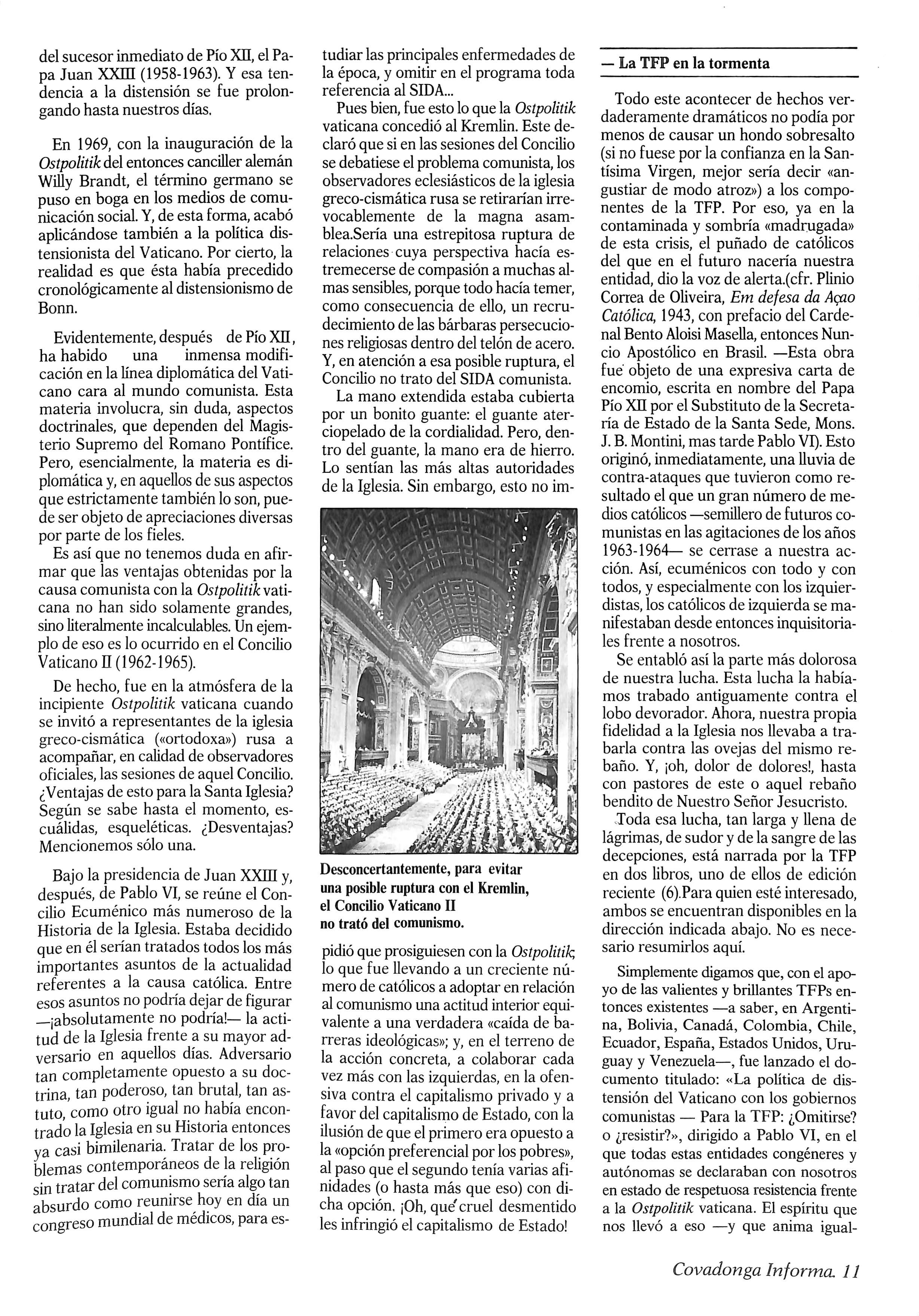 Lo más interesante no es analizar este o aquel hecho aislado, en el que la tensión se manifieste con particular efervescencia, sino analizar la causa profunda y subyacente a esta tensión. En el fondo, el problema no es entre el Episcopado y el Gobierno. La tensión entre estas instituciones es reflejo de la división entre los católicos. Unos, fieles a las enseñanzas tradicionales de la Iglesia, saben que el comunismo es intrínsecamente per verso, y que no se püede colaborar con el en ningún campo.
