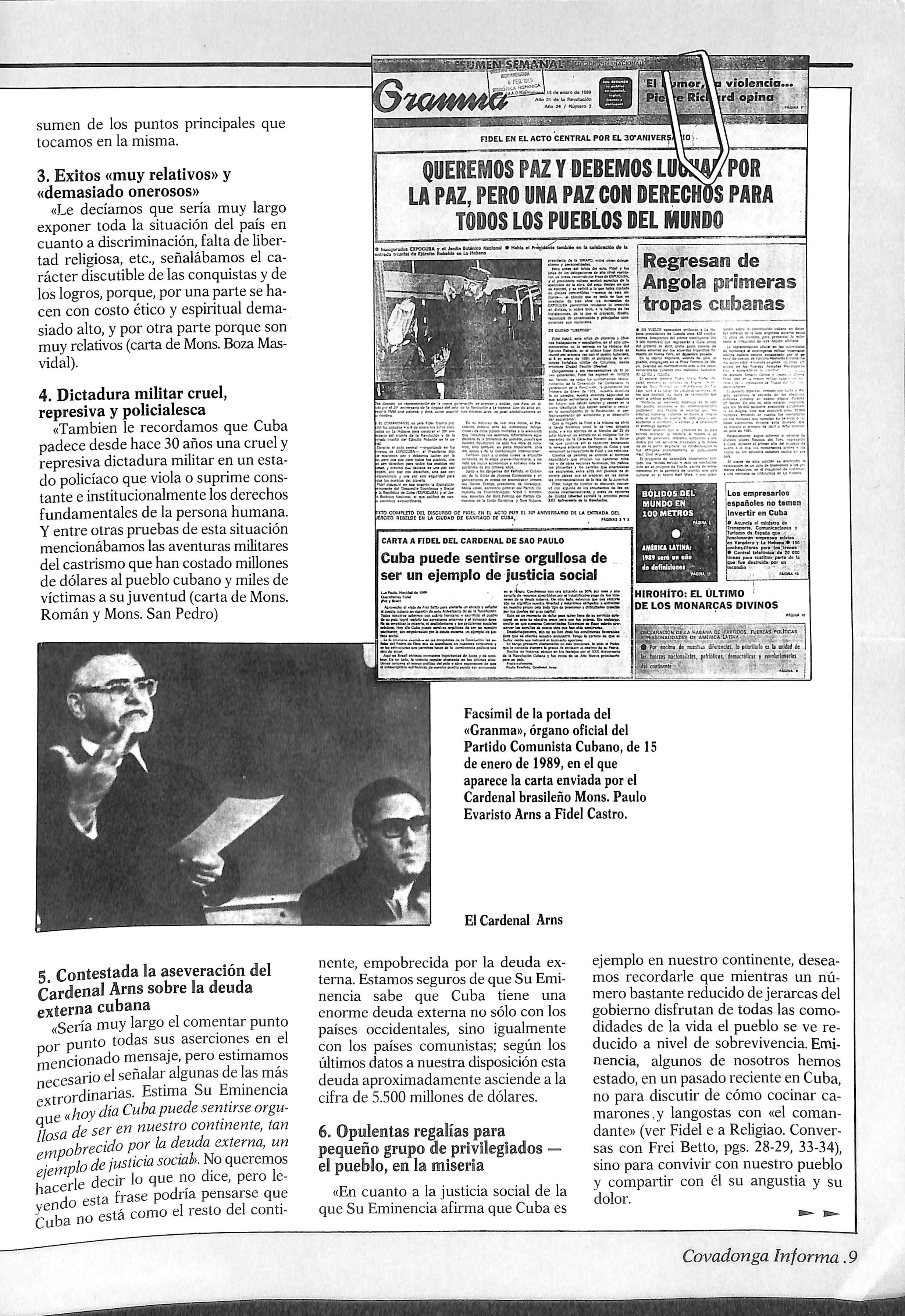 brasileño, Paulo Evaristo Arns, con motivo del treinta aniversario de la revolución cubana, envió una carta al «queridísimo Fidel» en la que decía: «Cuba puede sentirse orgullosa de ser un ejemplo de justicia social.(...) La fe cristiana descubre en las conquistas de la Revolución las señales del Reino de Dios...».